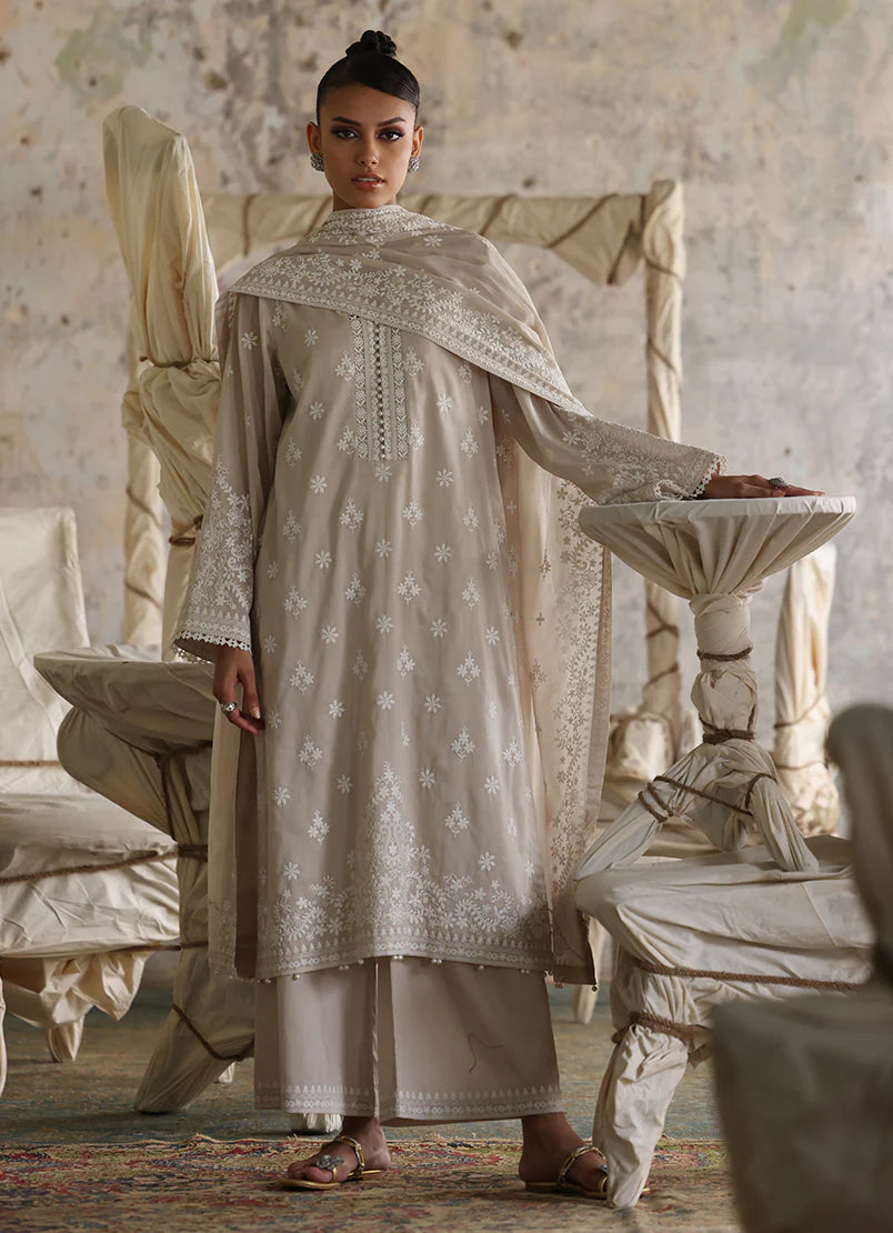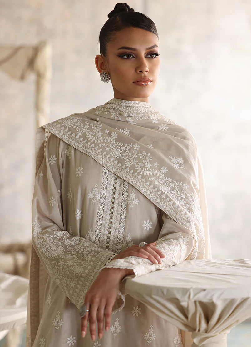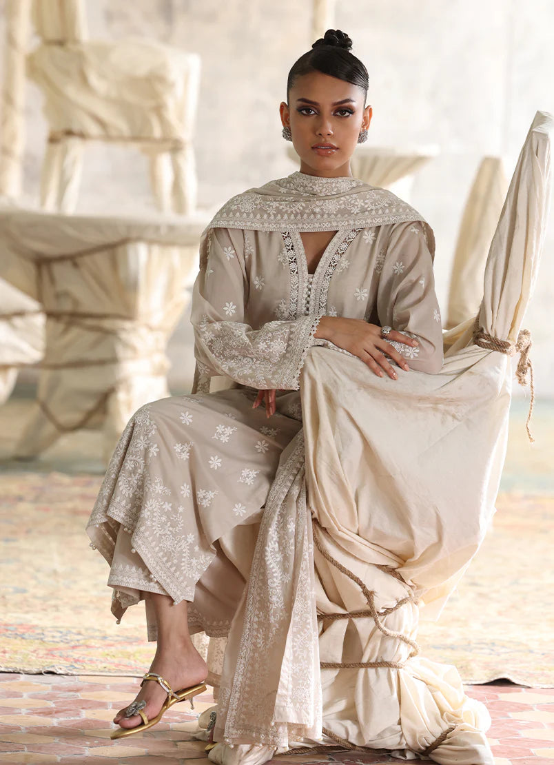 The Chikankari 3-Piece Embroidered Suit in Beige from our Endless Summer '24 Collection. A pure cotton ensemble featuring a V-neckline with lace embellishments, full-length embroidered sleeves, and intricate lace embellishment on sleeves.​