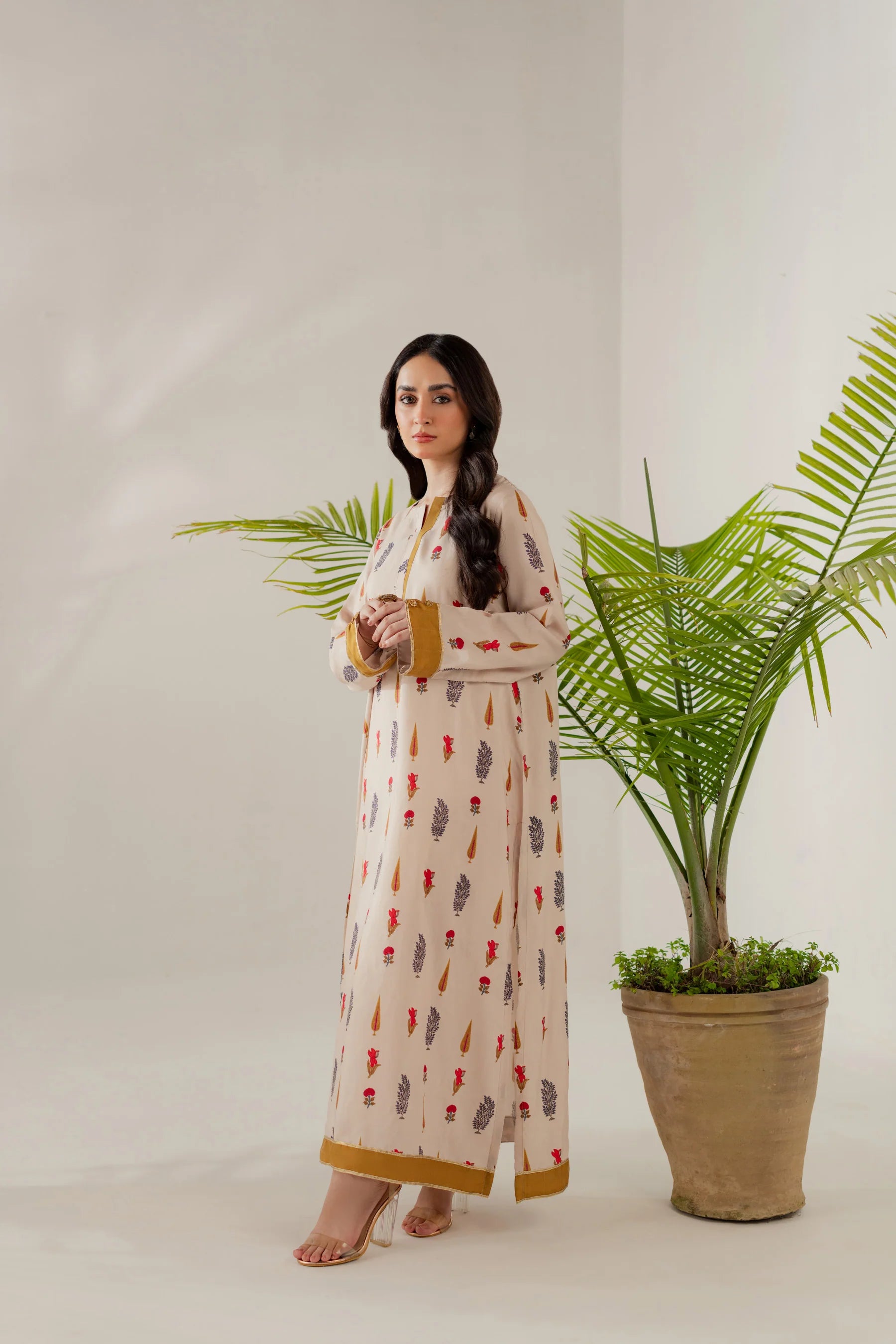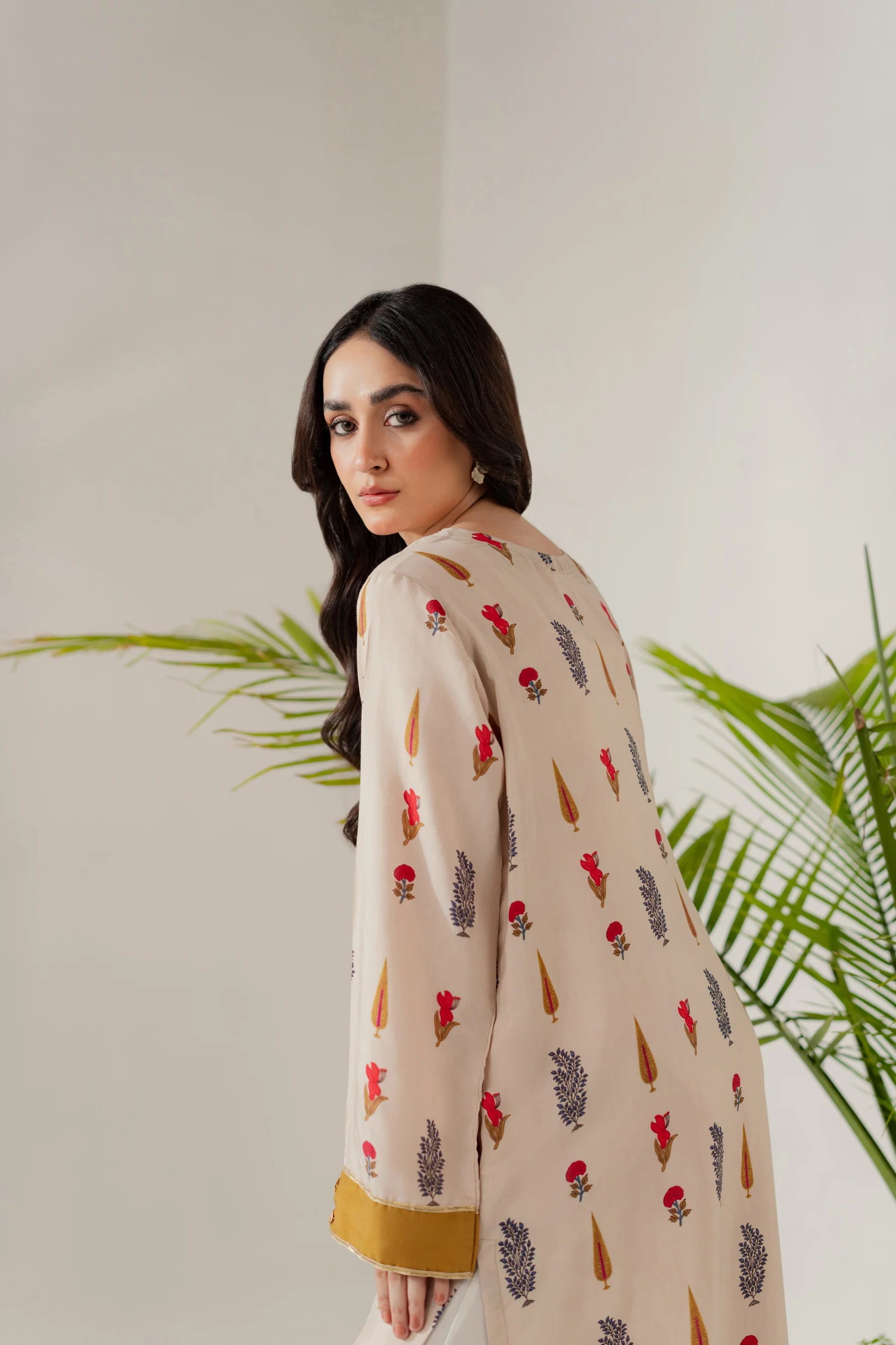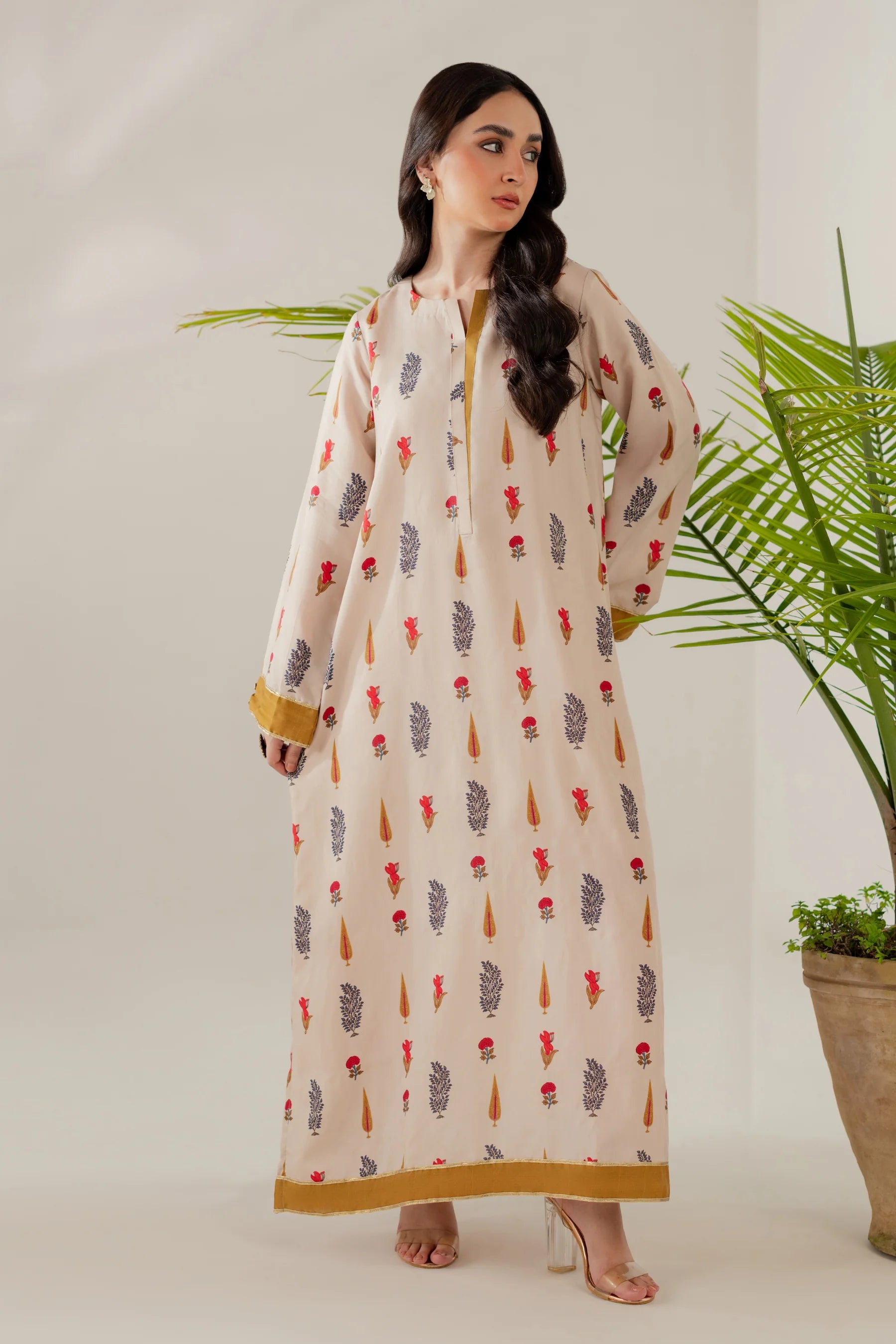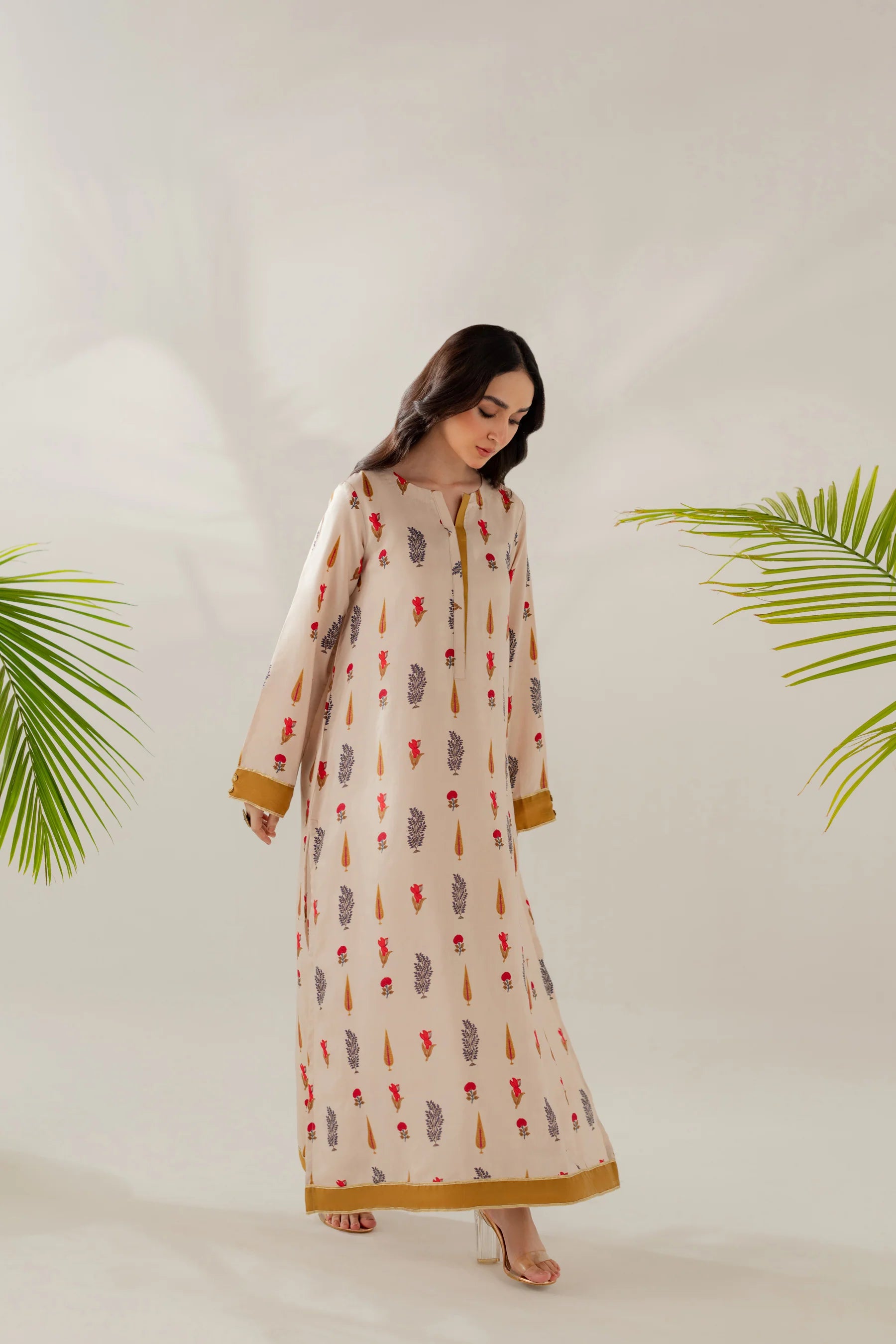 Shirt: Printed viscose with gota details (length 50 inches)