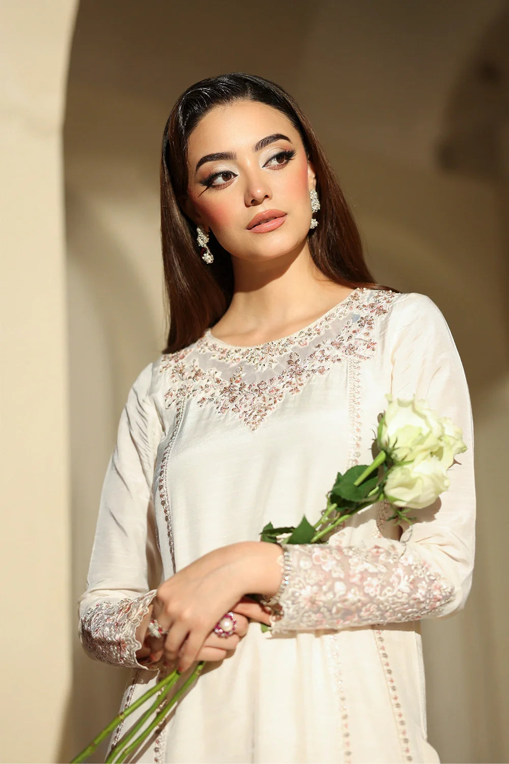 A clean, timeless white outfit crafted in premium raw silk, featuring an elegant A-line shirt paired with straight trousers. The A-line silhouette adds a subtle, graceful flare, while the straight trousers keep the look polished and refined. A perfect choice for a fresh, minimal, and effortlessly sophisticated style