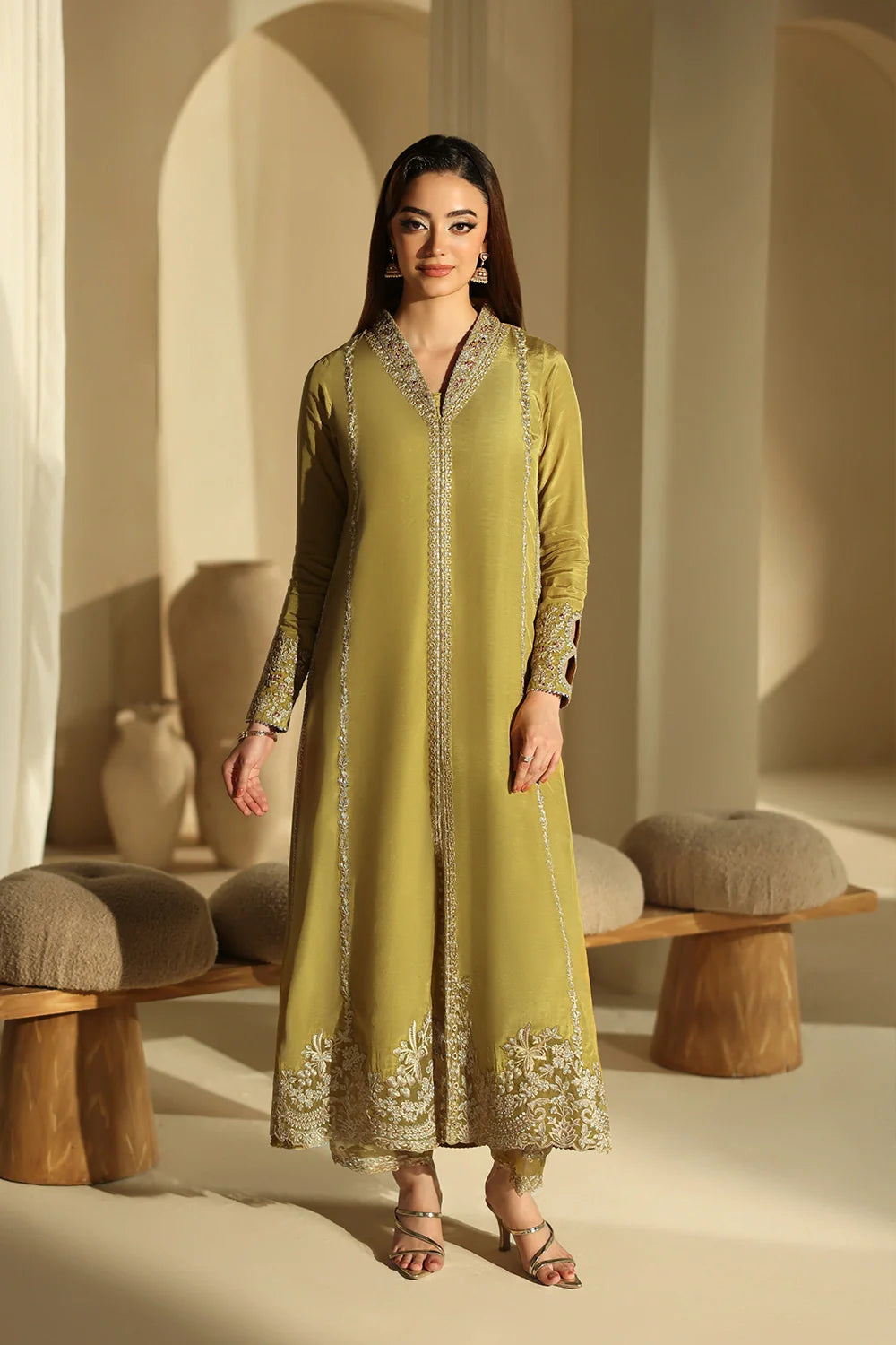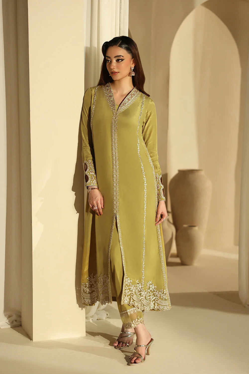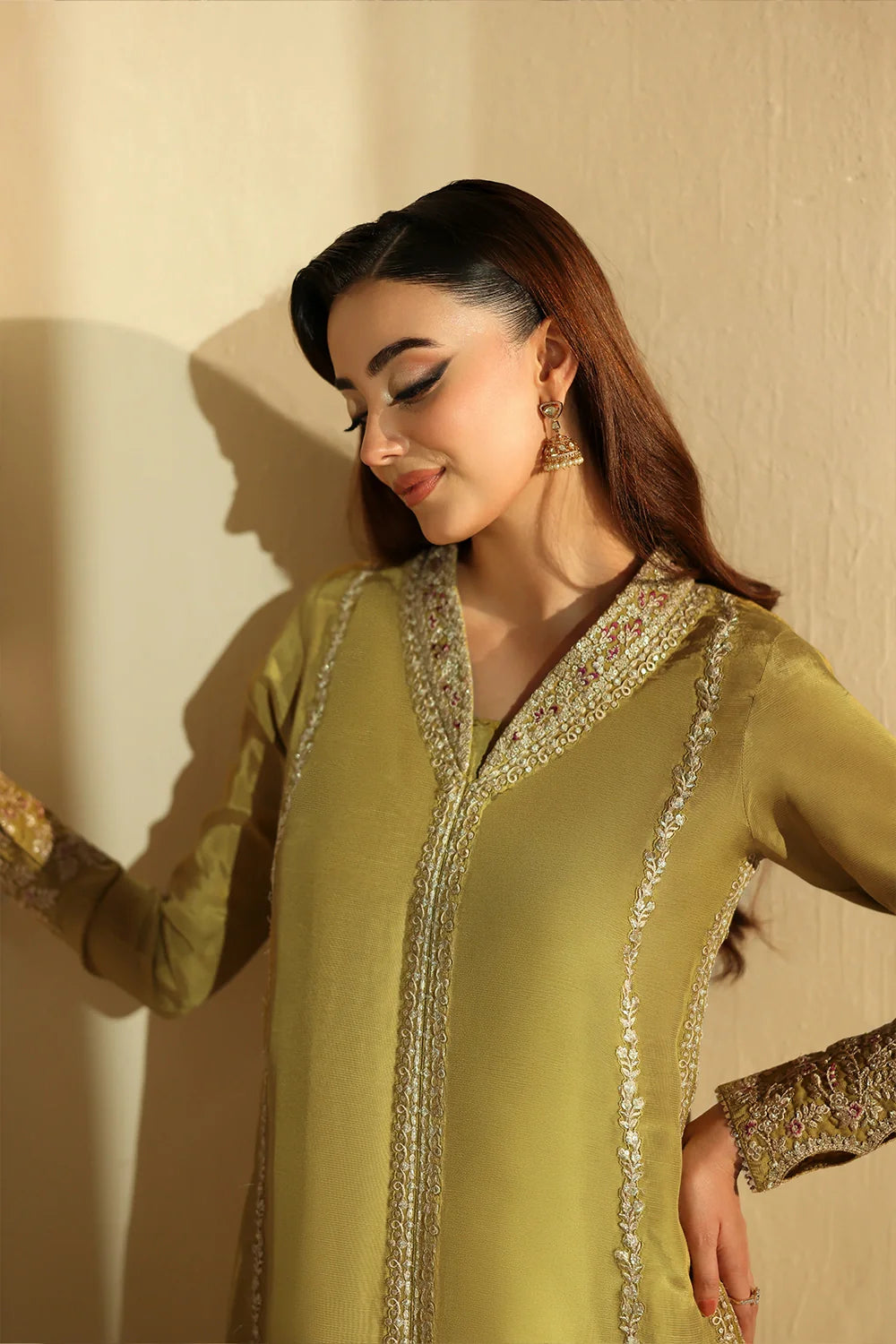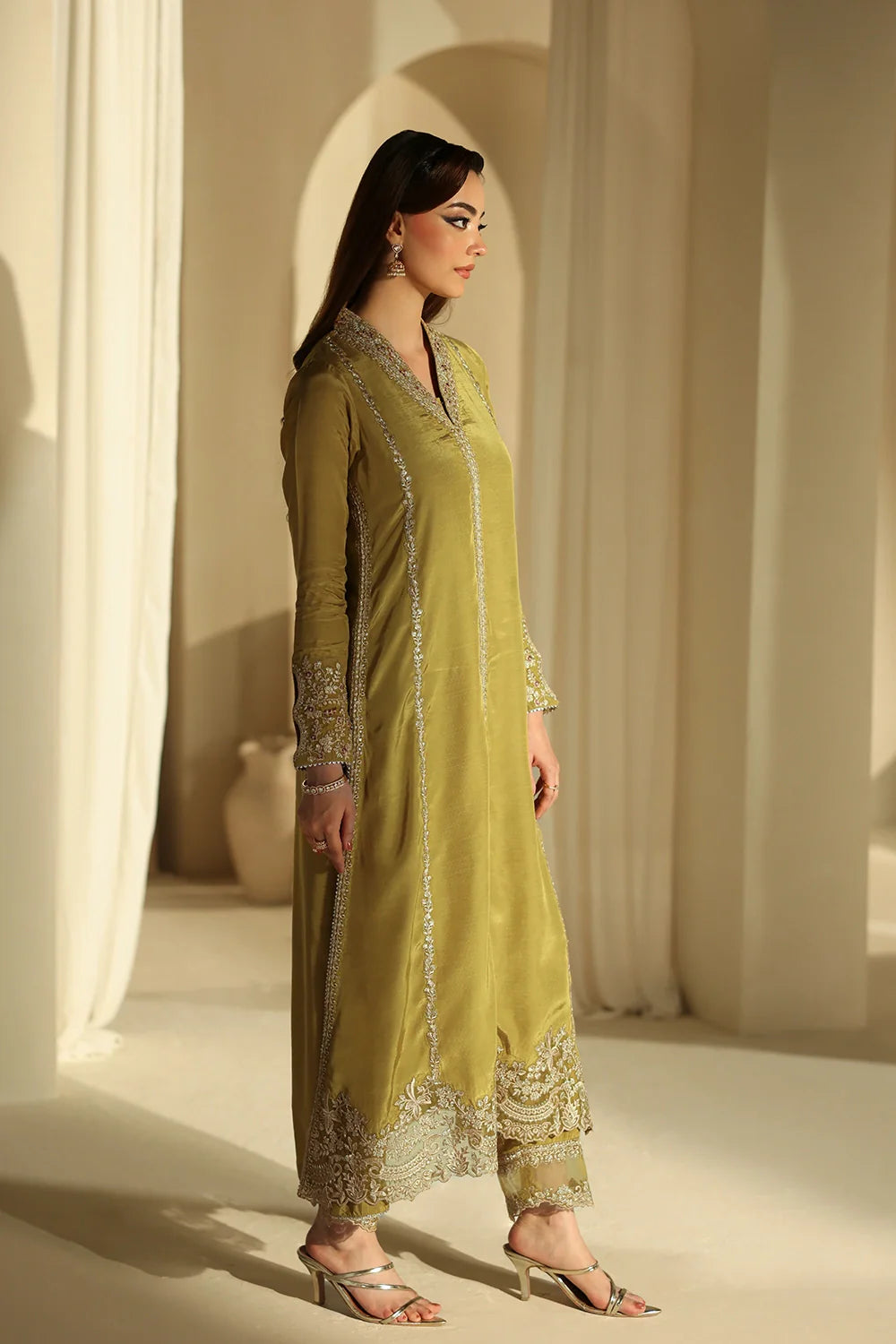 A refreshing dhani green ensemble crafted in premium raw silk, featuring a sleek straight shirt paired with tailored straight pants. The smooth raw silk finish adds a refined touch, while the minimal silhouette keeps the look effortlessly elegant. A versatile everyday outfit with a polished modern feel.