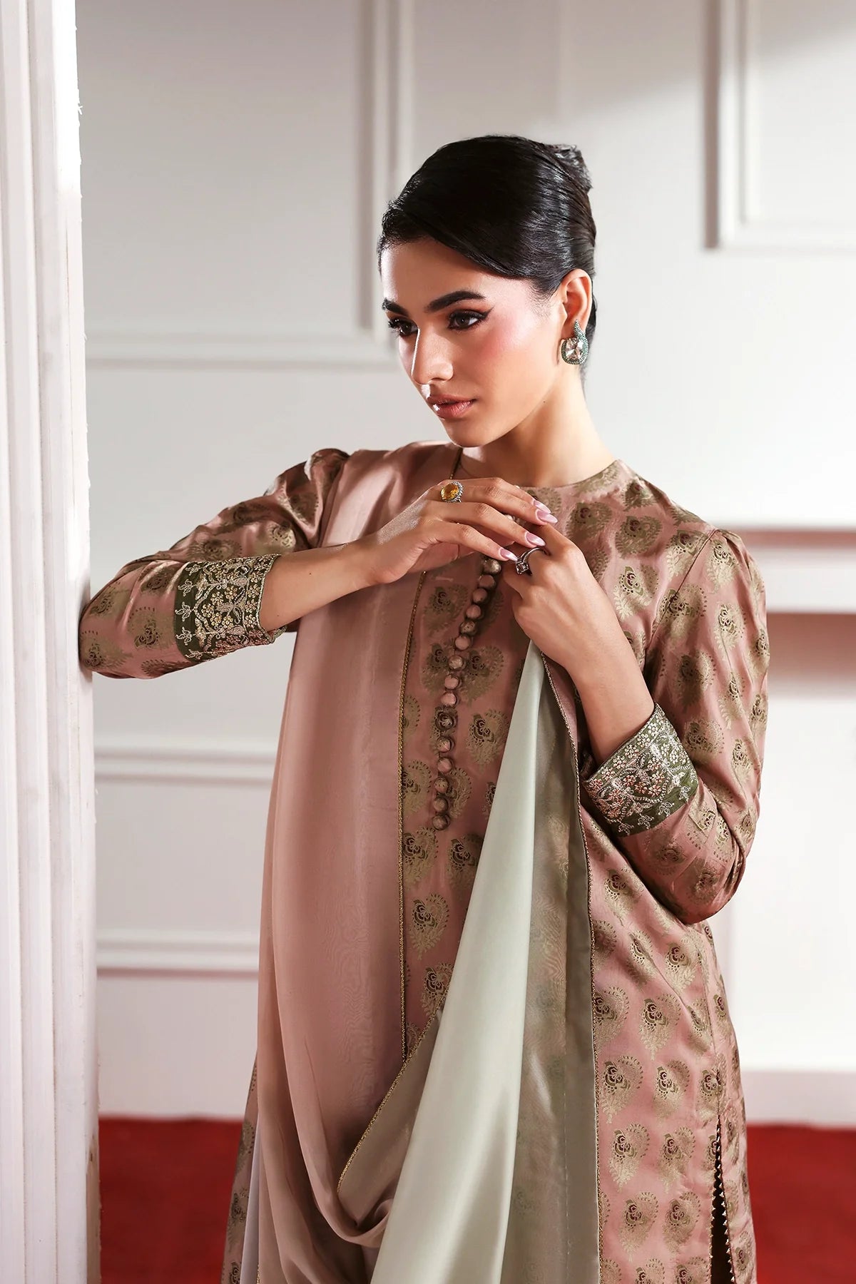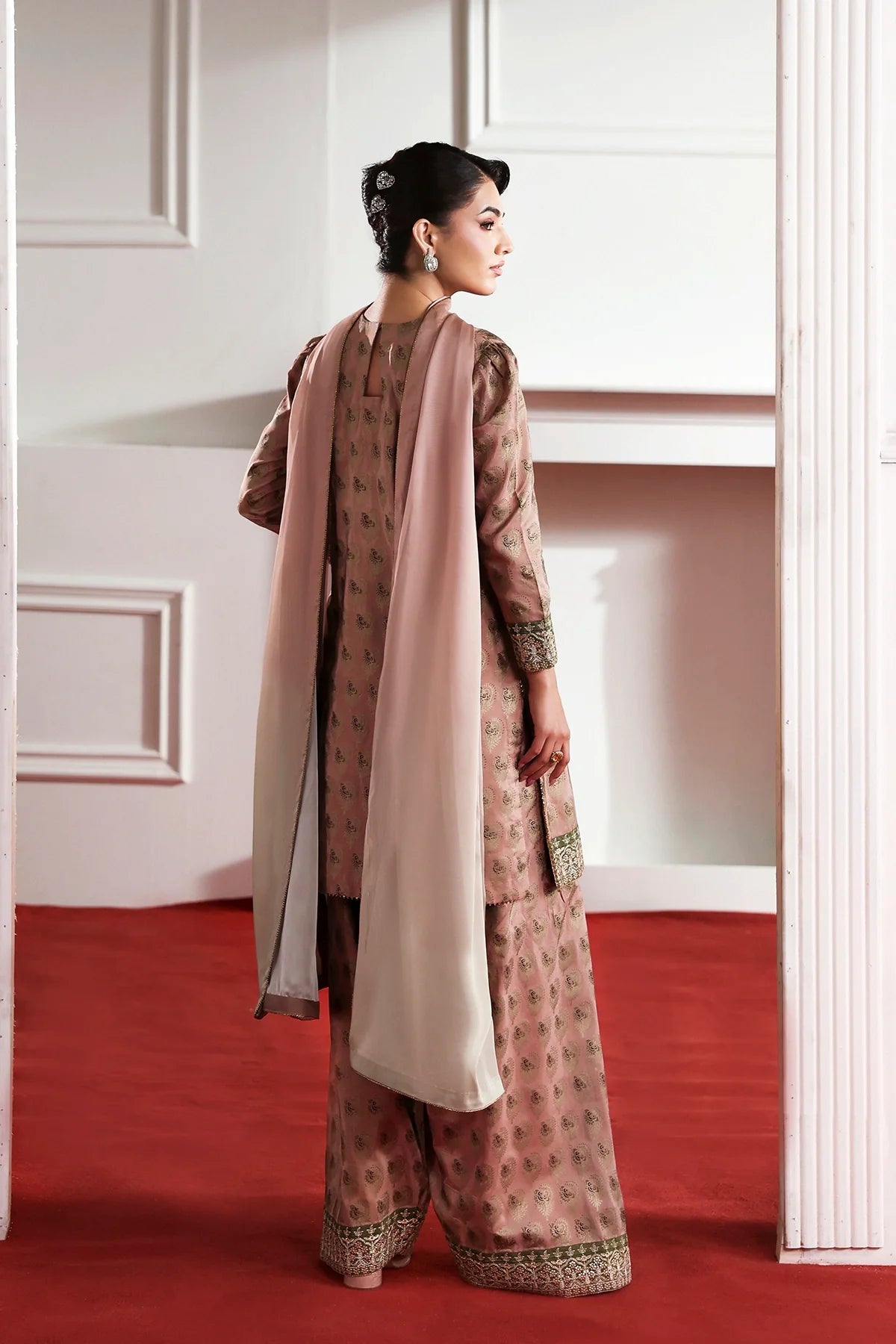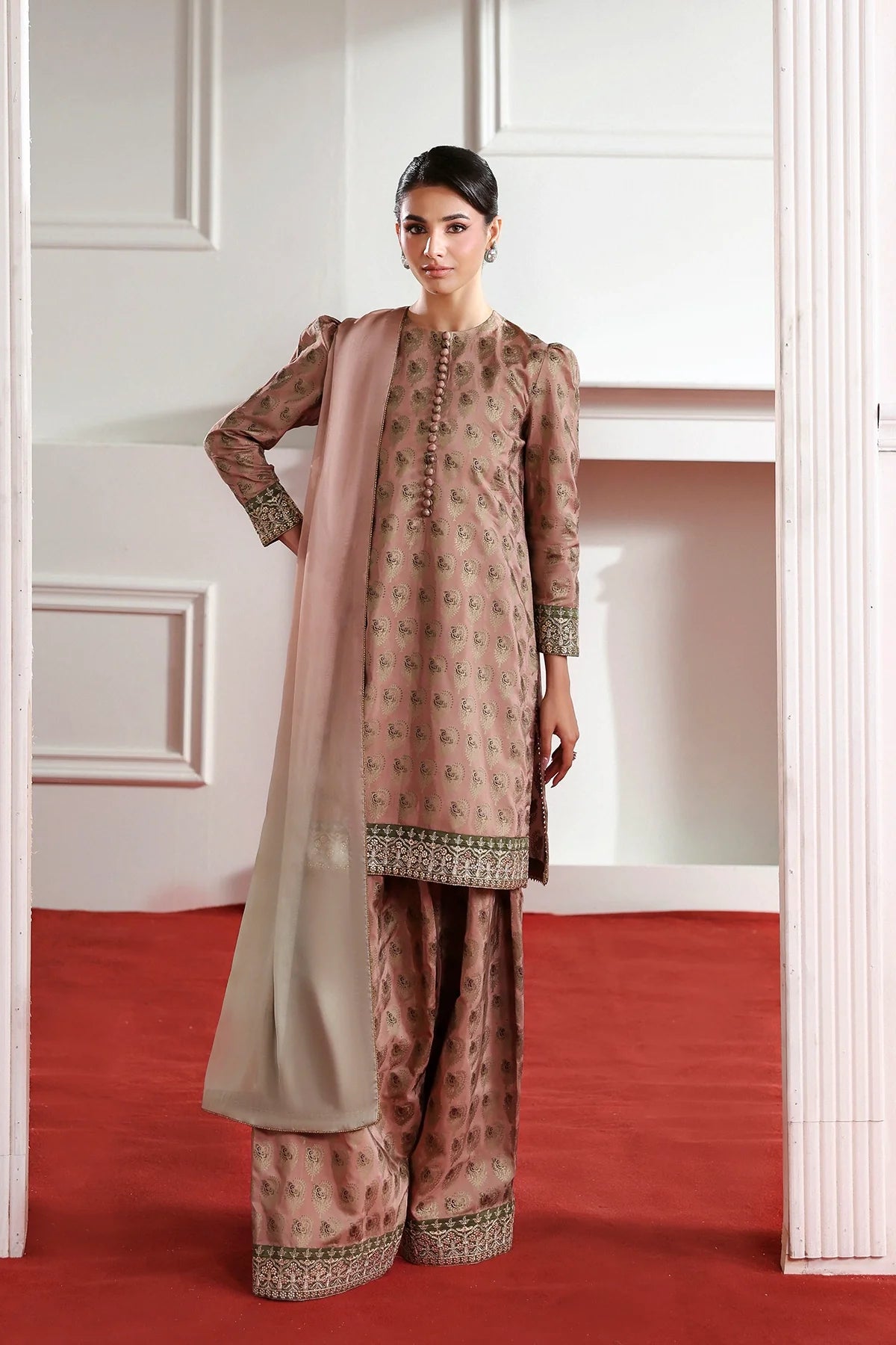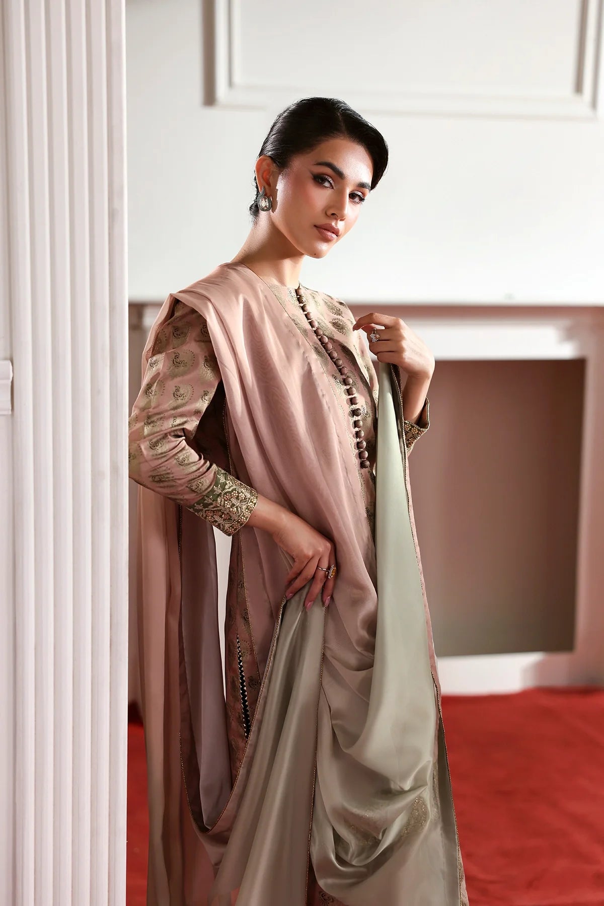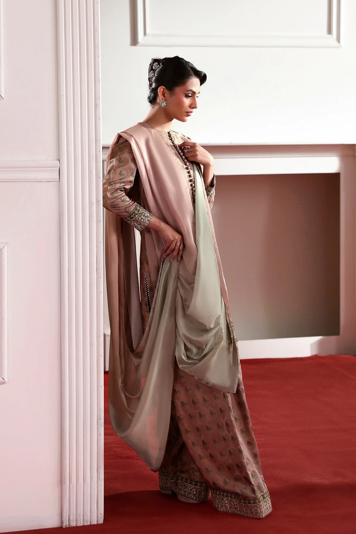 A classy silk screen-printed farshi shalwar kameez paired with a two-tone silk dupatta is an elegant choice for Eid.