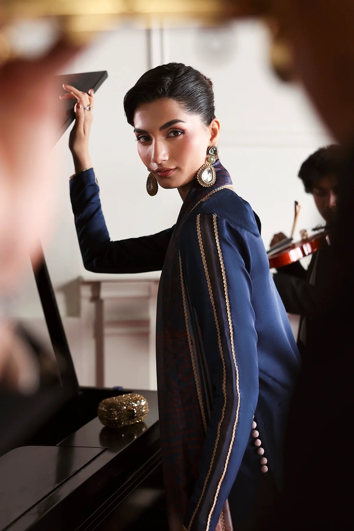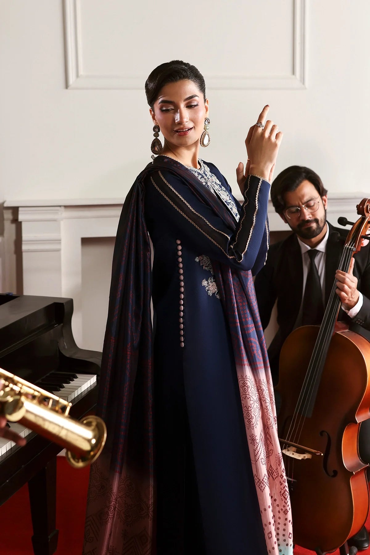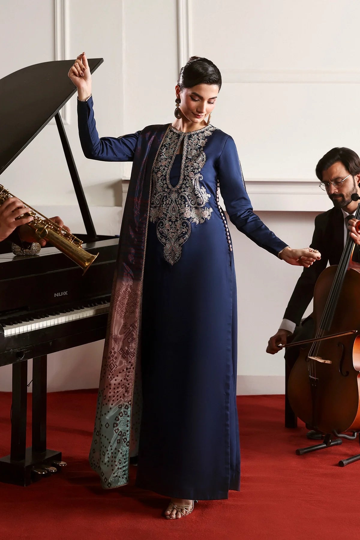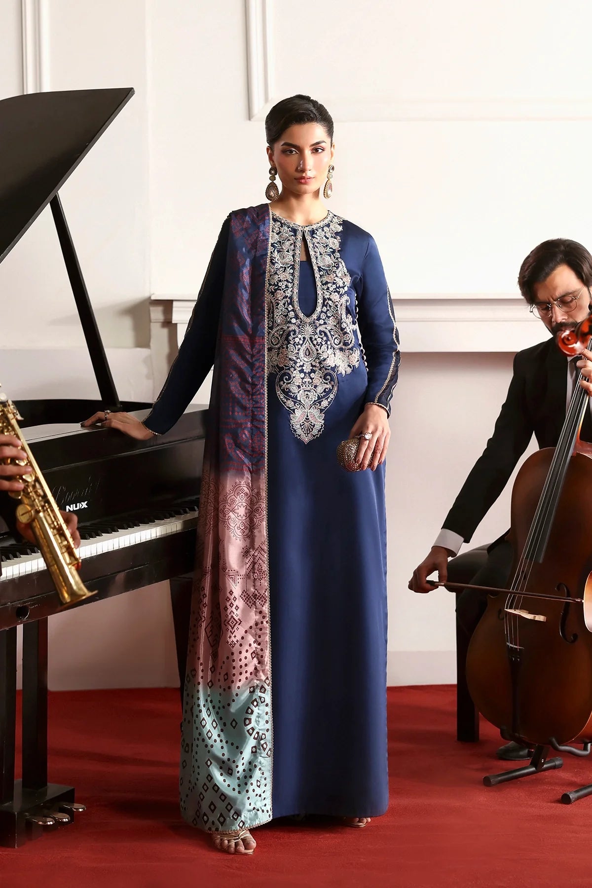 A rich blue shirt featuring an elegant embroidered neckline in a beautiful color palette, paired with a chunri ombré dupatta and plain trousers for a timeless, refined look.