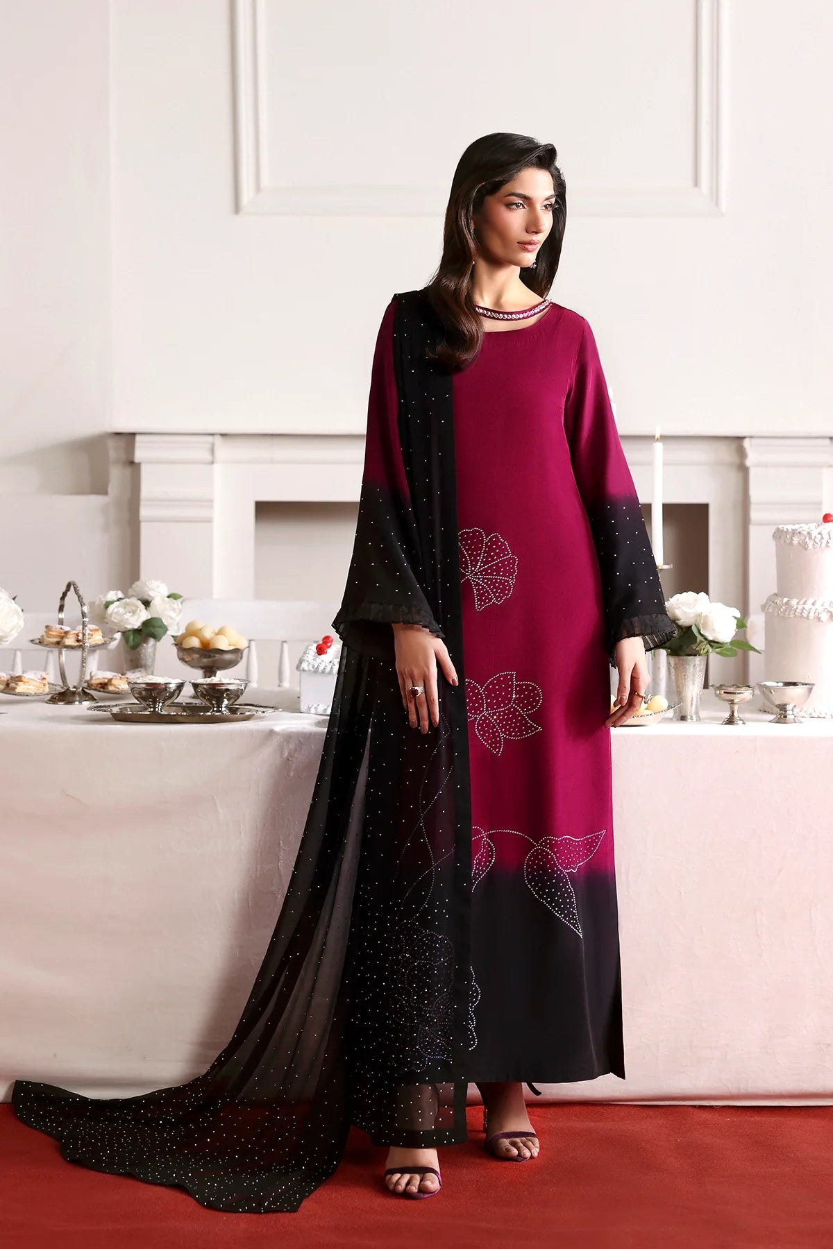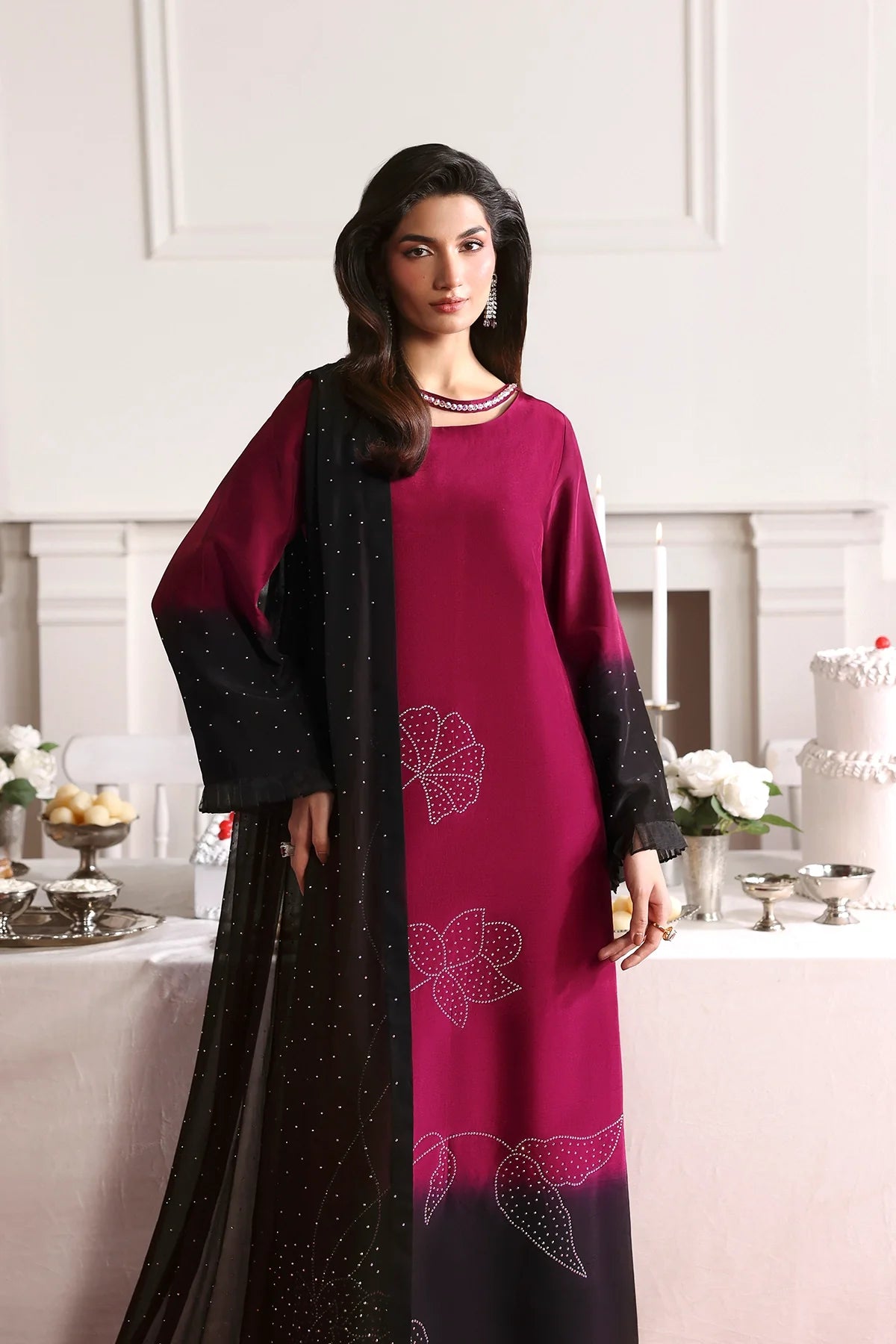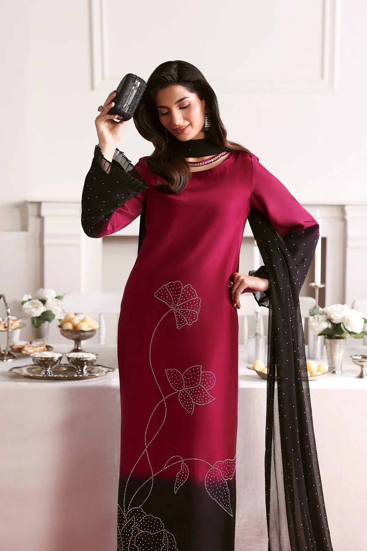 An elegant two-tone silk outfit adorned with delicate rhinestone embellishments, paired with a stone-sprayed chiffon dupatta and plain black trousers for a refined, graceful look.