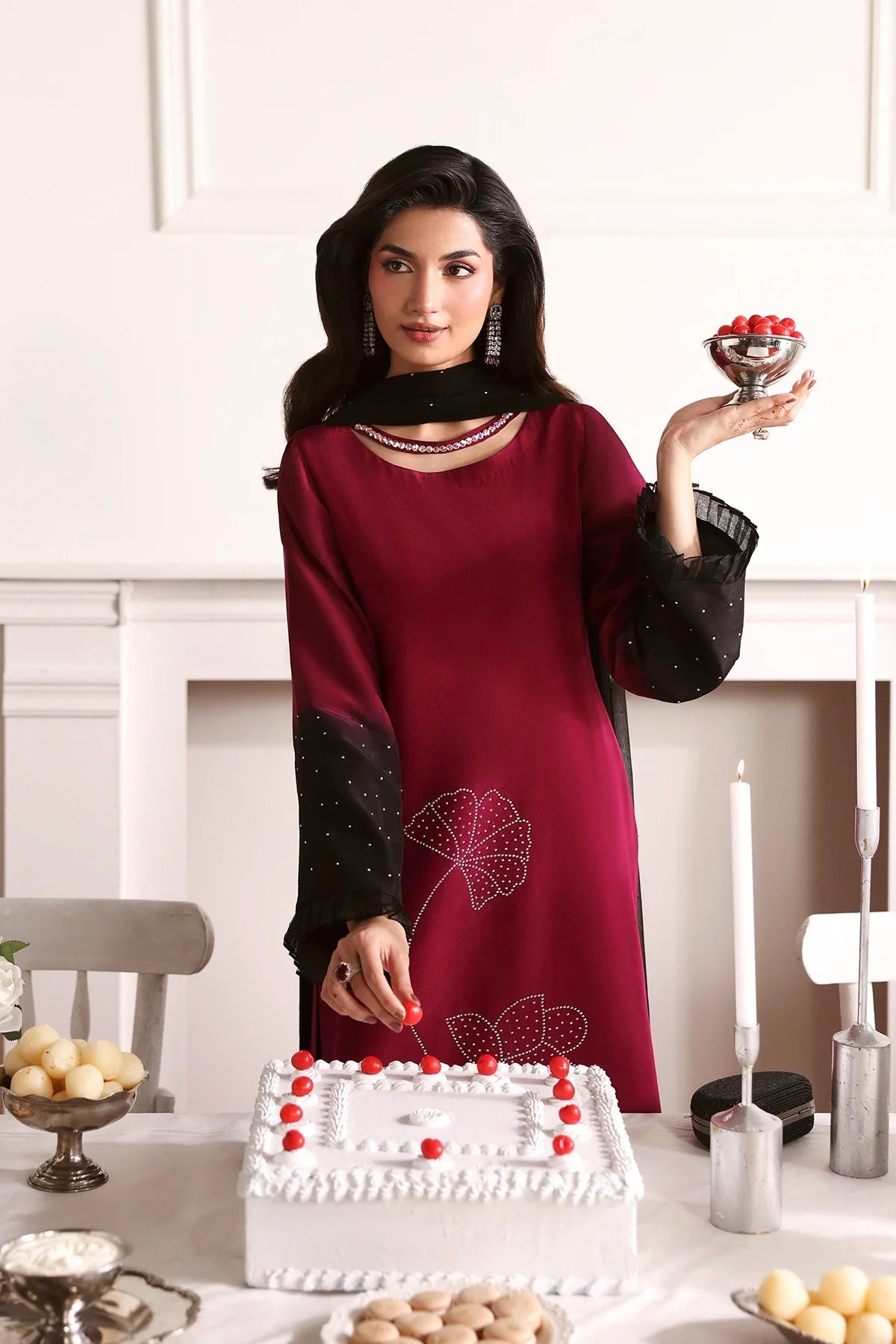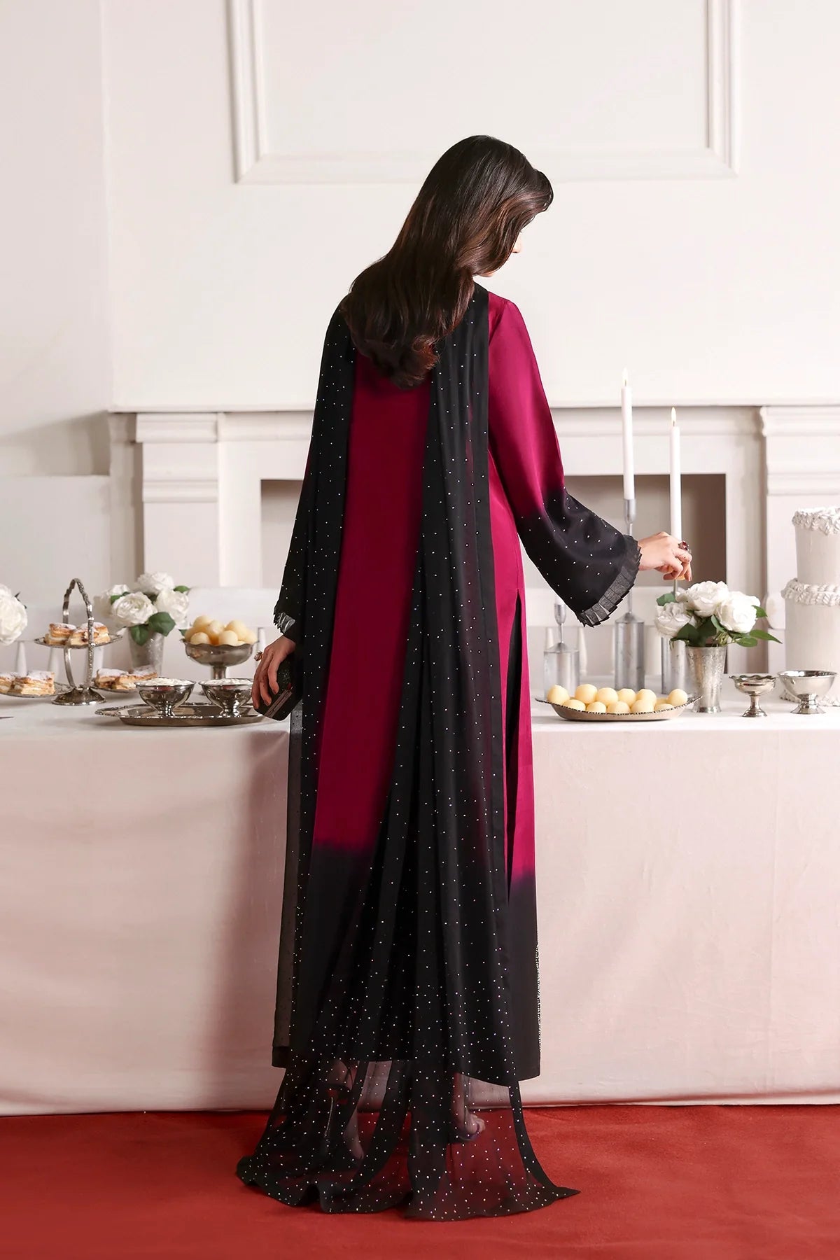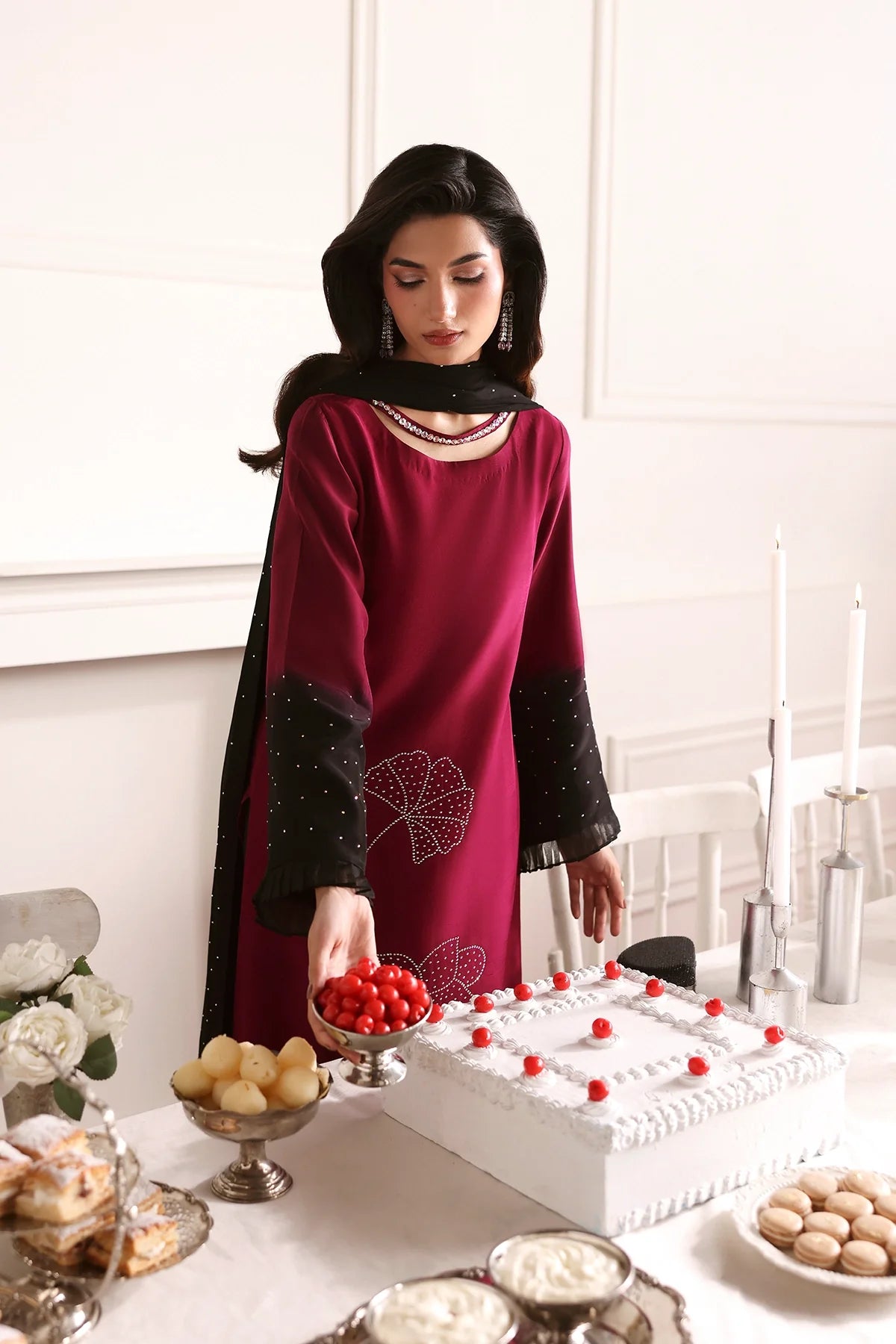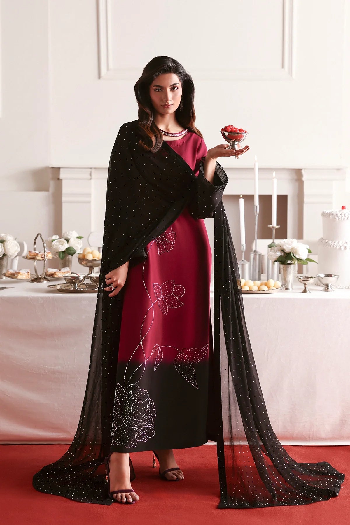 An elegant two-tone silk outfit adorned with delicate rhinestone embellishments, paired with a stone-sprayed chiffon dupatta and plain black trousers for a refined, graceful look.