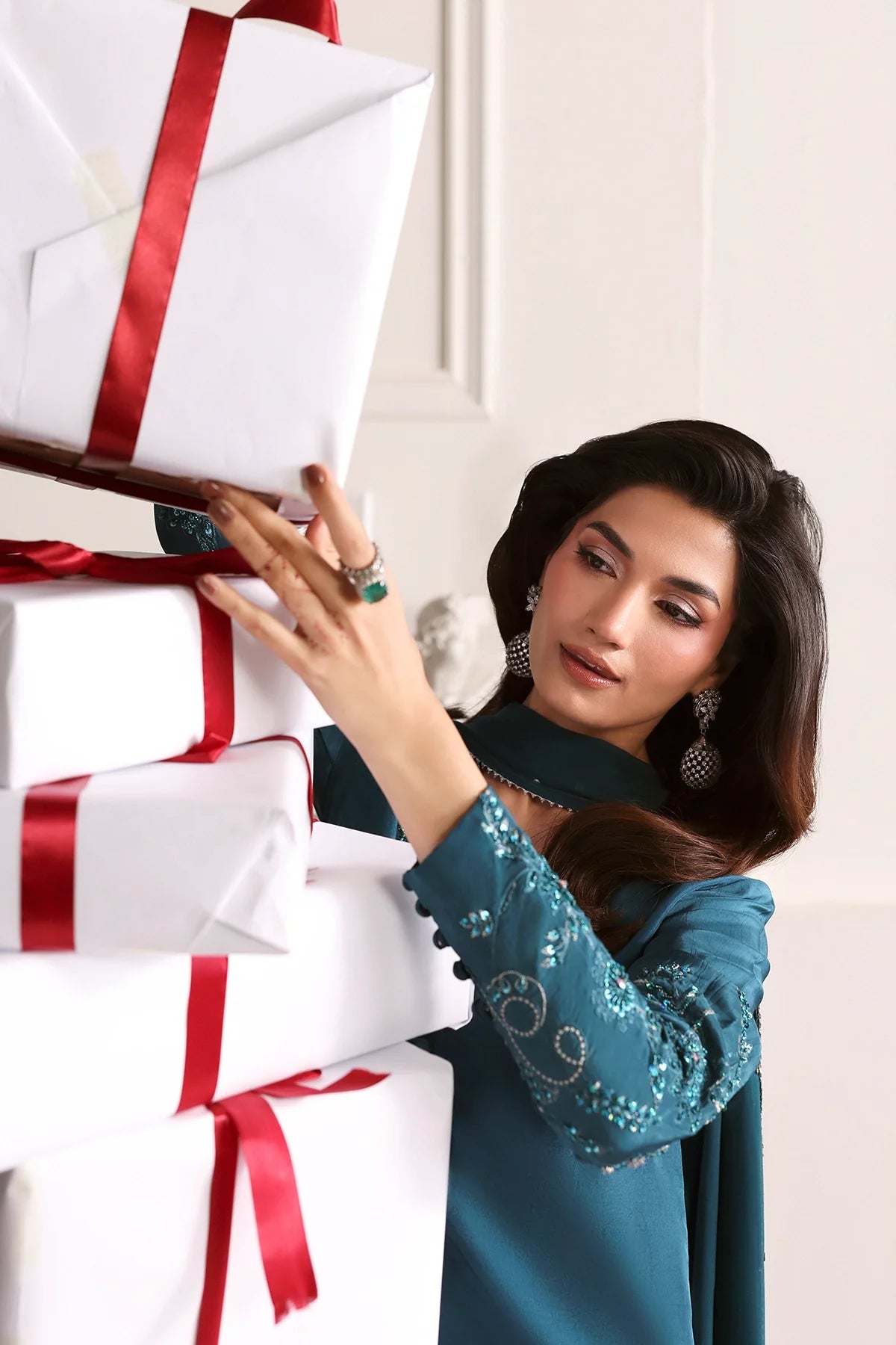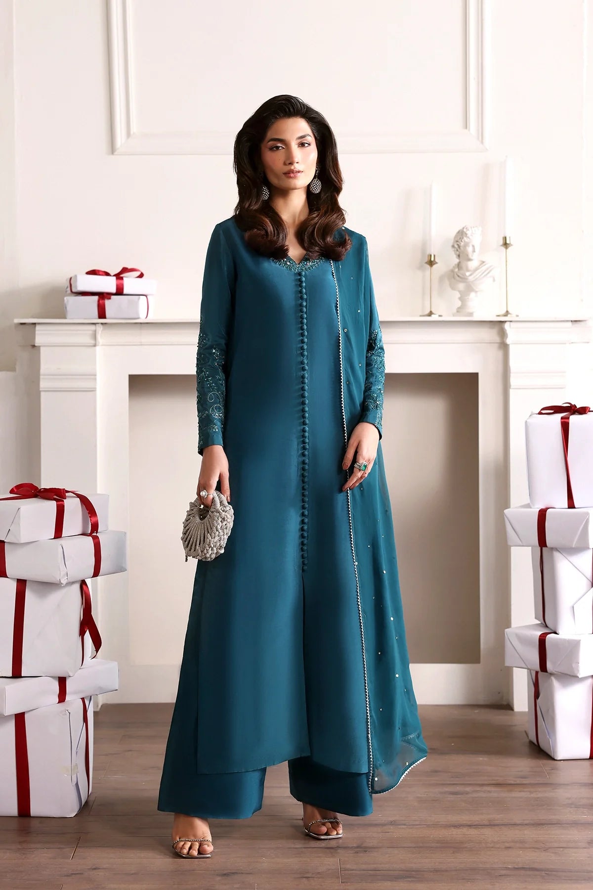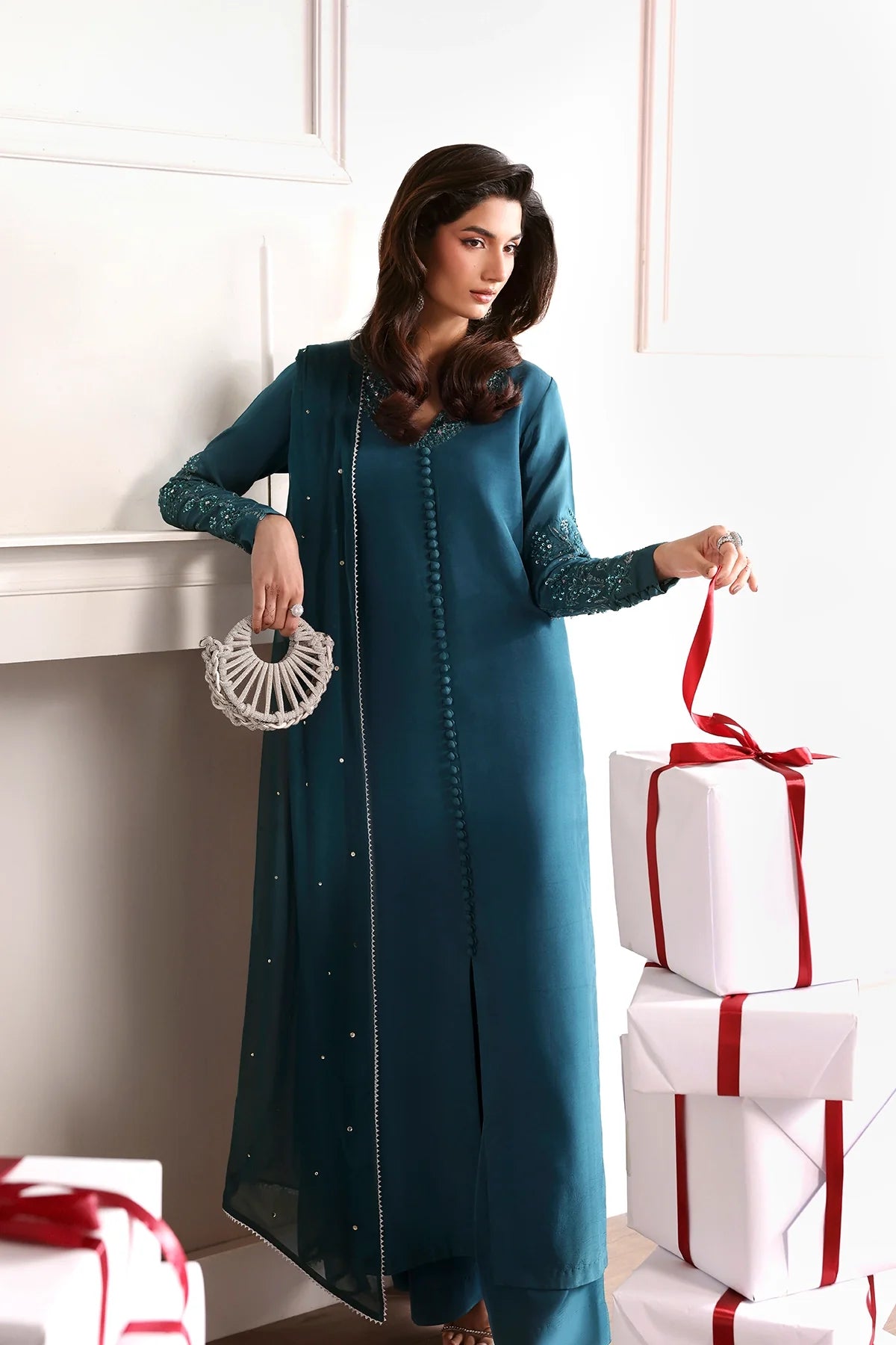 SliK long embroidered Shirt with delicate hand embellishments, paired with straight trousers and embroidered dupatta.