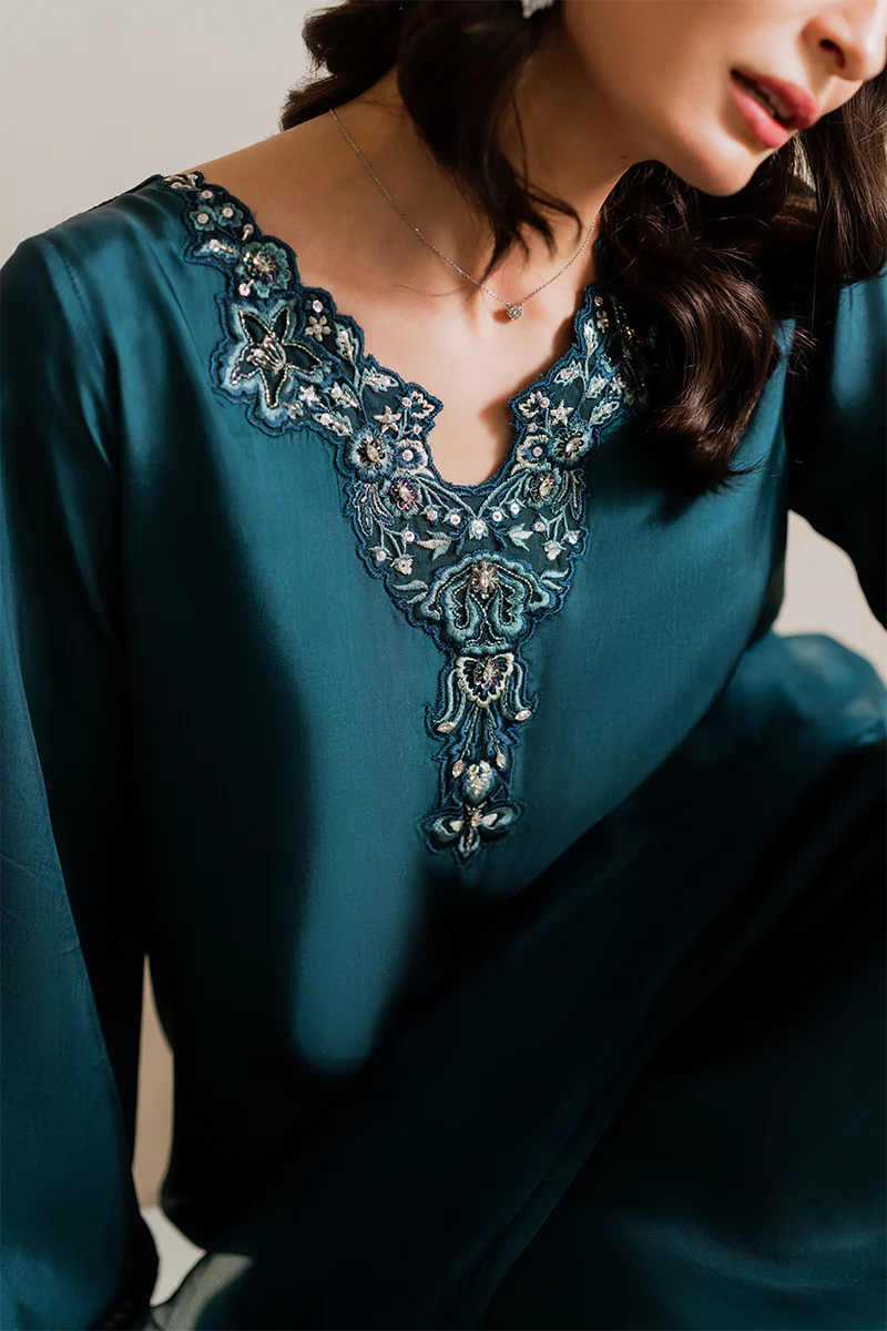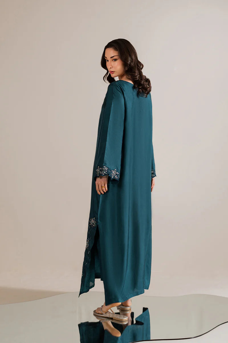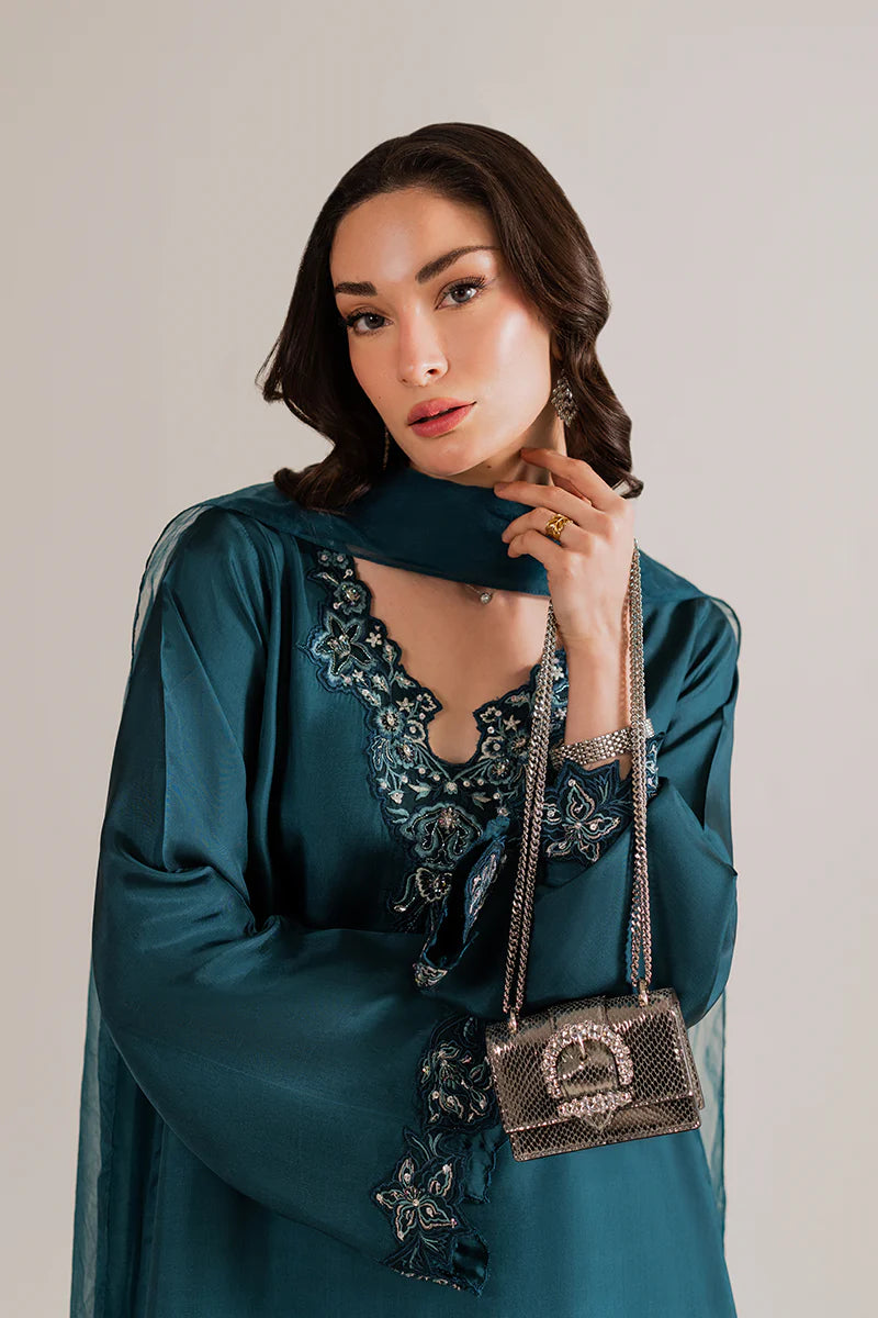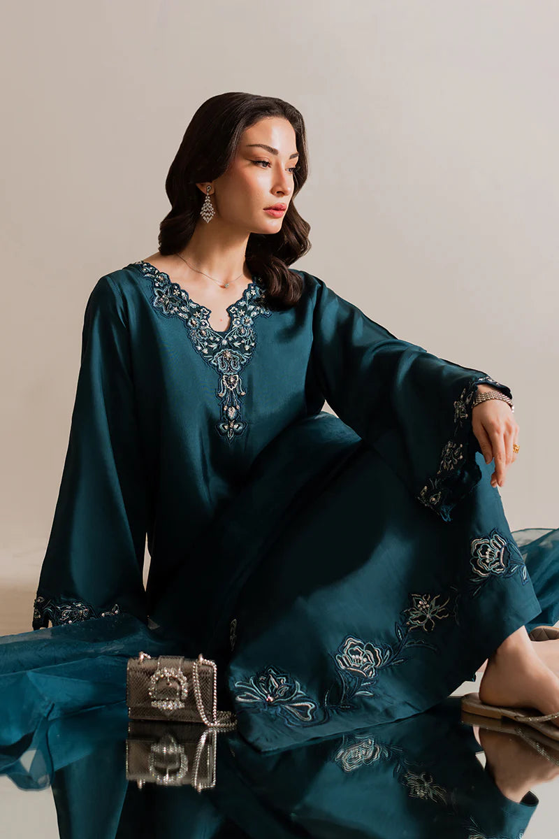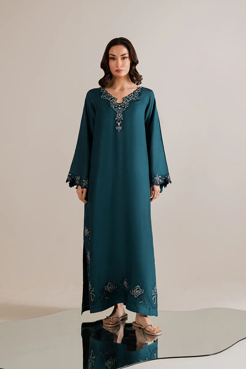 An exquisite straight-cut kaftan, elevated with meticulous handwork along the neckline. Bell sleeves cascade effortlessly, adorned with intricate detailing, while the richly embellished hem and side slits add a touch of refined opulence. Styled with straight pants and an organza dupatta framed by a medium silk border, lavishly detailed with heavy embellishments—an ensemble that embodies timeless luxury.