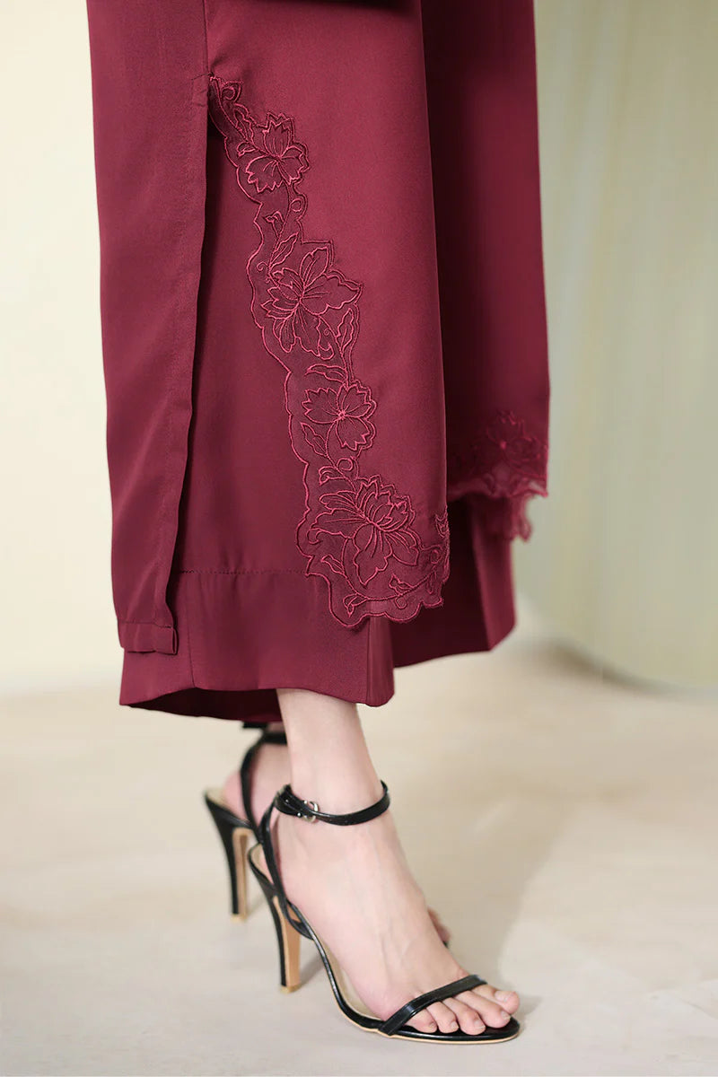 A long shirt featuring a delicate baby neckline, embroidered organza patches along the hem and side slits, and flared sleeves adorned with embroidered organza borders, paired with easy culottes. Designed for everyday wear, this effortless look moves seamlessly from coffee runs to work hours and casual plans, keeping you comfortable while looking thoughtfully put together.