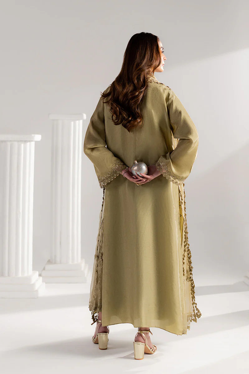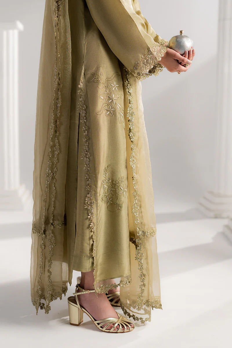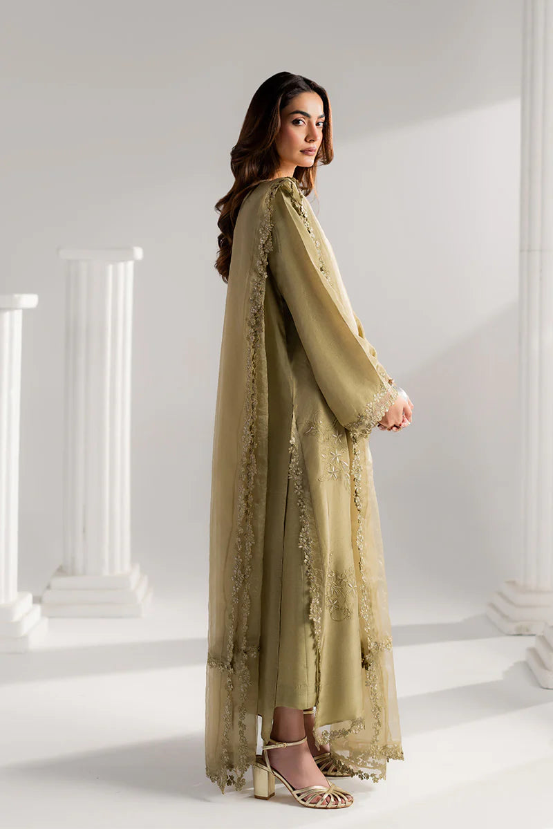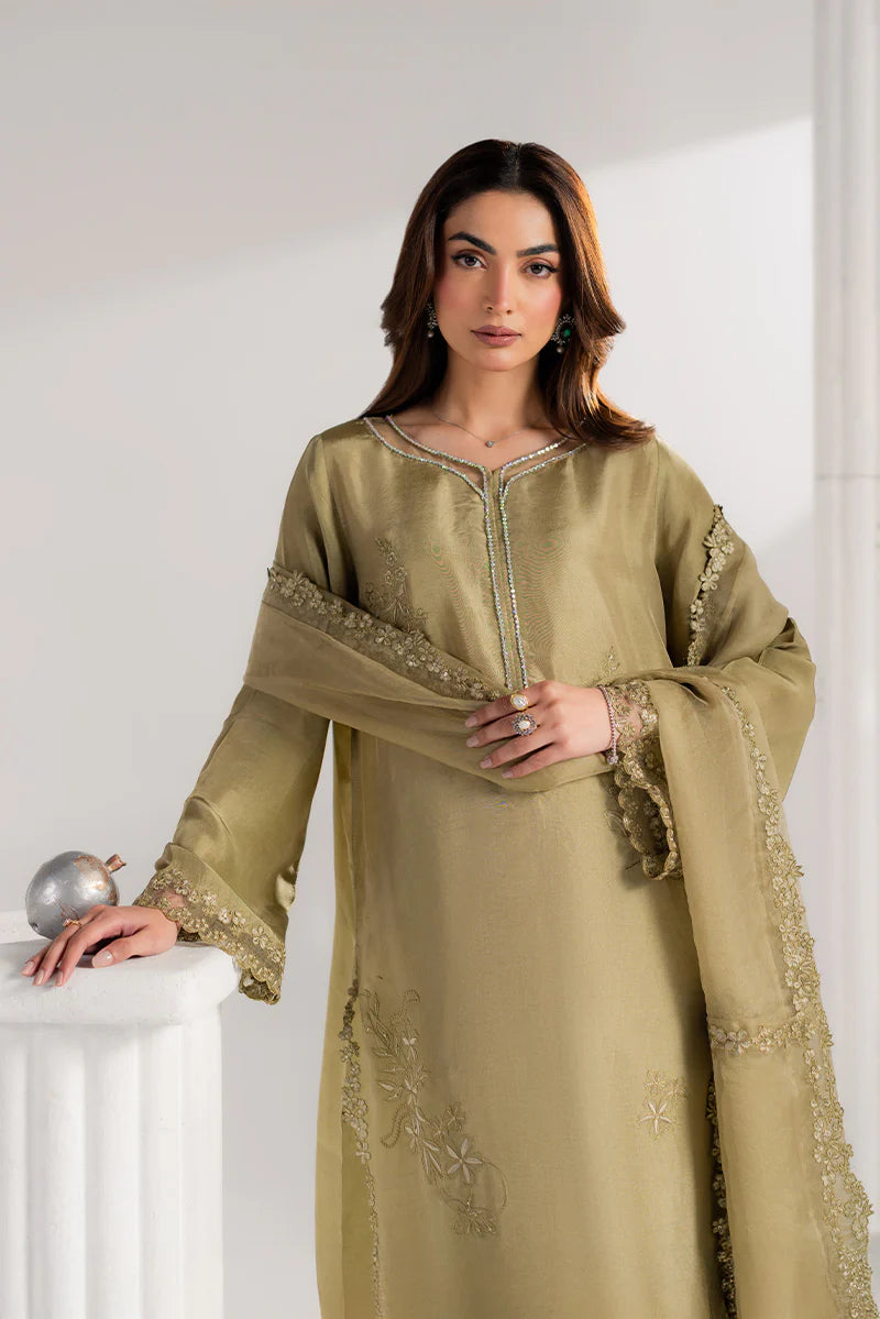 Elevate your Eid look with this stunning embroidered ensemble. The straight long shirt showcases intricate adda embroidery along the neckline, complemented by delicate organza accents for refined elegance. Flared sleeves feature an embroidered sequin border, while the hem and side slits shimmer with matching sequin details. Styled with tailored culottes and a flowing organza dupatta with embroidered borders, this outfit blends comfort, sophistication, and festive charm — ideal for Eid and family celebrations.