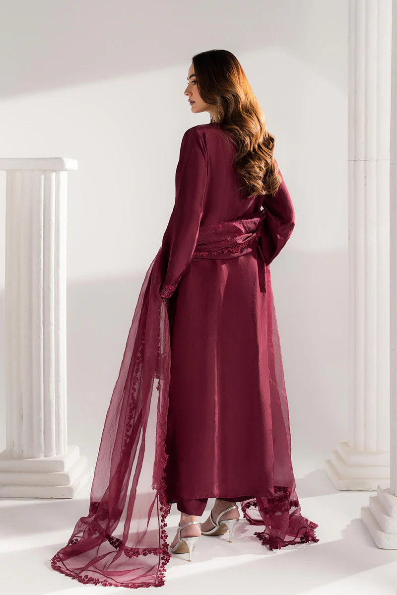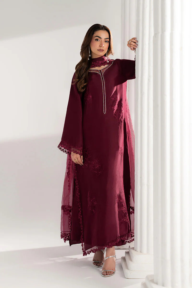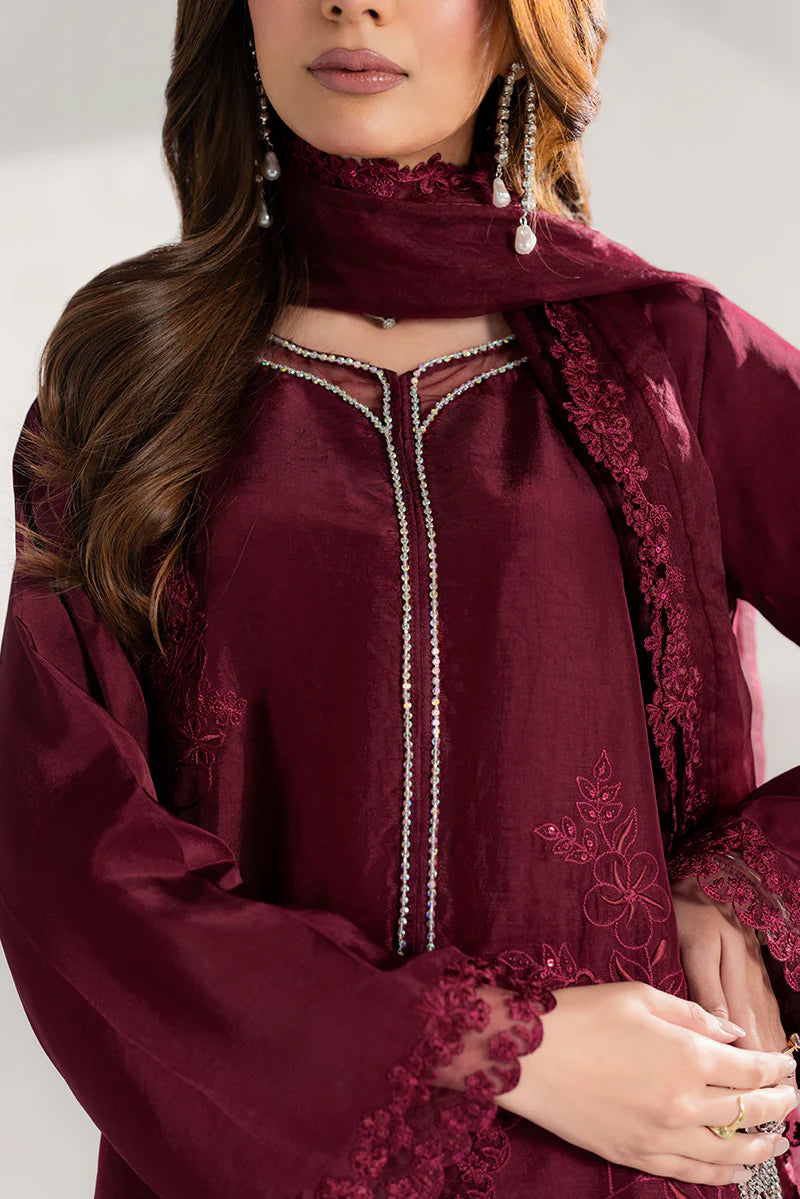 Celebrate Eid in timeless elegance with this stunning ensemble. The straight long shirt features intricate adda work along the neckline, enhanced with delicate organza detailing for a touch of sophistication. Flared sleeves are finished with an embroidered sequin border, while the hem and side slits are adorned with matching sequin embroidery, adding subtle sparkle with every movement. Paired with perfectly tailored culottes and a flowing organza dupatta with embroidered borders, this outfit combines comfort, grace, and festive charm — perfect for Eid celebrations and family gatherings.