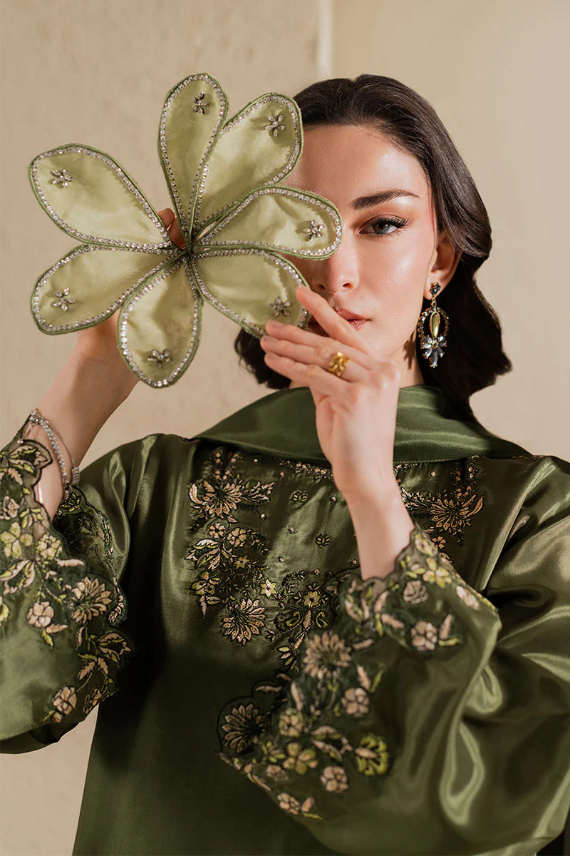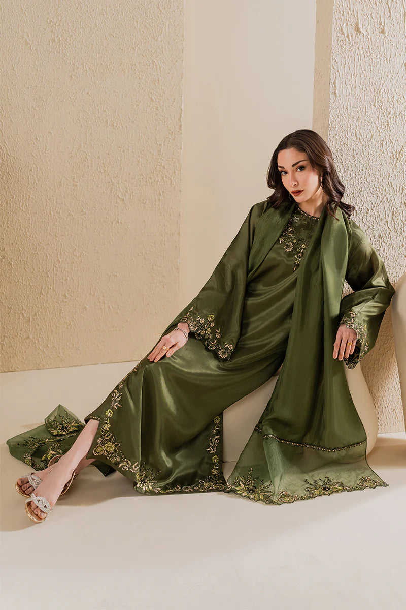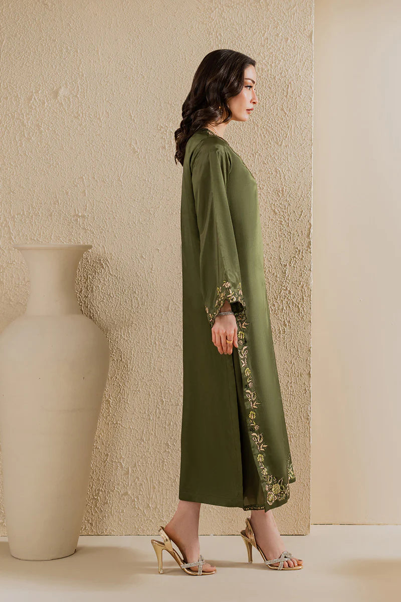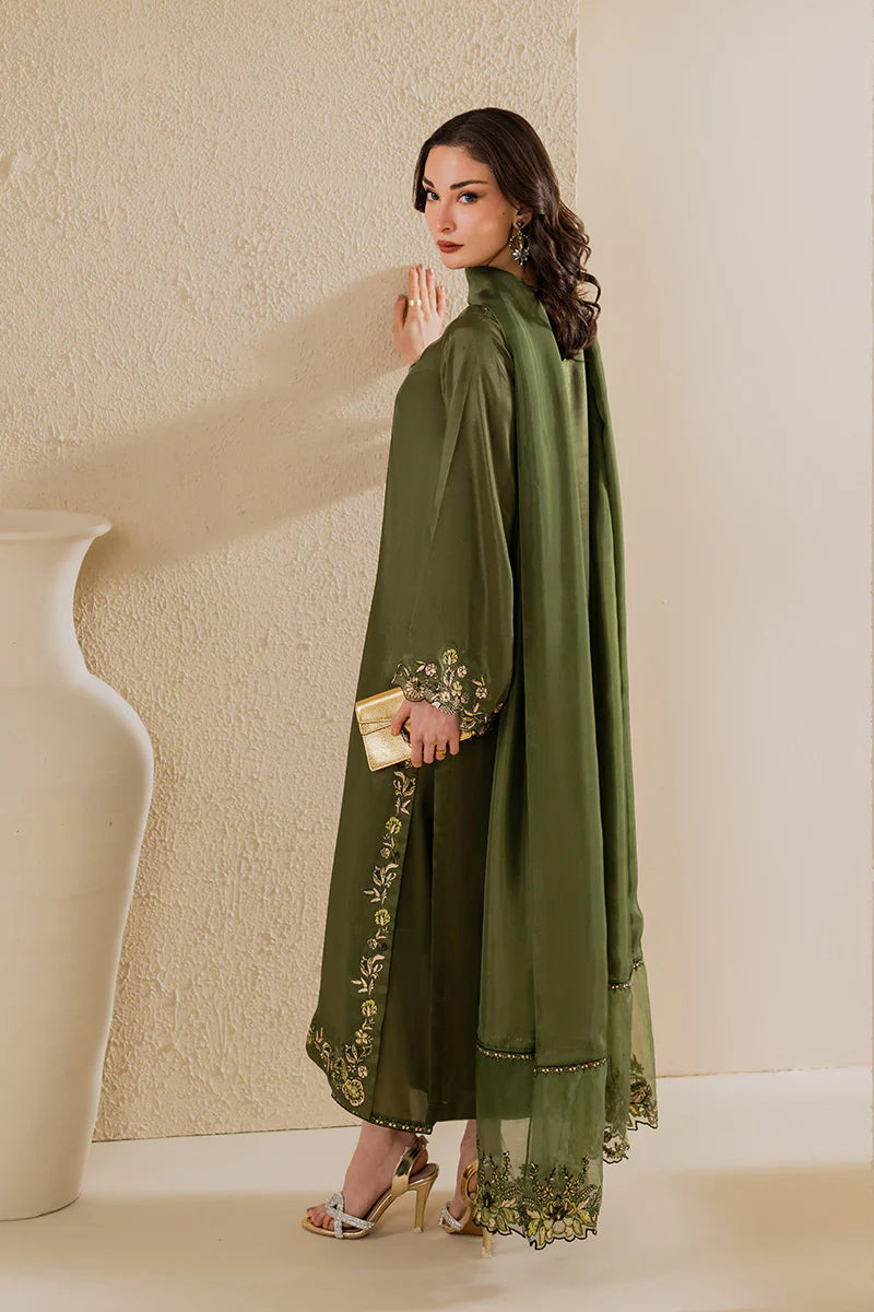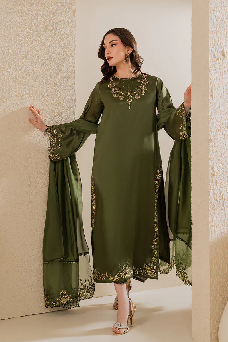 An embodiment of timeless sophistication, this straight shirt is beautifully detailed with contrast embroidery along the neckline, forming a refined yet captivating focal point. Flared sleeves are enhanced with intricately embroidered contrast borders, while the heavily embroidered hem and delicately finished side slits add depth and grandeur to the silhouette. Paired with culottes featuring an embroidered hem and a medium silk luxury dupatta framed with contrast embroidered borders, this ensemble exudes effortless regality.