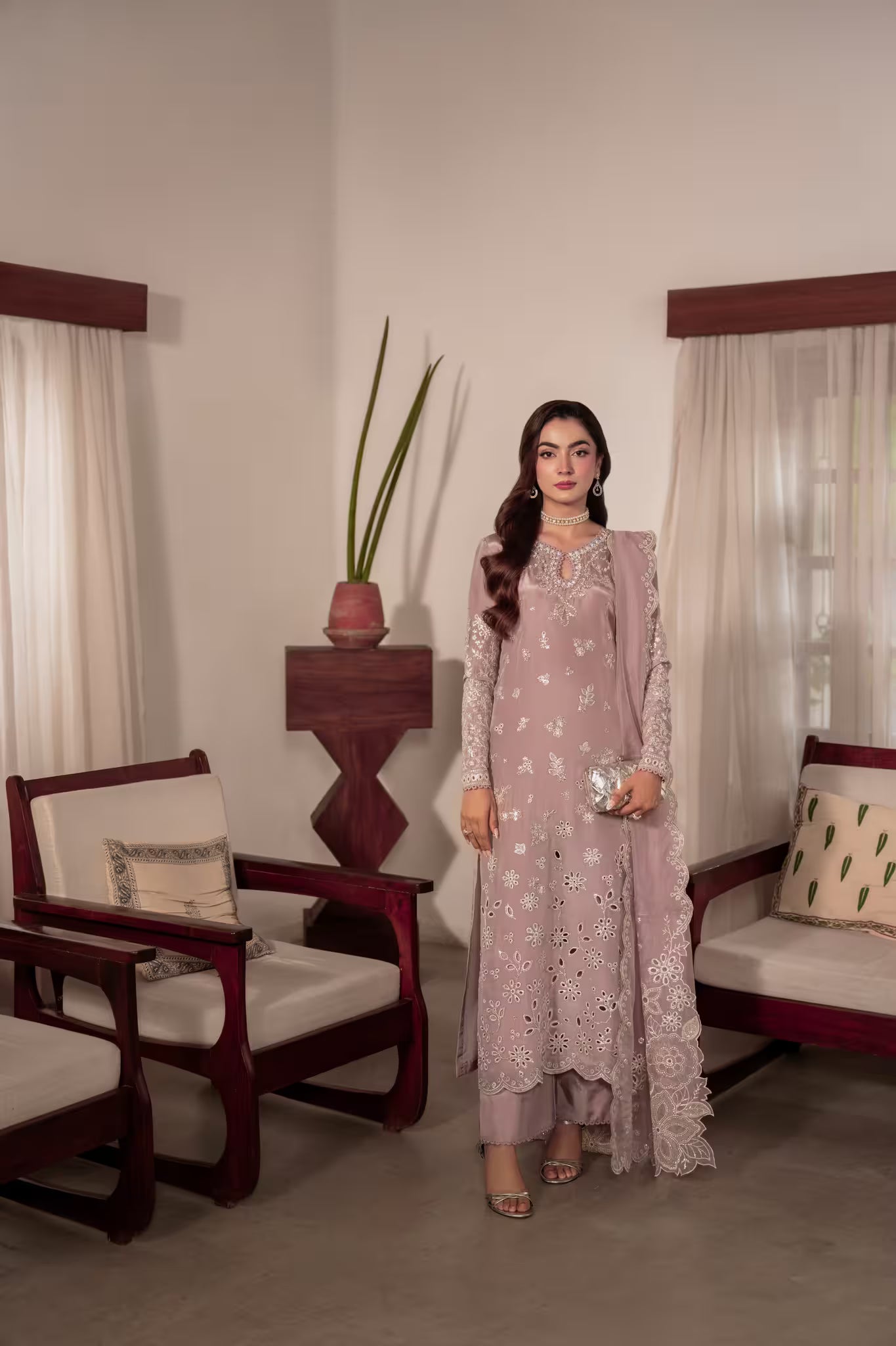 Paired with matching pants and an organza dupatta that is a true piece of art — featuring scalloped, sequin-embroidered borders and statement pallus adorned with floral bunches enhanced with sequins, cutwork, and schiffli — MAAVI embodies timeless sophistication and graceful charm.