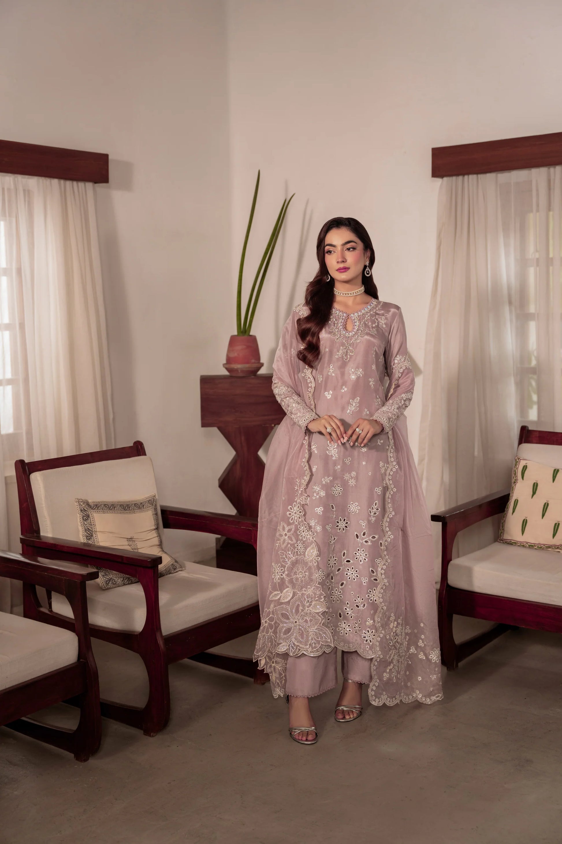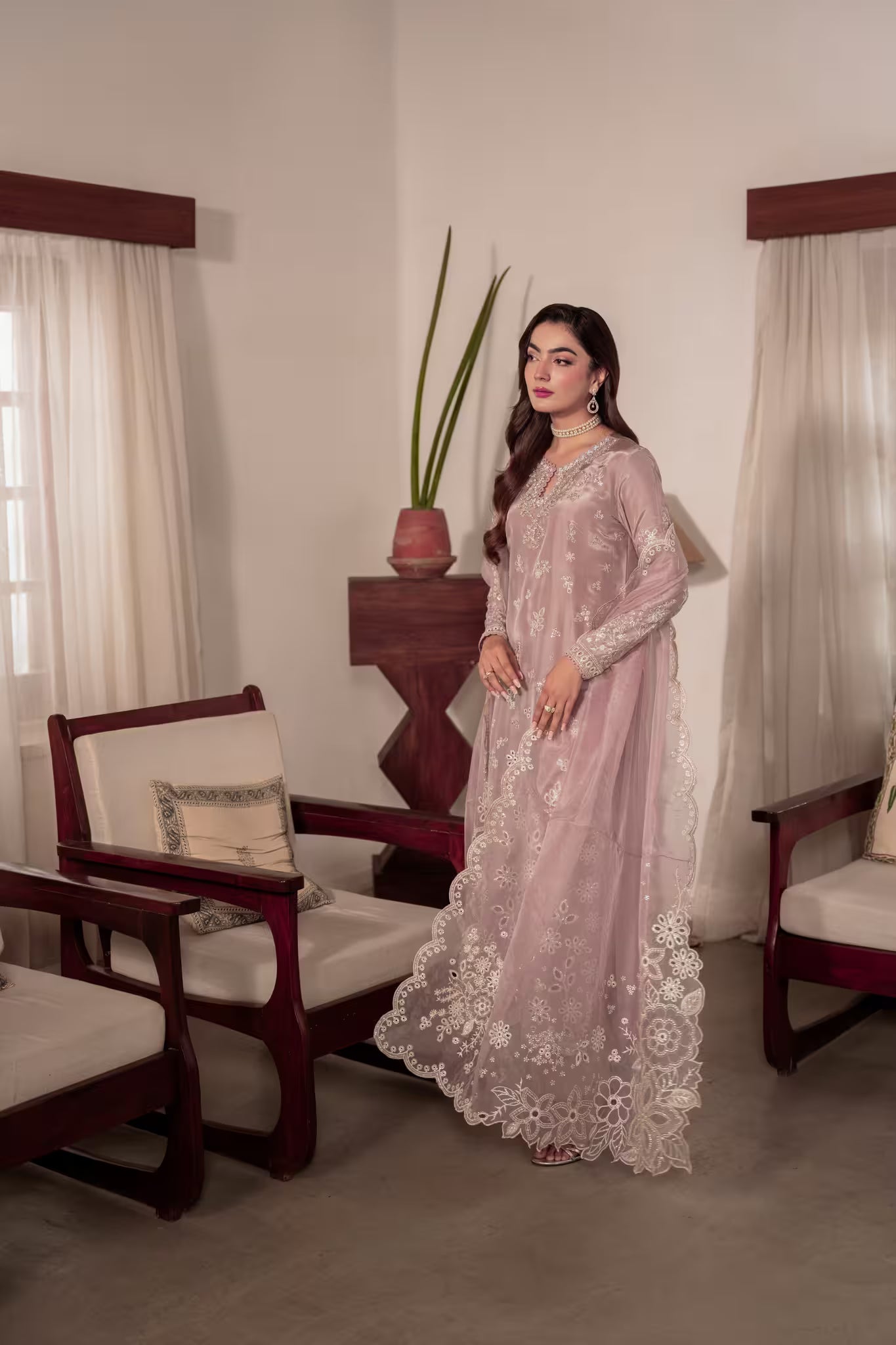 MAAVI is crafted from pure ramen silk in a soft dusty mauve hue, exuding delicate elegance. The shirt features a hand-embellished neckline adorned with crystals and sequins, complemented by floral and sequin embroidered cutwork on the sleeves and front, along with intricate lace detailing.