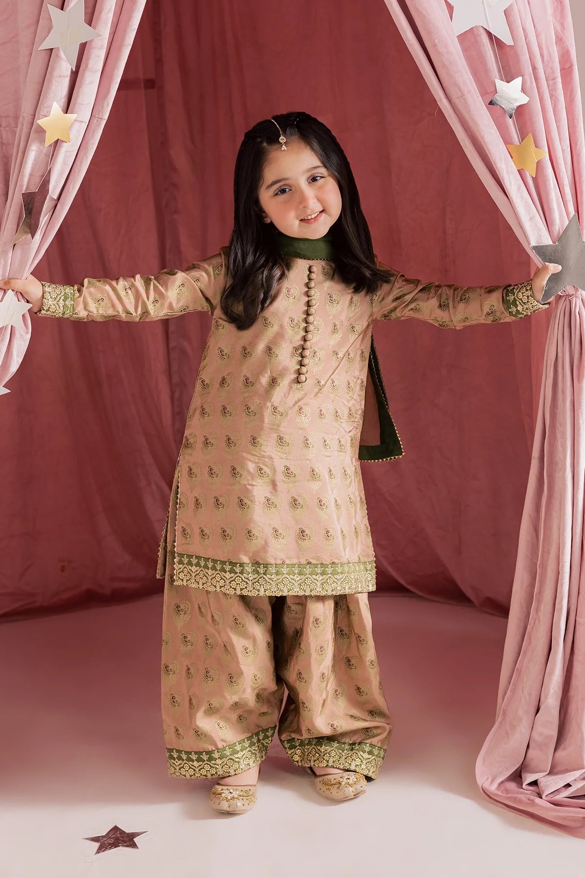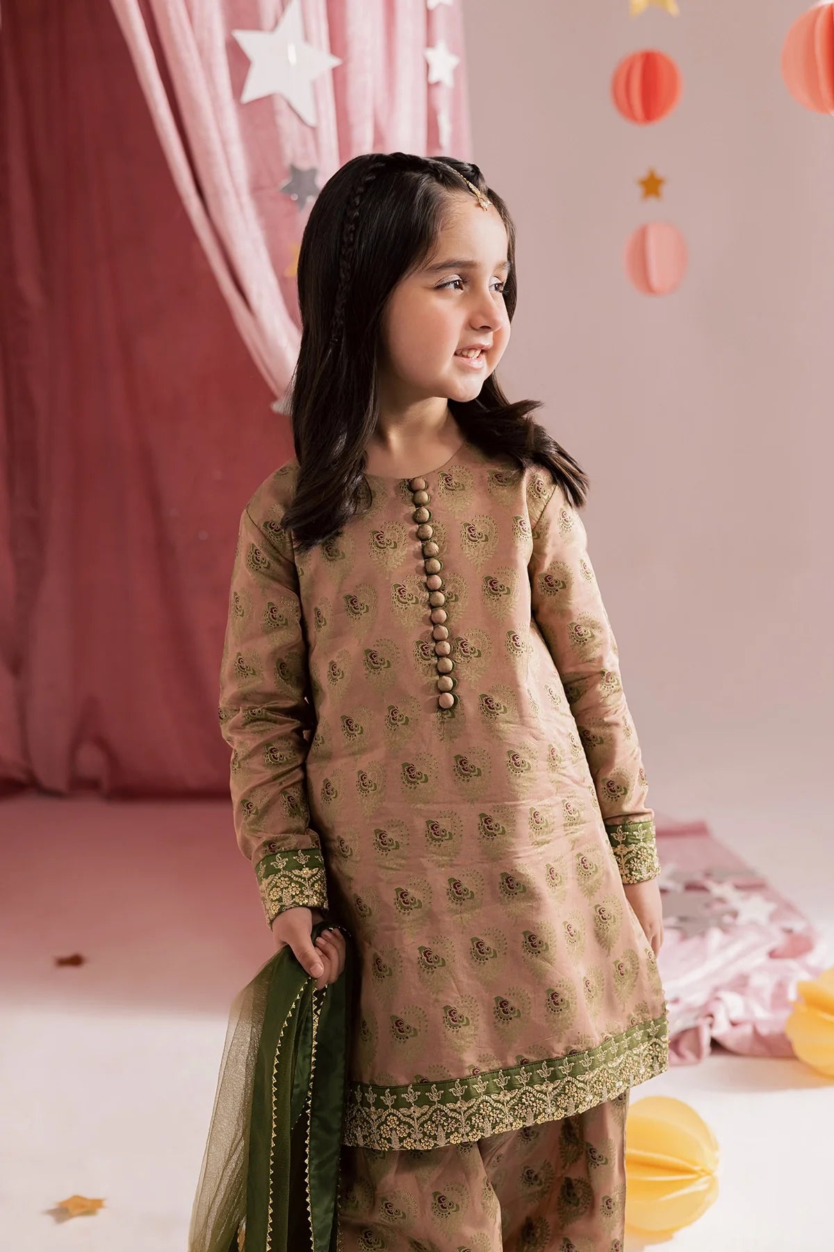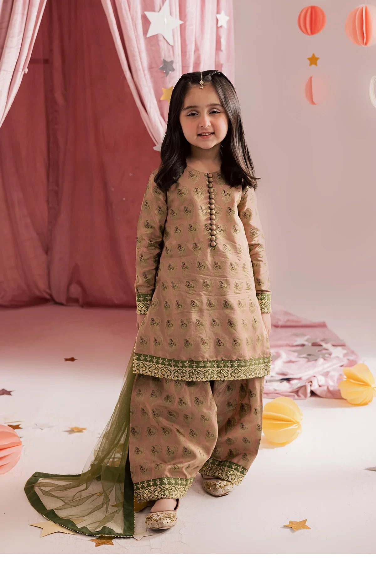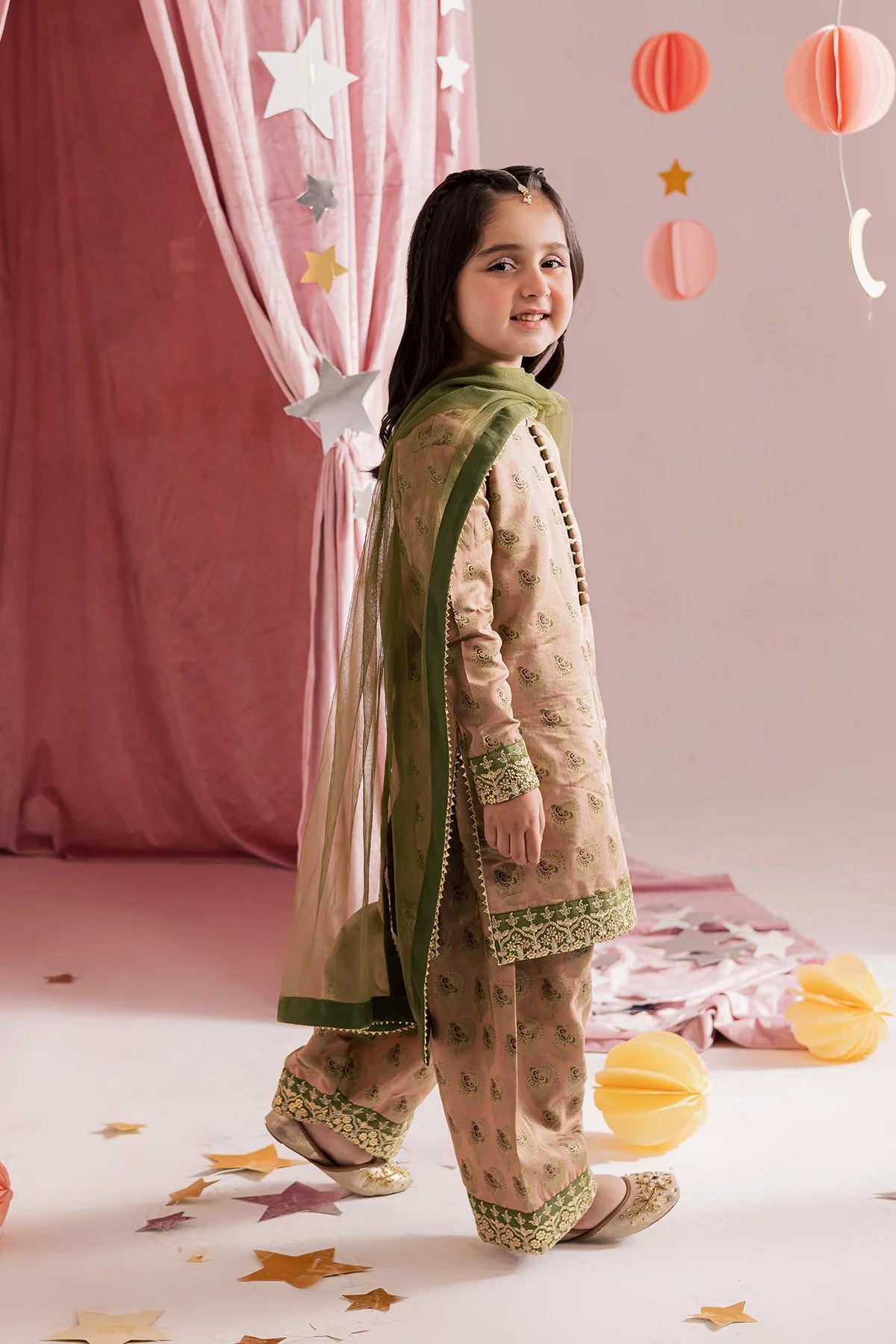 A classy silk screen-printed farshi shalwar kameez paired with a two-tone silk dupatta — an elegant choice for Eid.