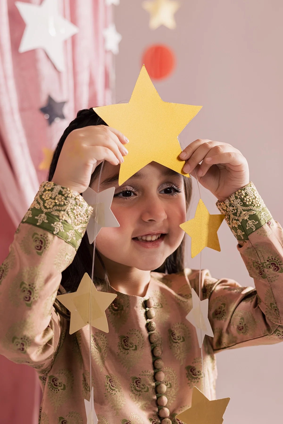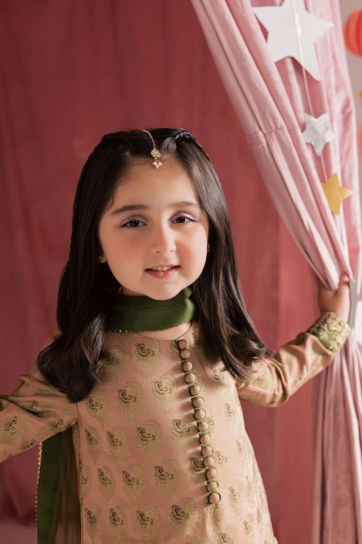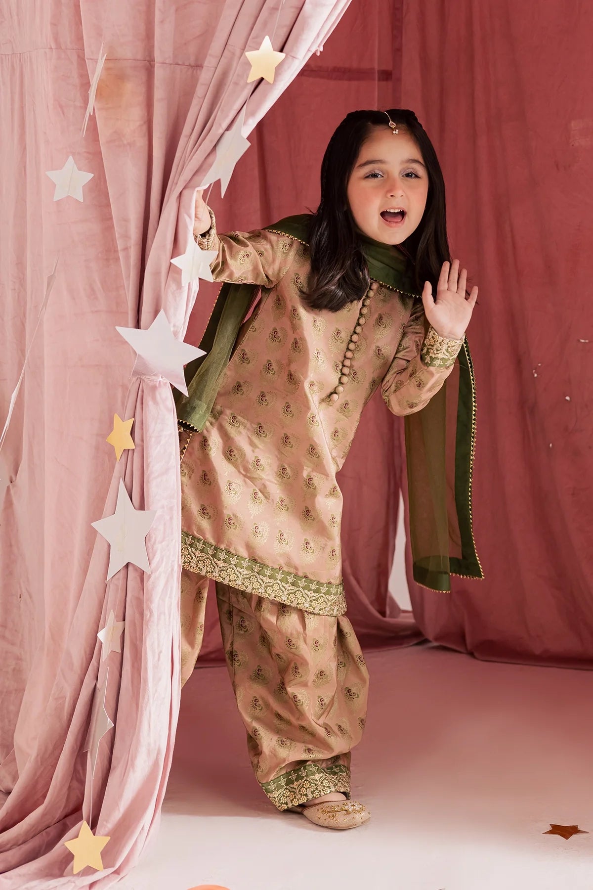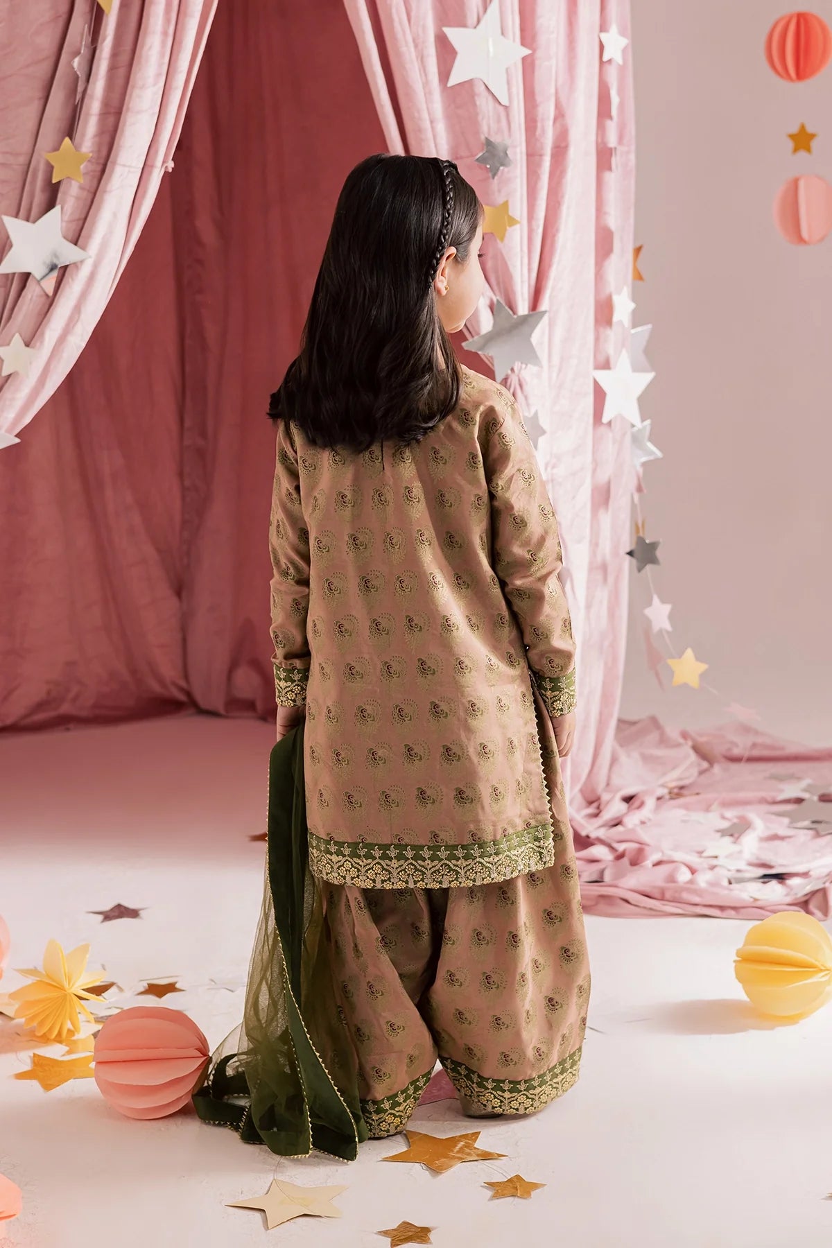 A classy silk screen-printed farshi shalwar kameez paired with a two-tone silk dupatta — an elegant choice for Eid.