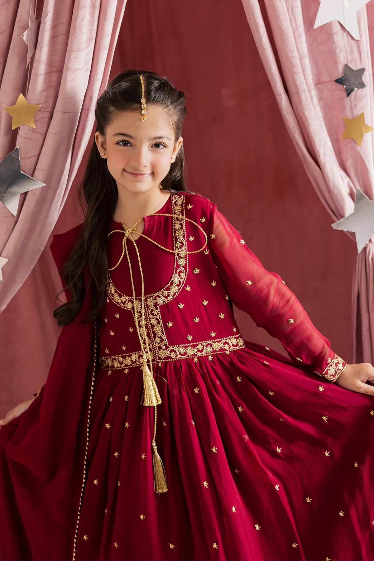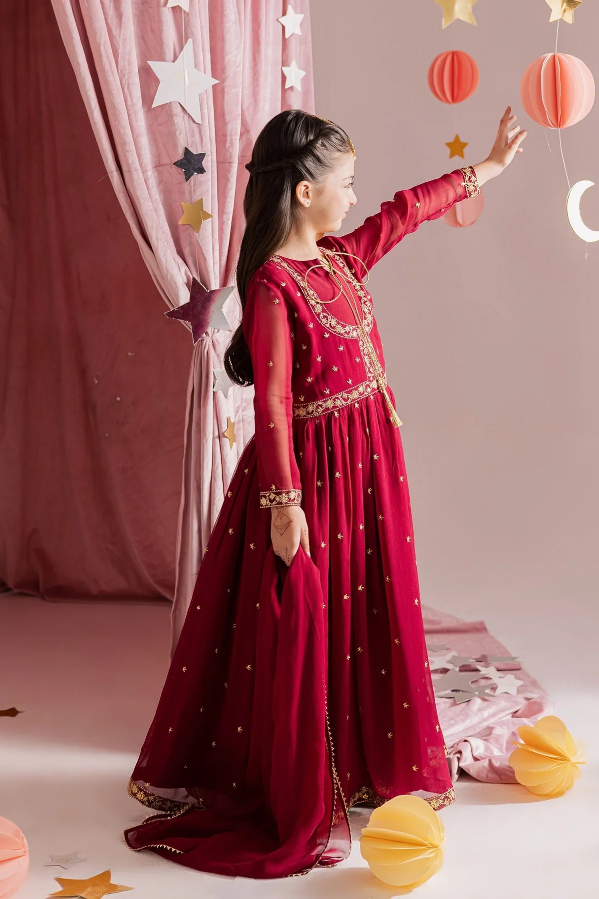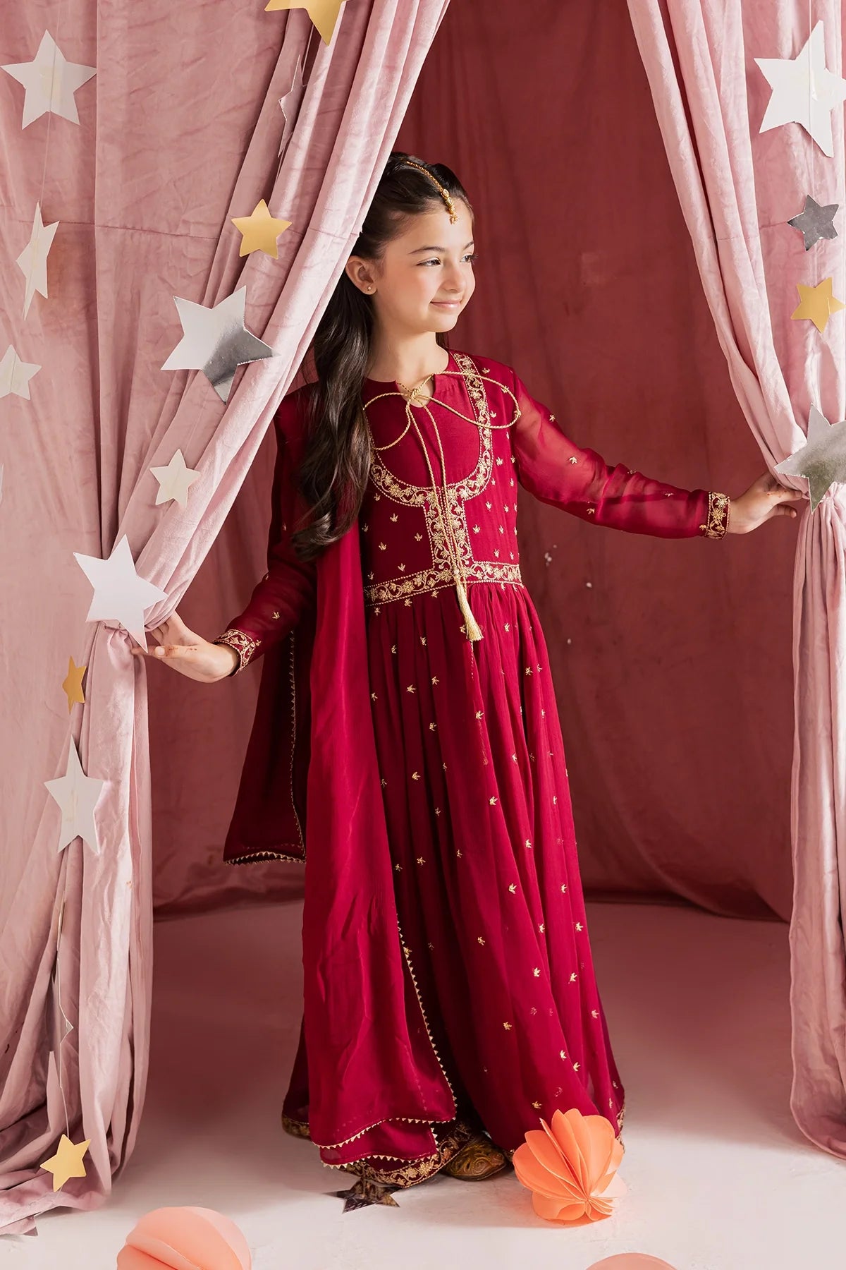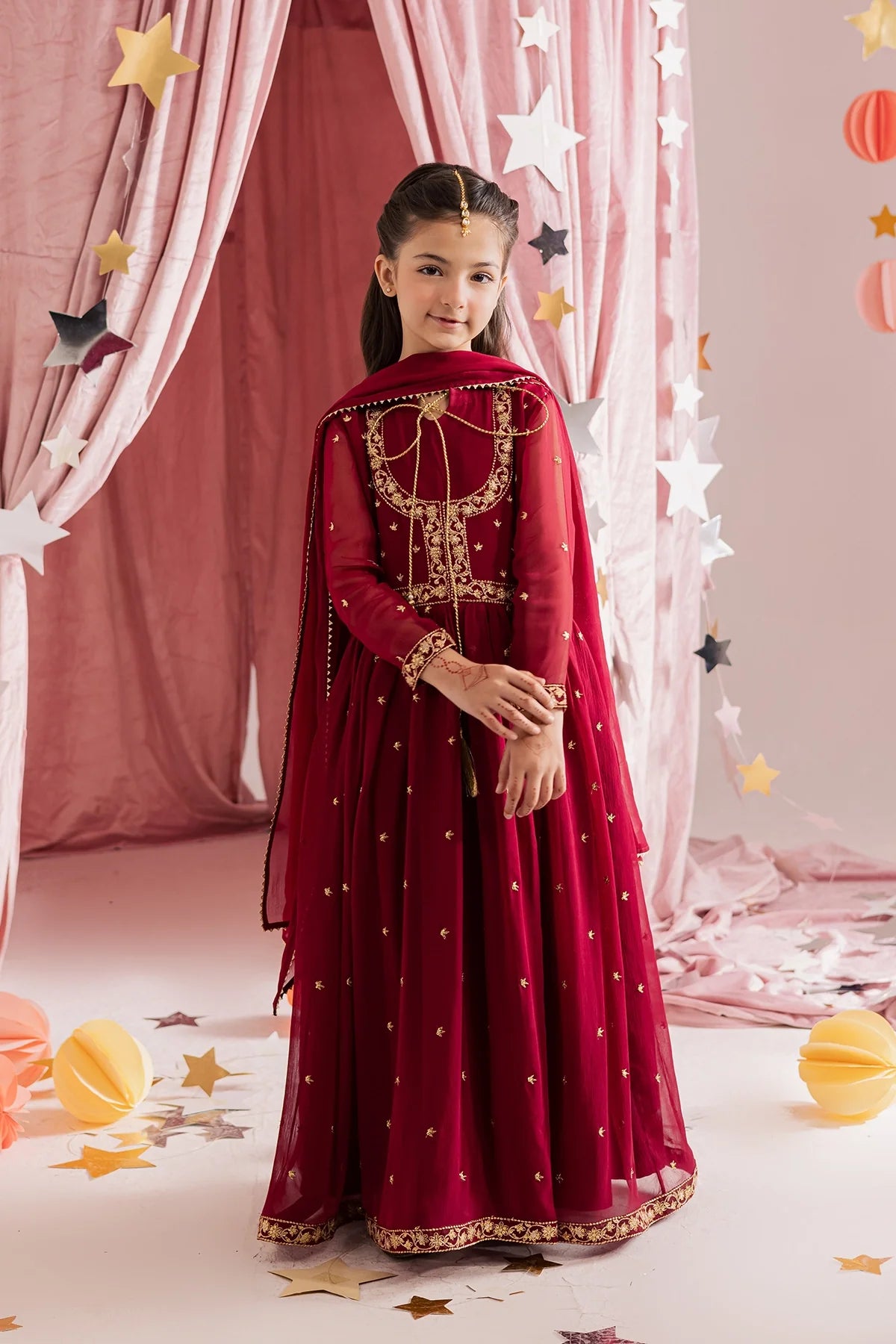 Deep red chiffon kalidar with heavy hand embellishments and detailed sleeves, paired with a rich chiffon dupatta and flared pants—regal and graceful.
