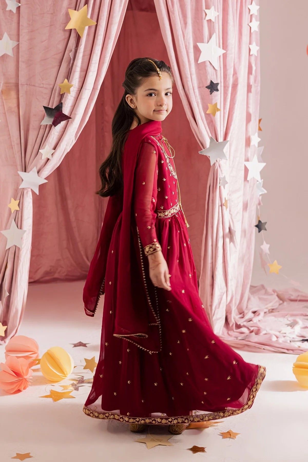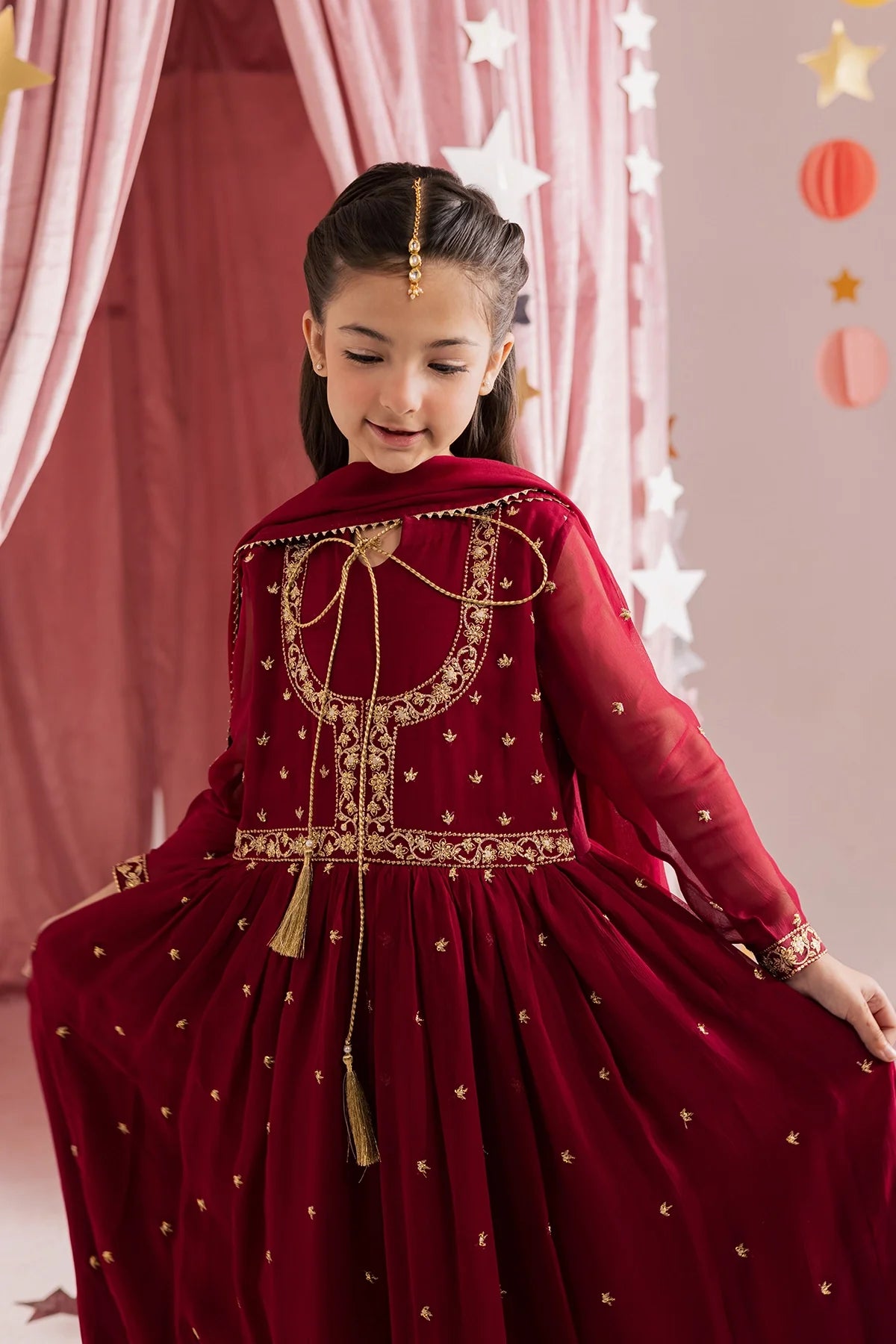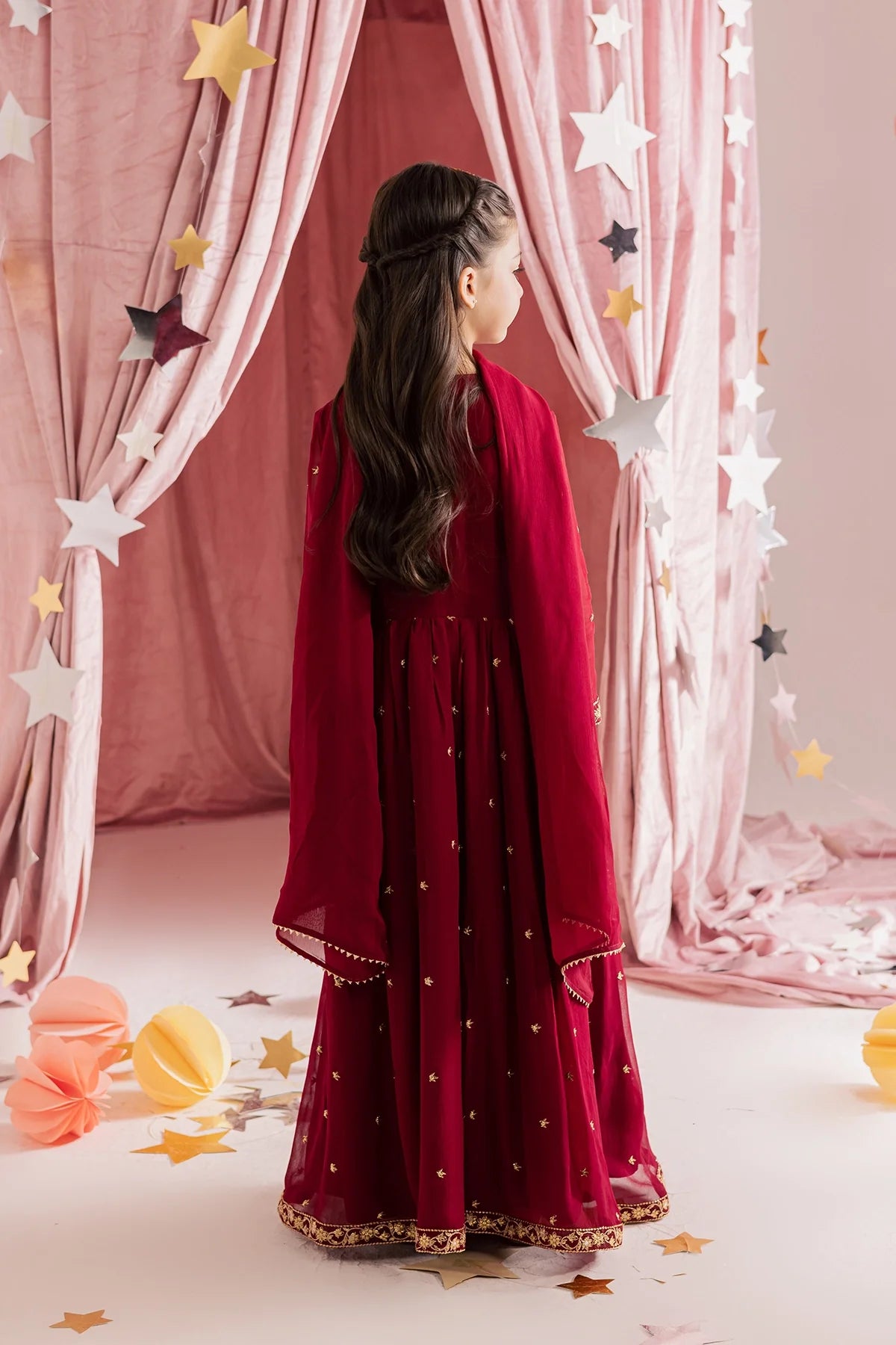 Deep red chiffon kalidar with heavy hand embellishments and detailed sleeves, paired with a rich chiffon dupatta and flared pants—regal and graceful.