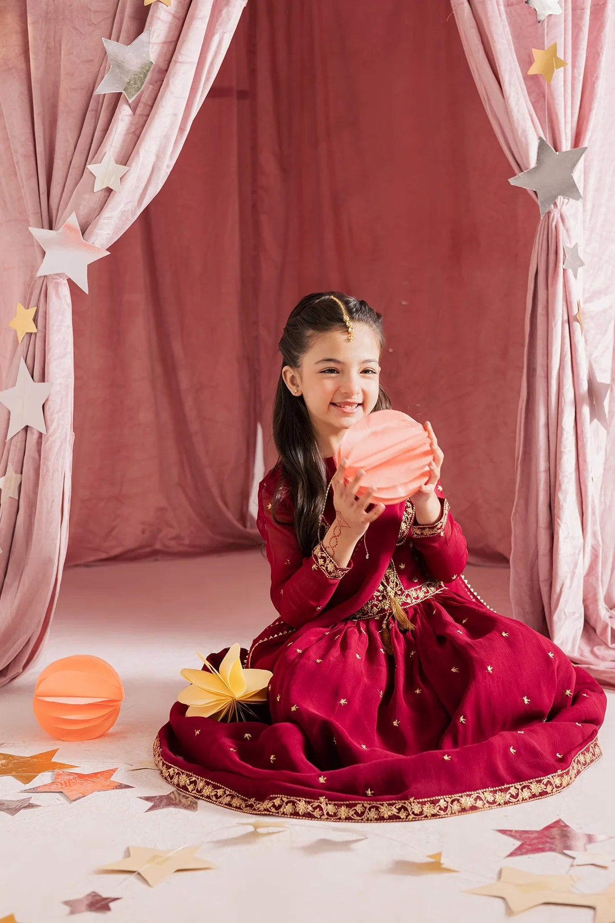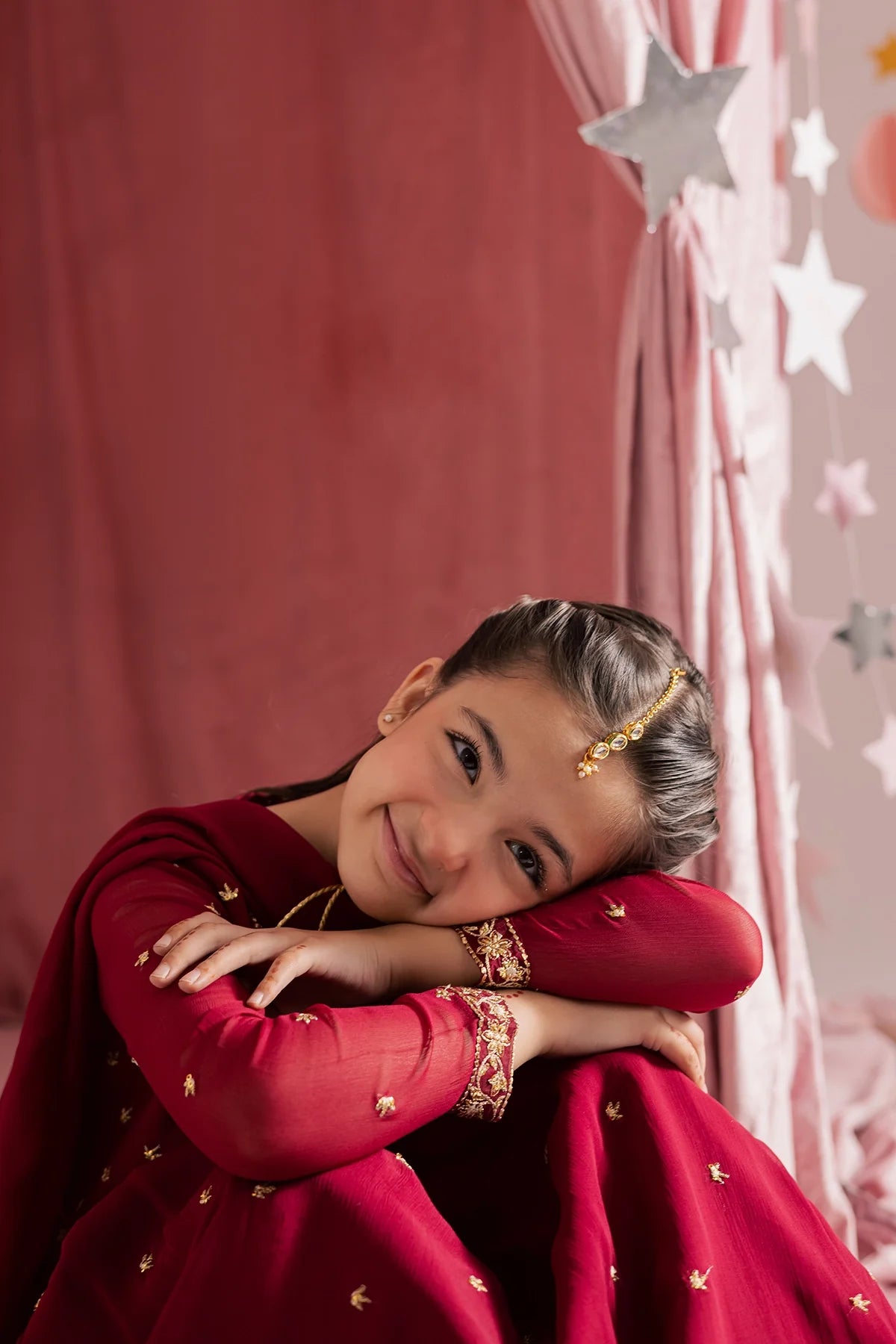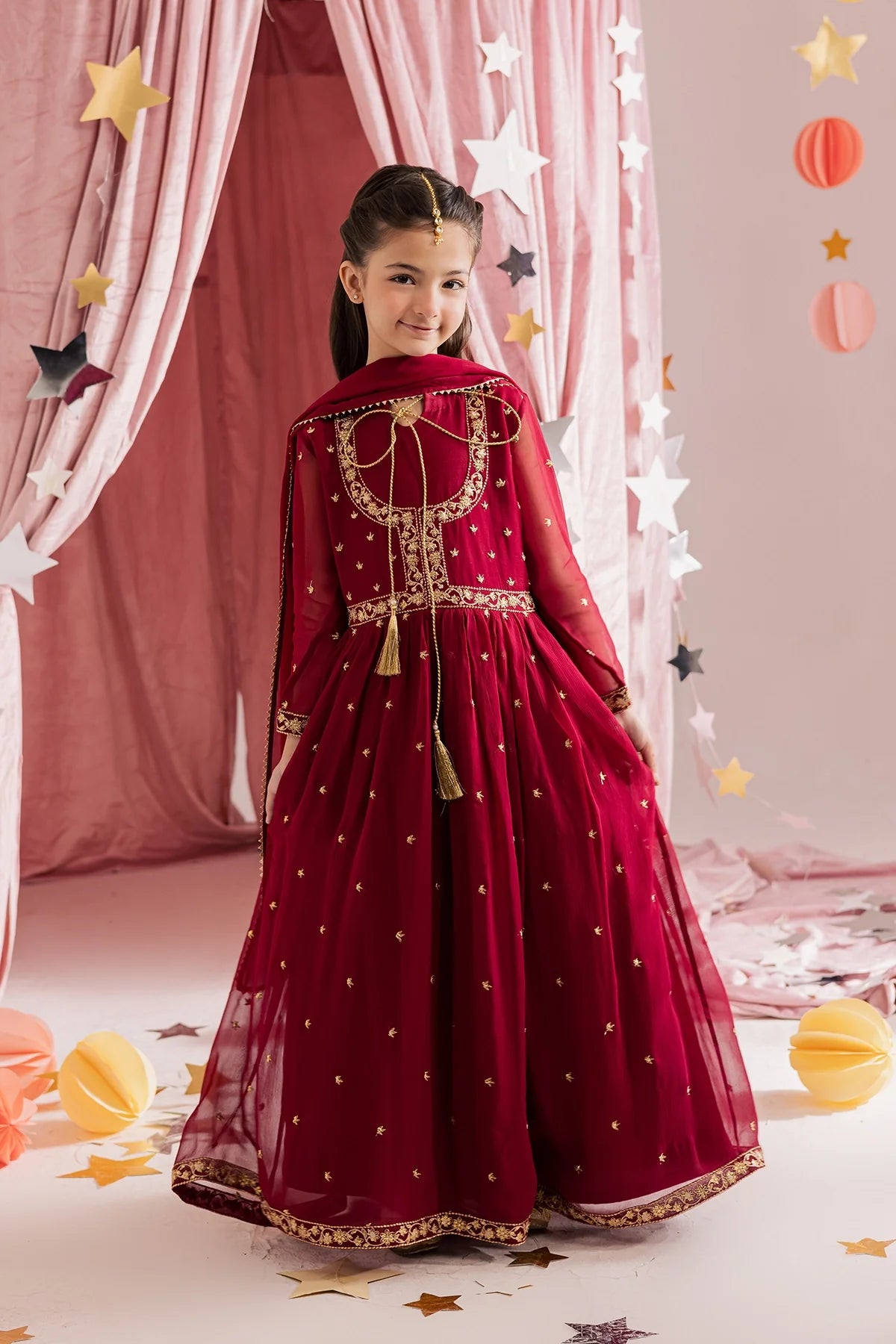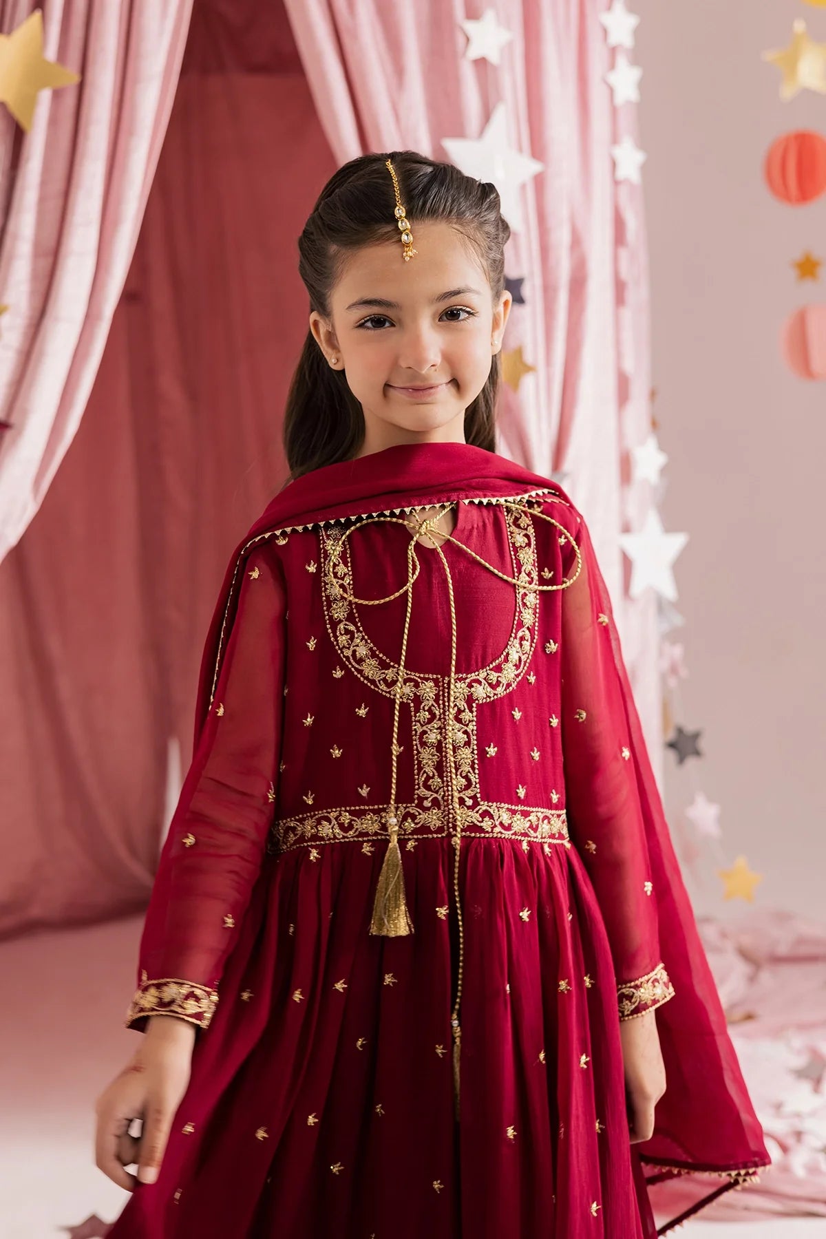 Deep red chiffon kalidar with heavy hand embellishments and detailed sleeves, paired with a rich chiffon dupatta and flared pants—regal and graceful.