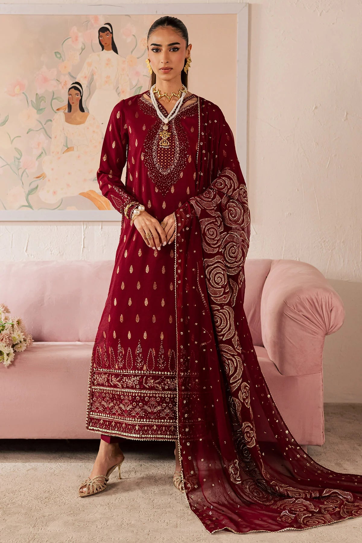 • EMBROIDERED ZARI JACQUARD SHIRT PAIRED WITH EMBROIDERED CHIFFON DUPATTA AND DYED COTTON TROUSER