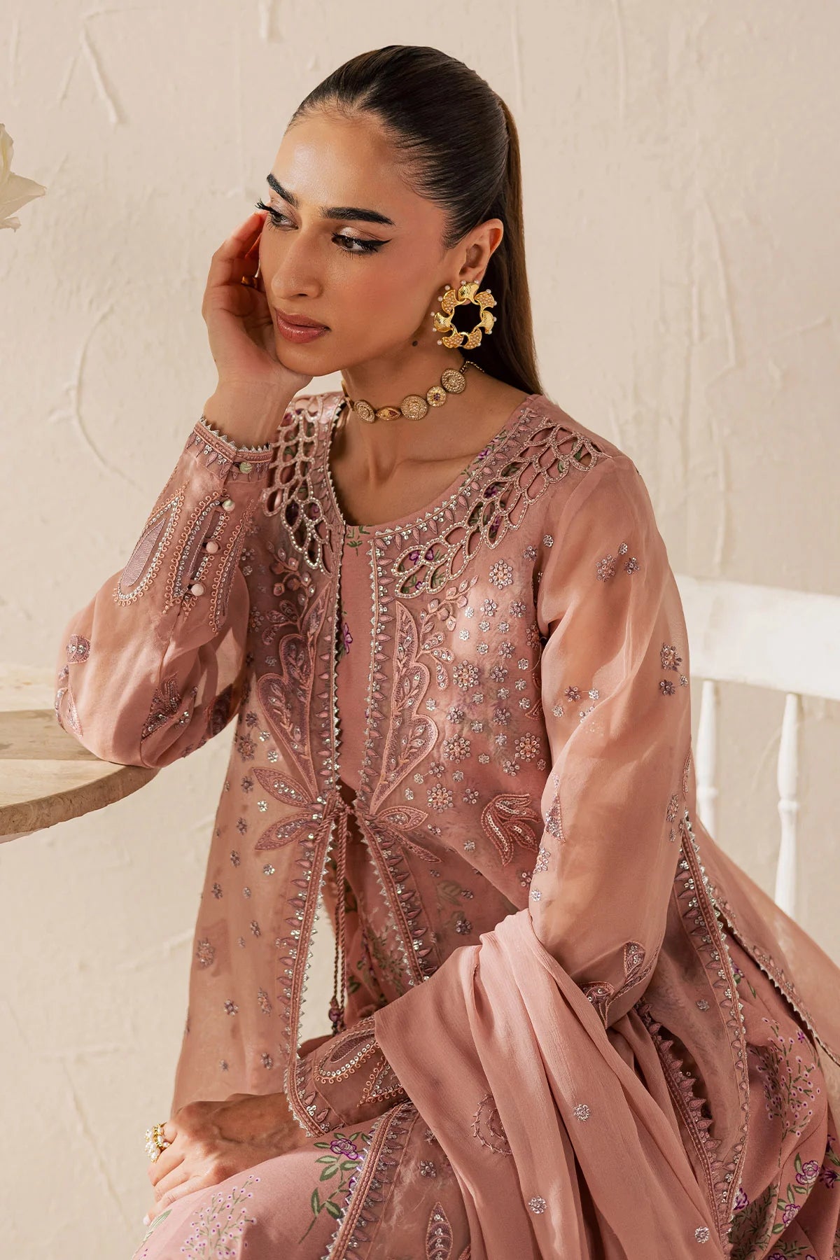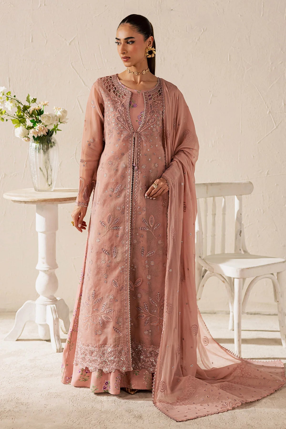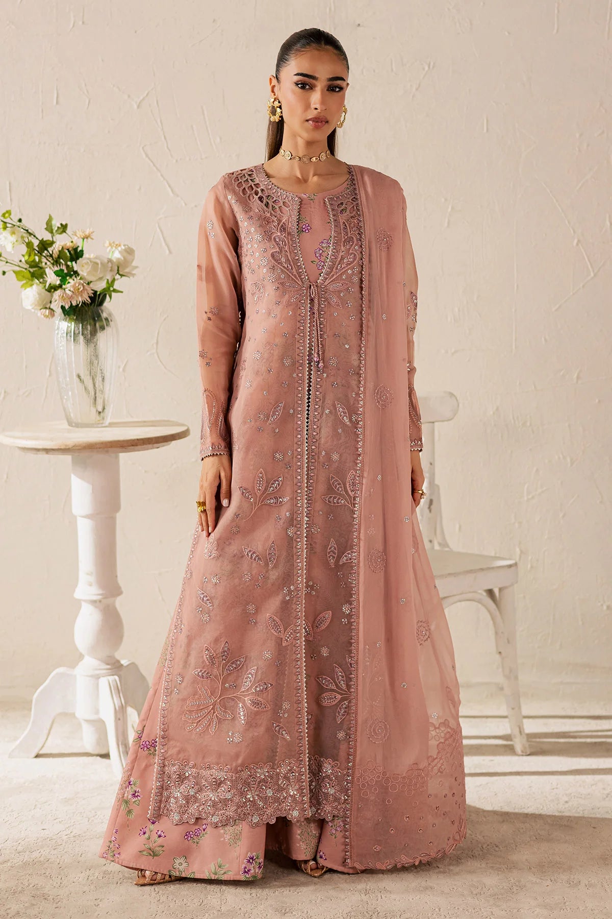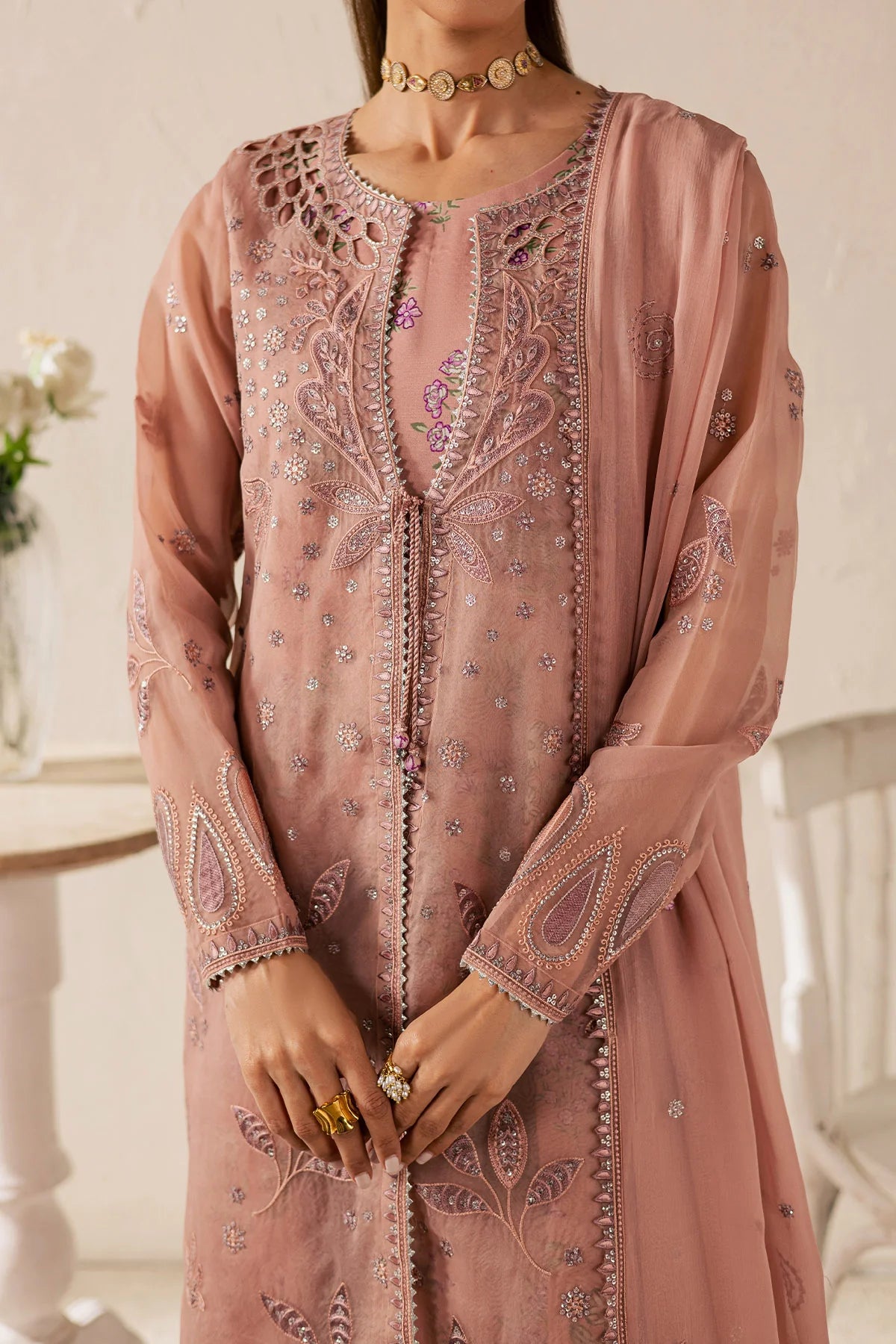• EMBROIDERED ORGANZA JACKET PAIRED WITH PRINTED RAWSILK FROCK AND DYED CHIFFON DUPATTA
