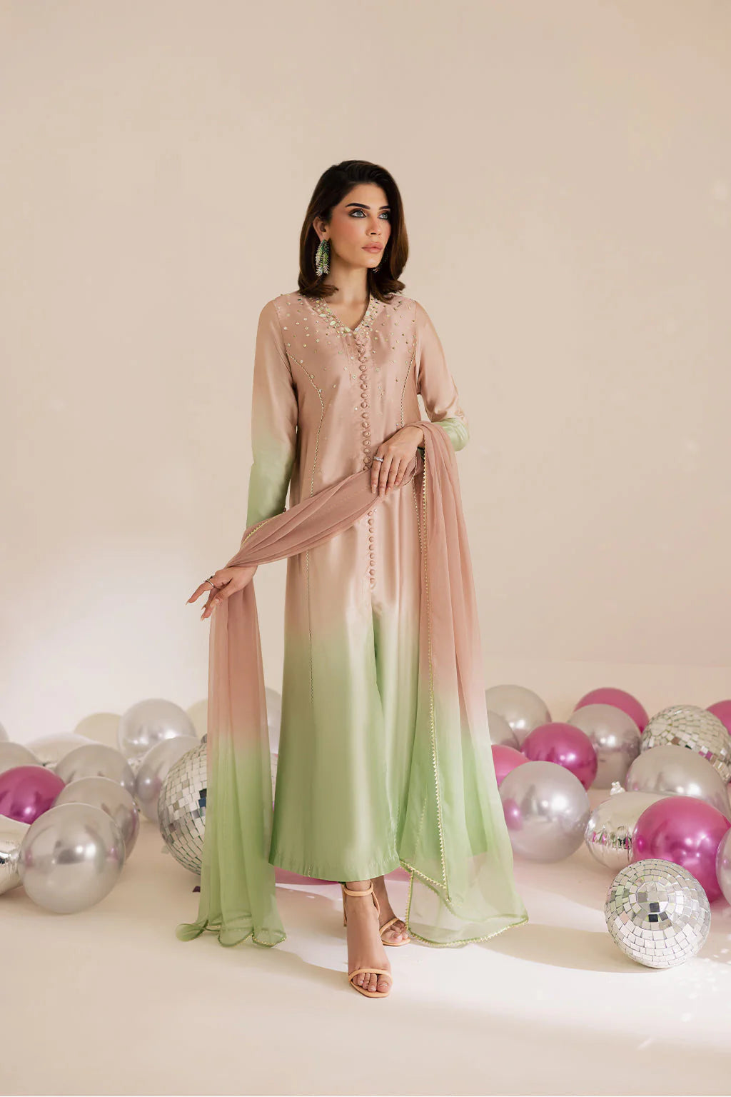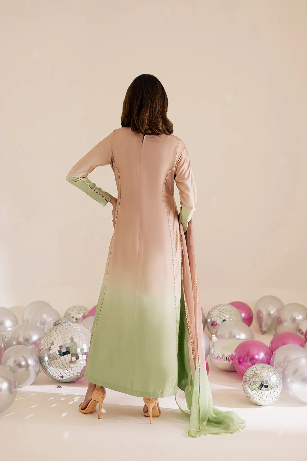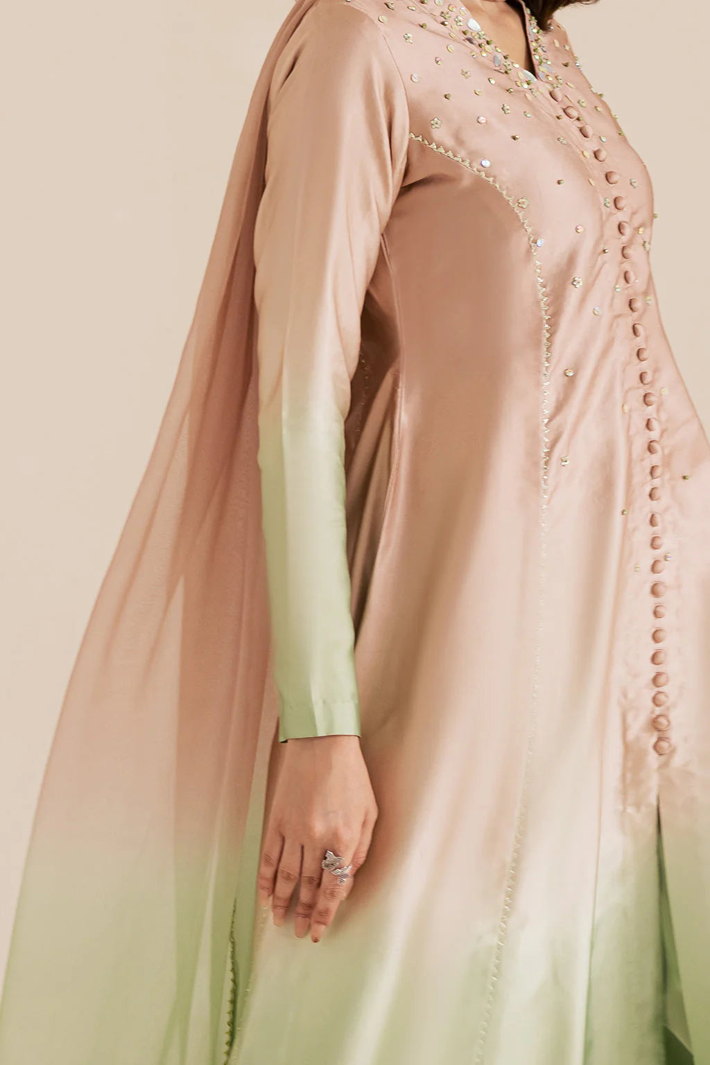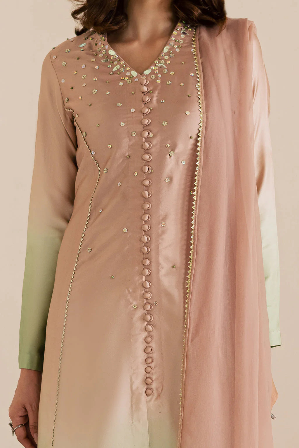 Embroidered and hand-embellished gradient silk shirt paired with sleek silk cigarette pants and a flowy chiffon dupatta,