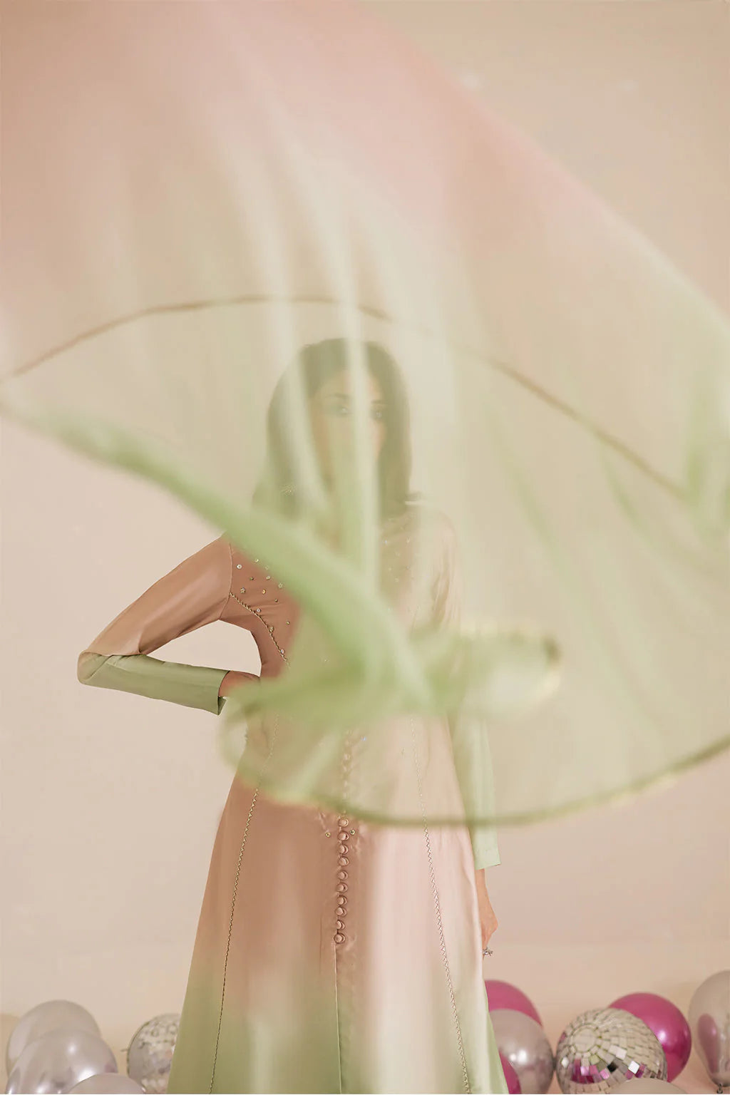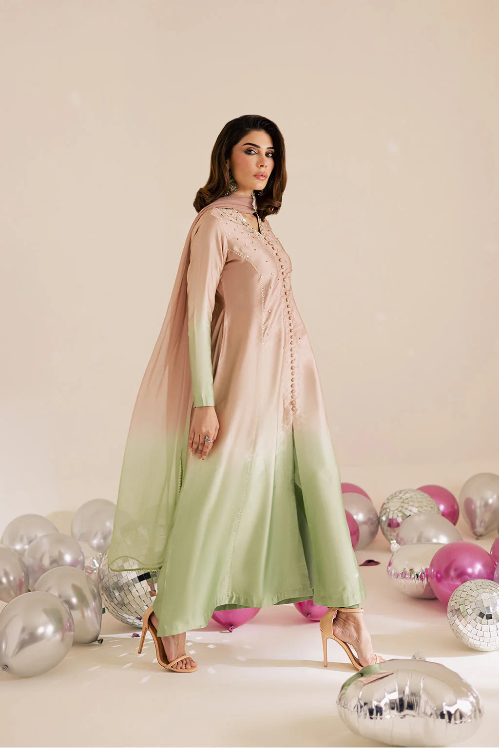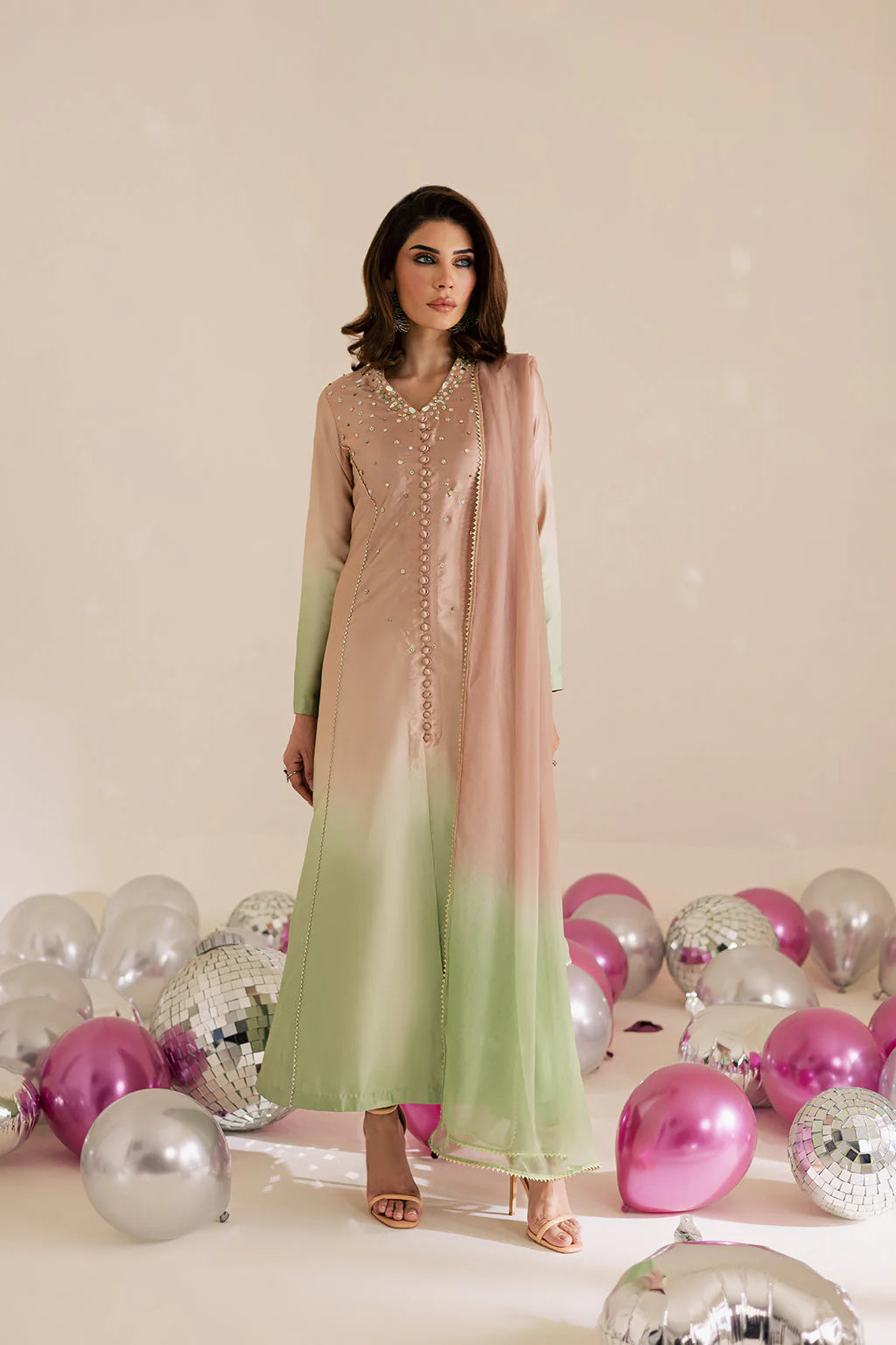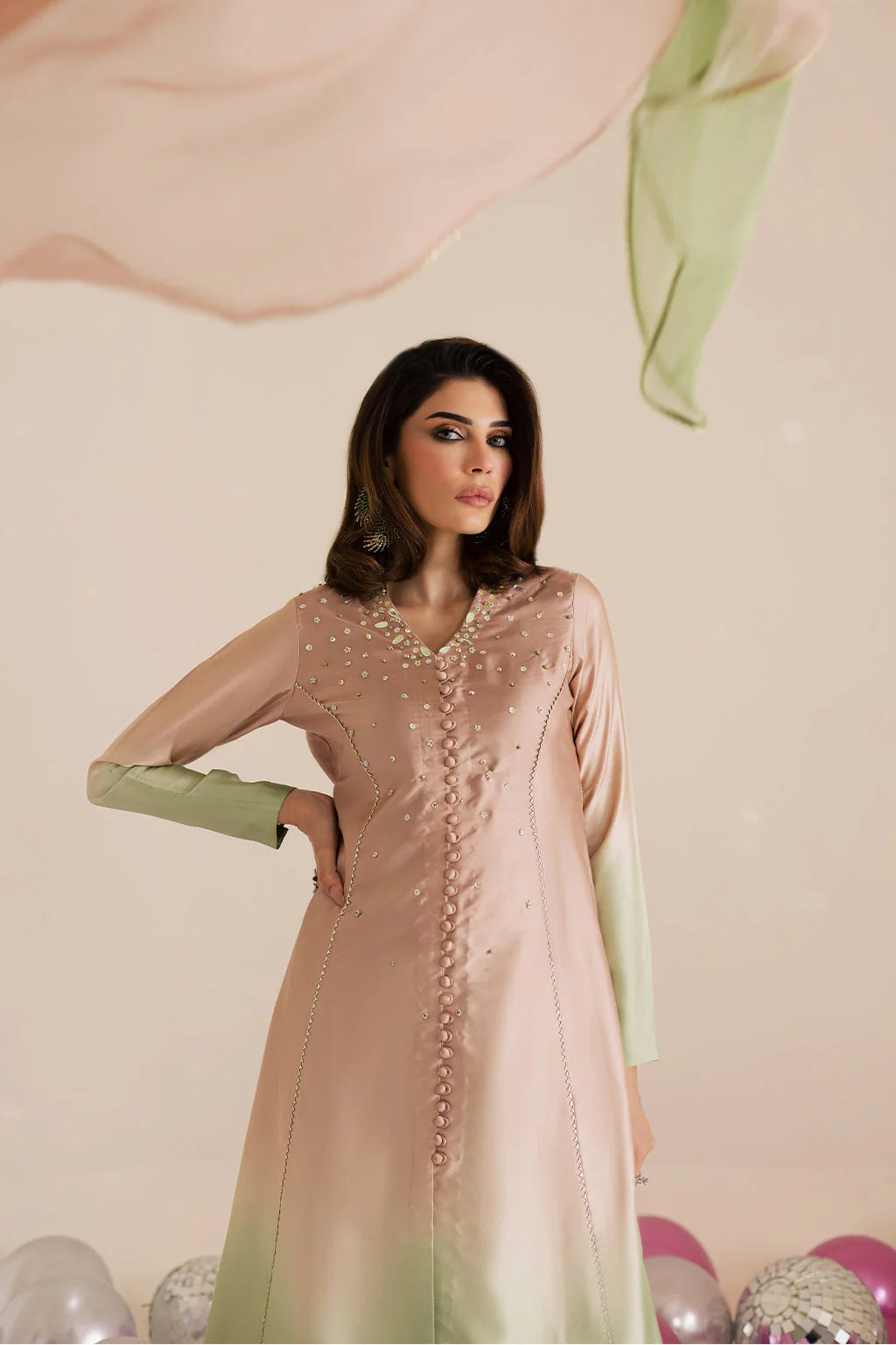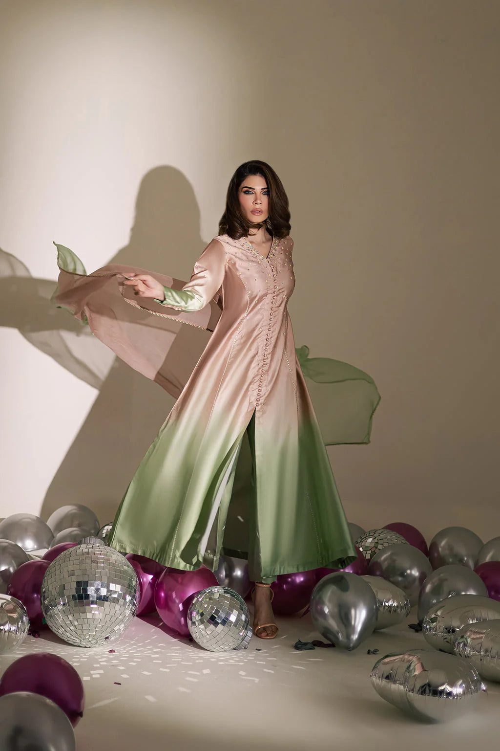 Embroidered and hand-embellished gradient silk shirt paired with sleek silk cigarette pants and a flowy chiffon dupatta,