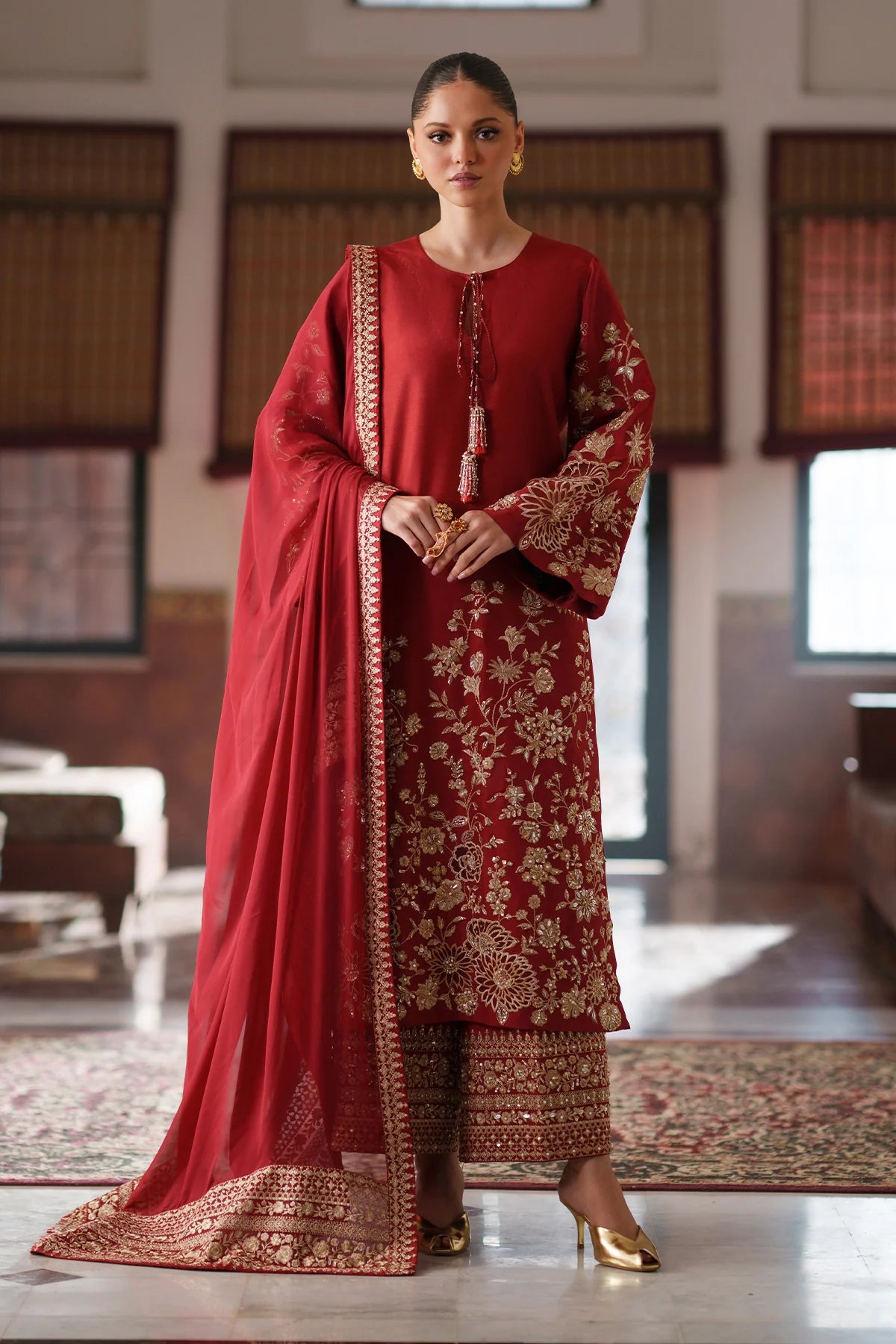 The Outfit features a Tassel silk shirt adorned with delicate hand-embellishment and sequin work, with tassel silk trouser with sequin borders and hand embellished borders paired with a chiffon dupatta featuring an embroidered pallu and refined borders. An elegant ensemble designed for timeless sophistication