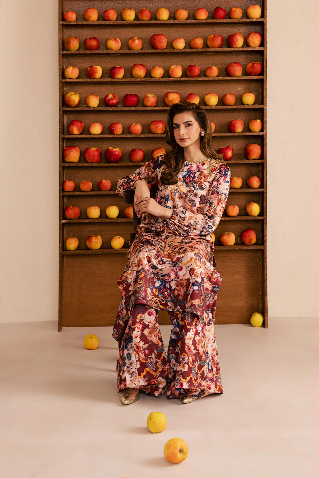 Crafted in a subtle antique-toned silk print, The shirt is delicately enhanced with hand embellishments along the neckline, adding a refined artisanal touch. Paired with matching printed silk bottoms and finished with a sheer Slik printed dupatta