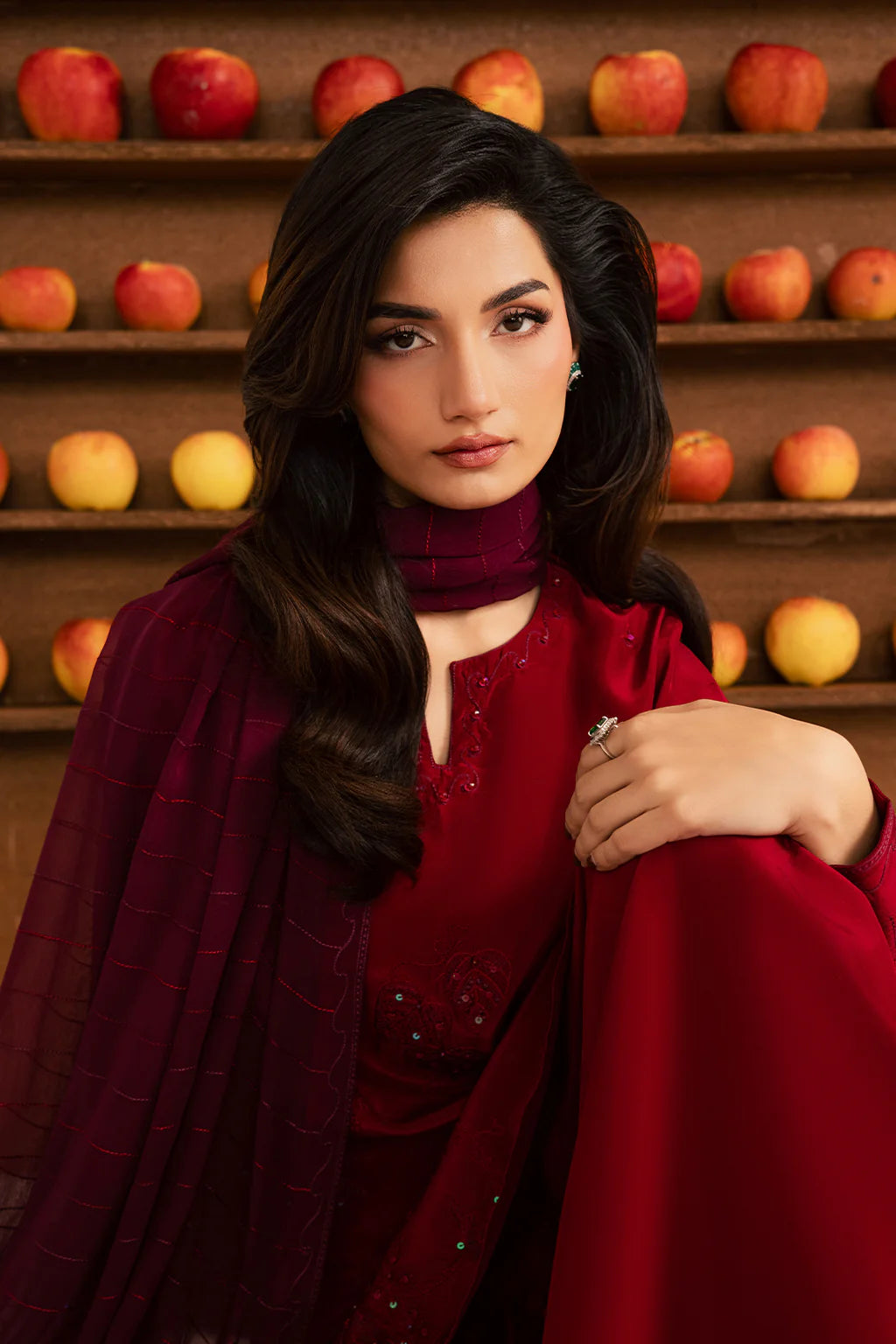 A very rich red colour design with a refined fusion of traditional silhouettes and modern embellishments. The clean cutline is elevated with subtle contemporary detailing, adding depth and sophistication to the design. Paired with a delicately embroidered chiffon dupatta