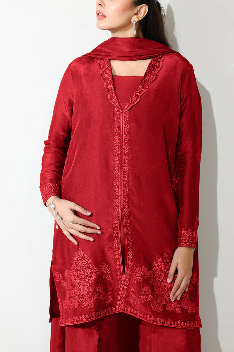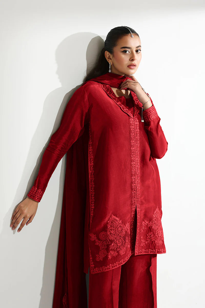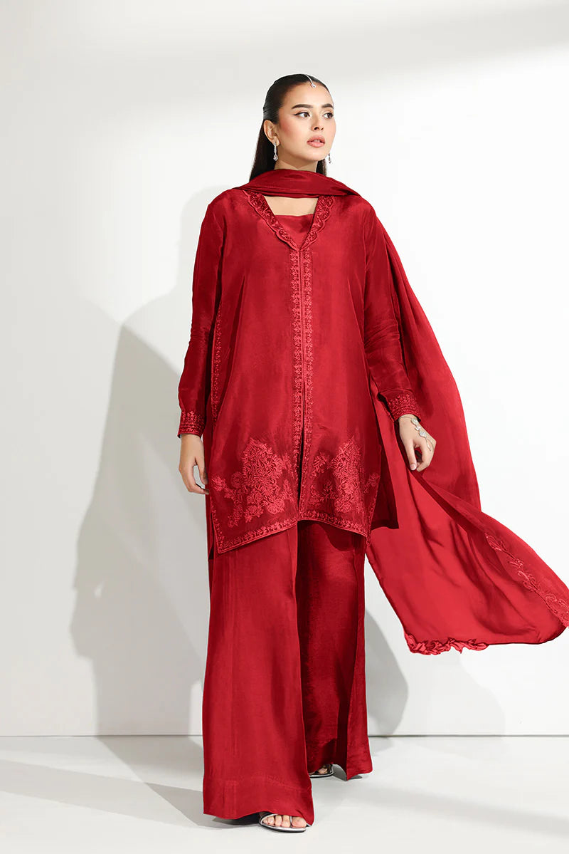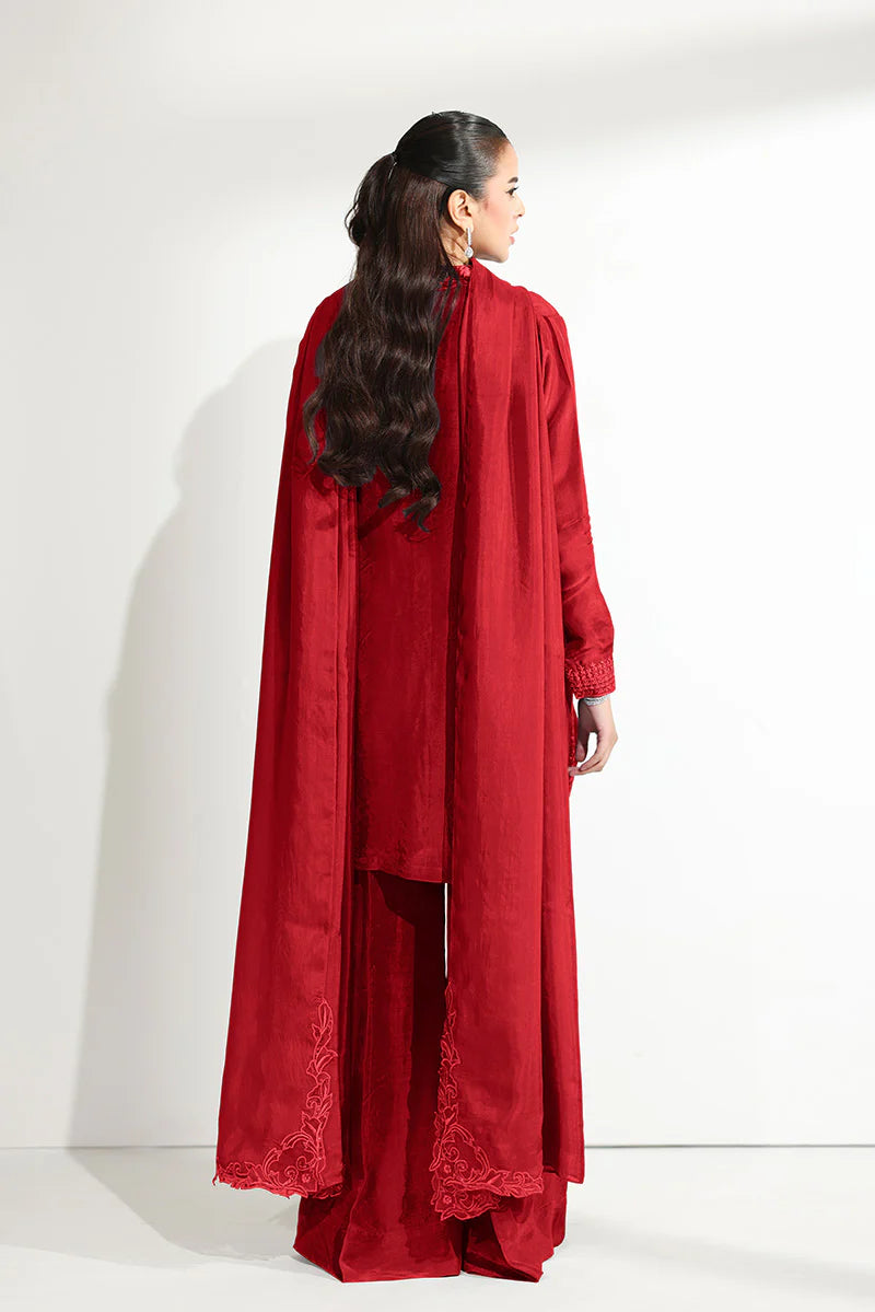 Elevated, luminous, and exquisitely detailed—this ensemble is a tribute to celebratory dressing. The embroidered front placket sets a refined tone, while the scalloped shawl collar, embellished with intricate embroidery and fine sequins, adds a soft yet striking highlight. Carefully placed corner motifs and a heavily detailed sequin hem enhance the richness of the shirt. The tapered sleeves, finished with embroidered cuffs, offer a clean and structured elegance. The look is completed with floor-length flared pants that flow gracefully with every step, paired with a medium silk dupatta featuring heavily embroidered border patches for a majestic finish. Ideal for Eid festivities, formal dinners, and wedding celebrations, this ensemble embodies effortless opulence.