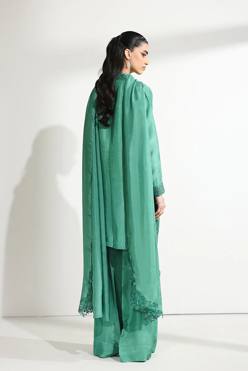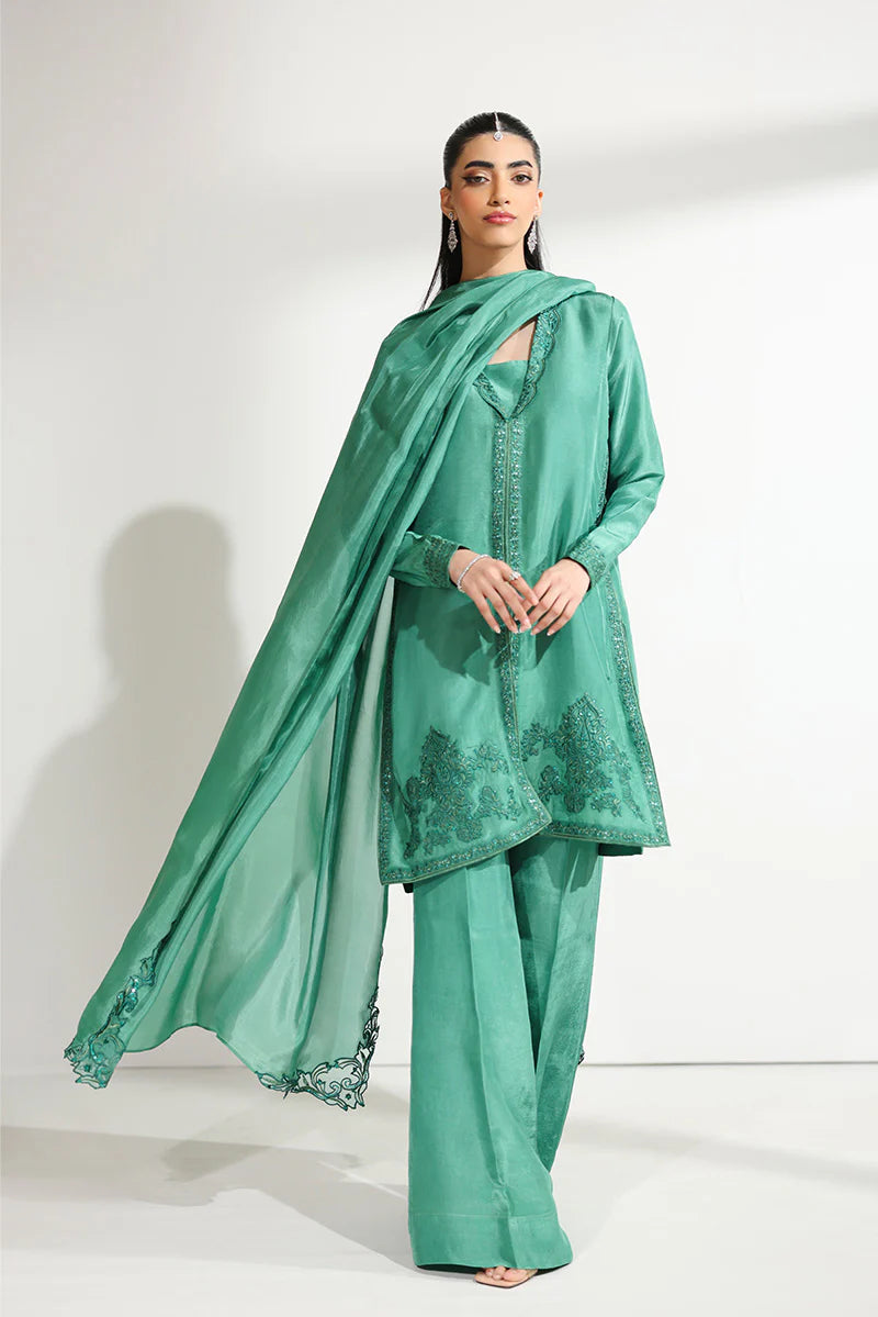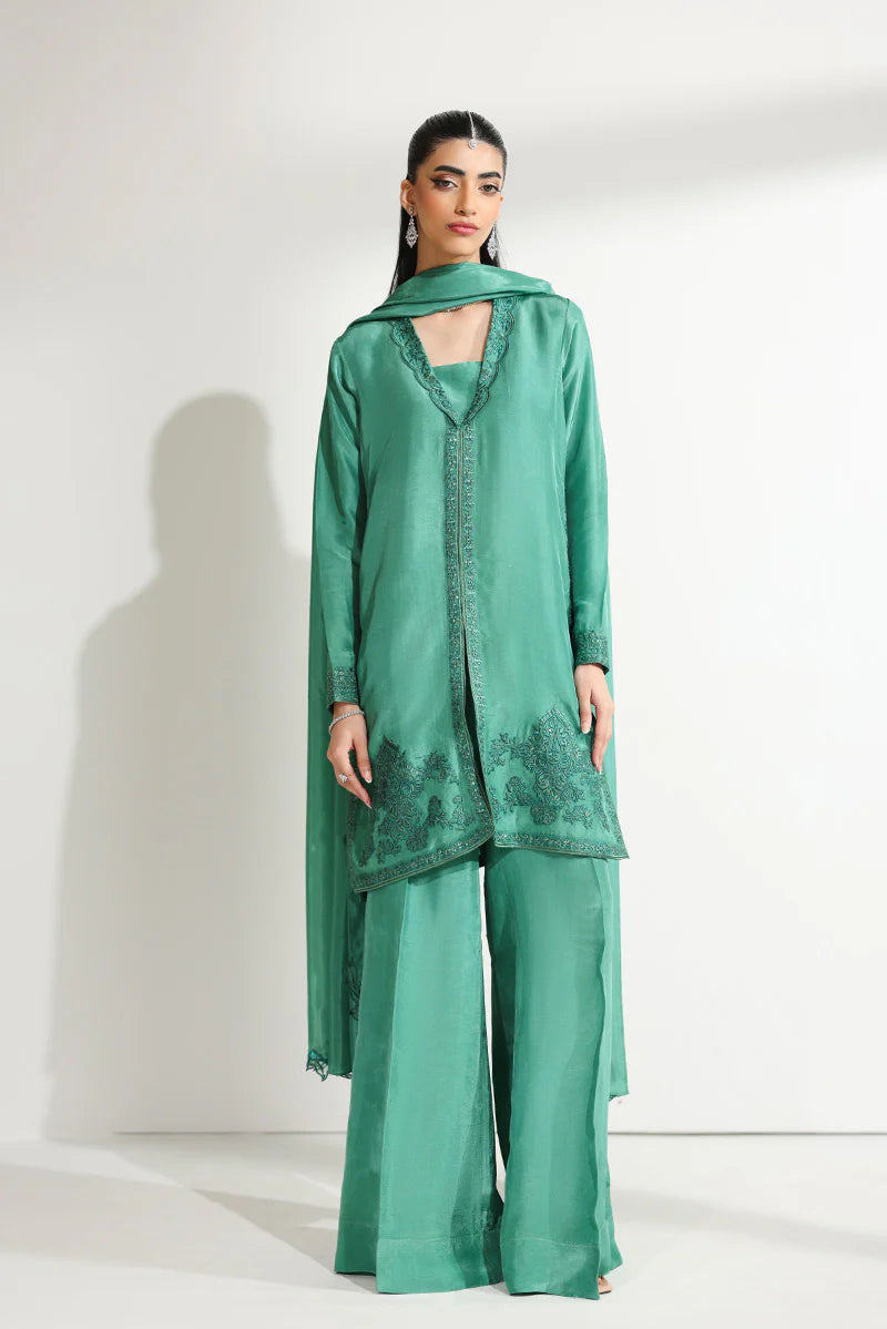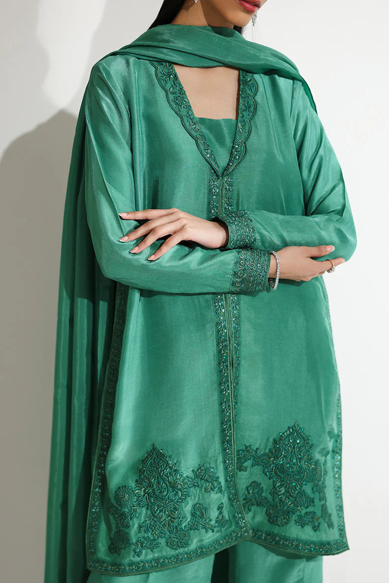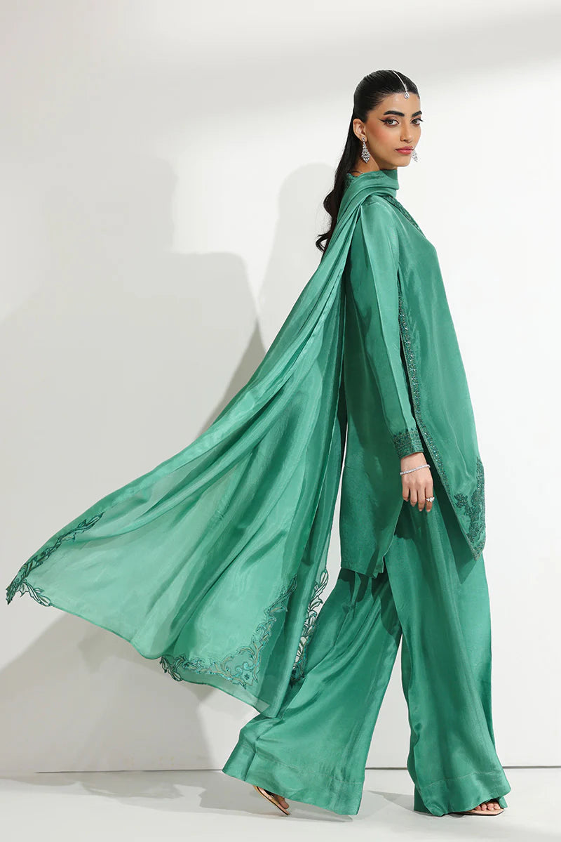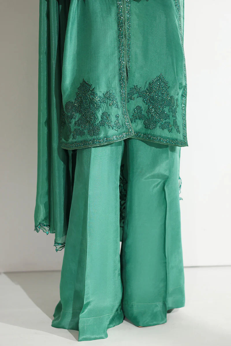 A vision of festive grandeur, this ensemble is thoughtfully designed for moments that deserve nothing less than extraordinary. The short shirt is beautifully structured with a meticulously embroidered front placket, drawing attention to the artistry of the craftsmanship. The shawl collar, finished with a delicate scalloped border, is adorned with intricate embroidery and glistening sequin work that subtly catches the light. Fine embroidered corner motifs frame the silhouette, while the hem is enhanced with detailed sequin embellishments, adding dimension and richness. Tapered sleeves, finished with embroidered cuffs, lend a tailored yet graceful appeal. It is paired with dramatic floor-length flared pants alongside a medium silk dupatta featuring heavily embroidered border patches that complete the look with regal finesse—perfect for Eid festivities, wedding soirées, and formal evenings alike.