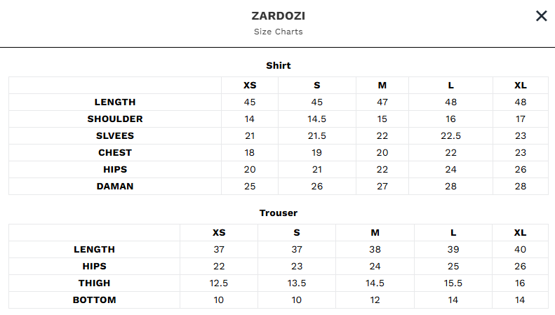 * Always check the Brand size guide in image slideshow of each item as every ready to wear item has its own size guide to be followed.