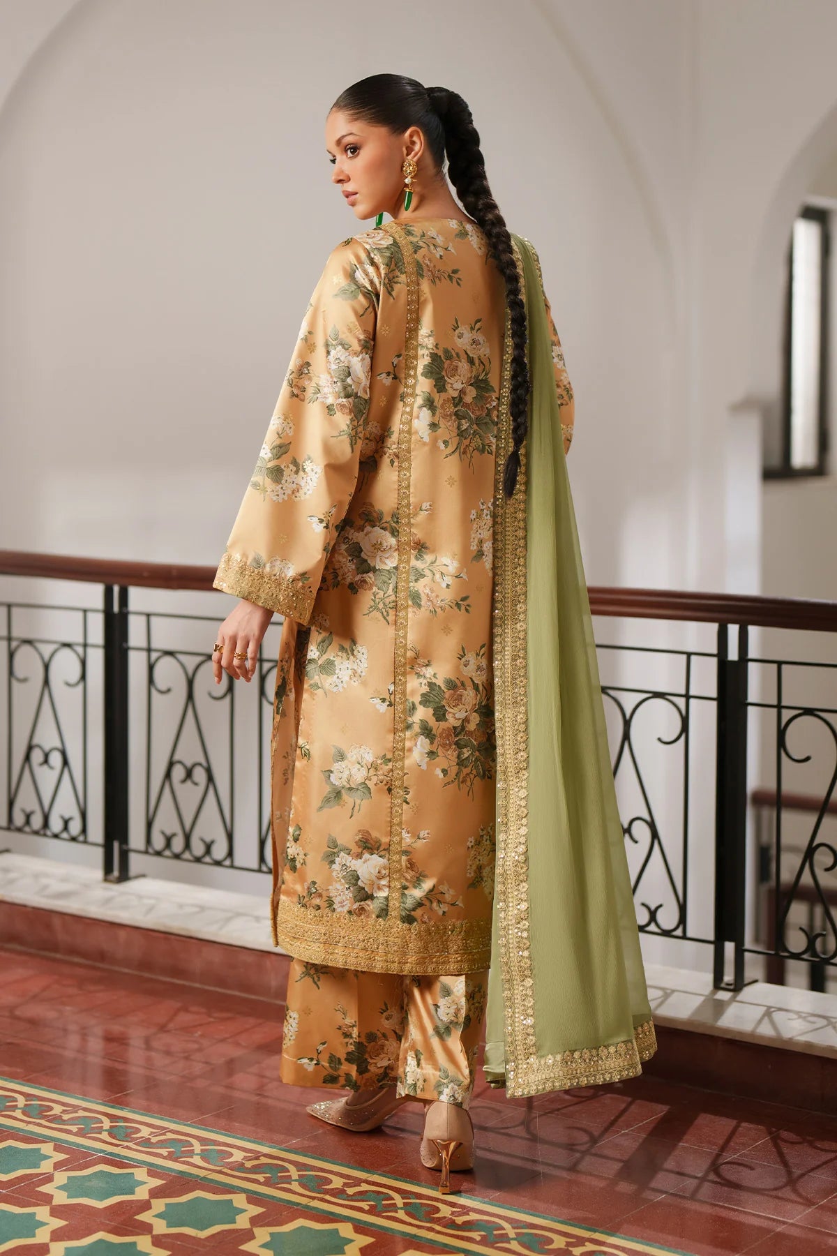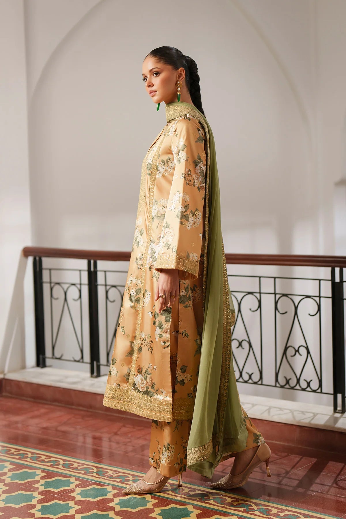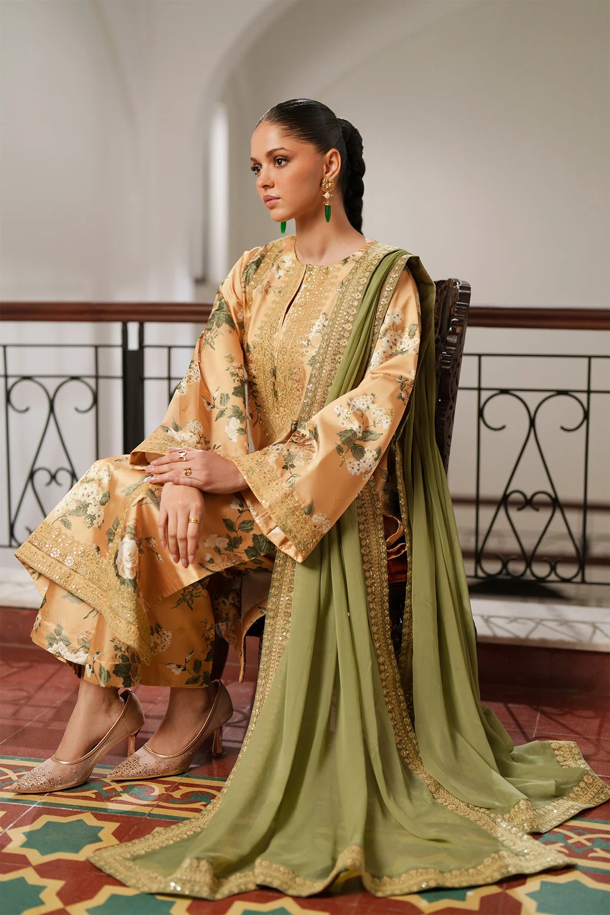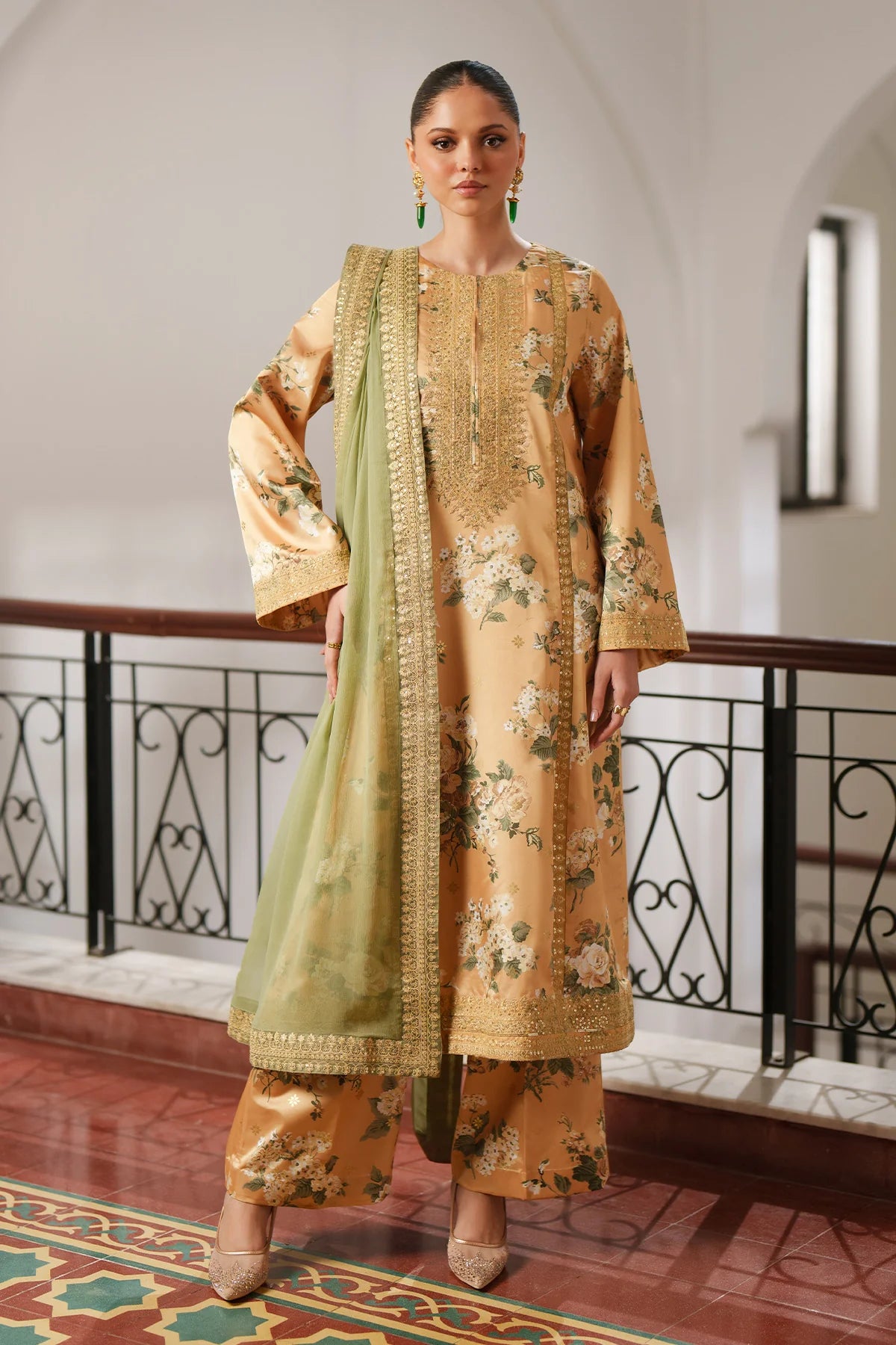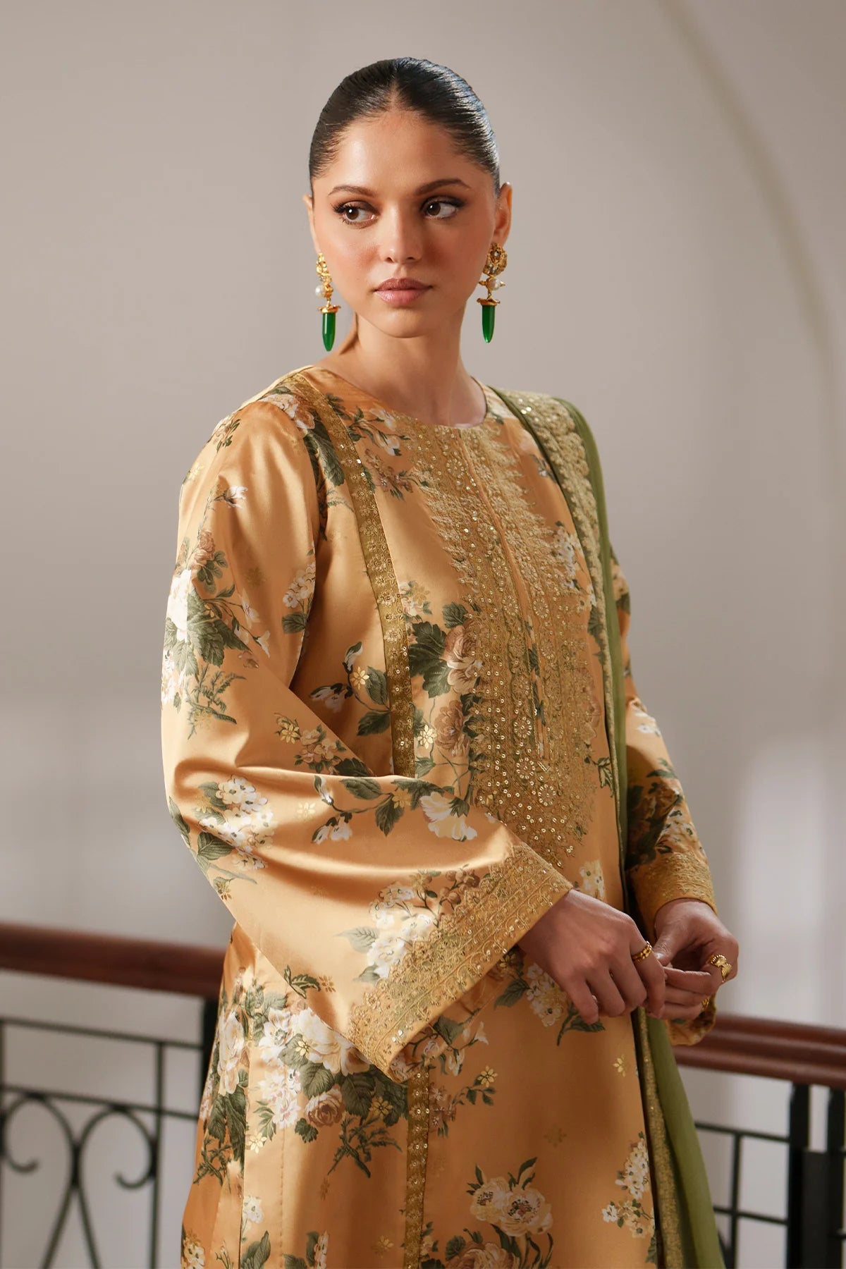 Outfit features sequin embroidered neckline and borders on a Printed Charmeuse Silk , paired with charmeuse silk trouser and finished with a contrast chiffon dupatta detailed with sequin embroidered borders for refined elegance.