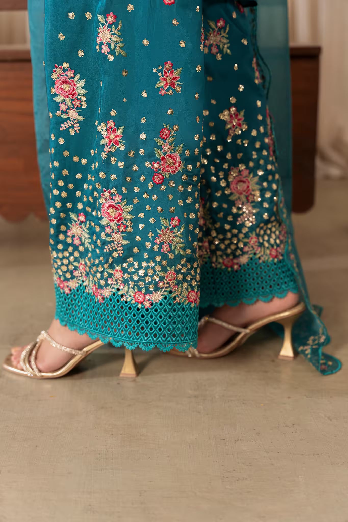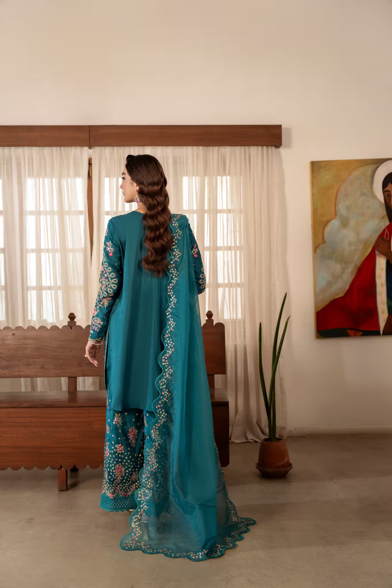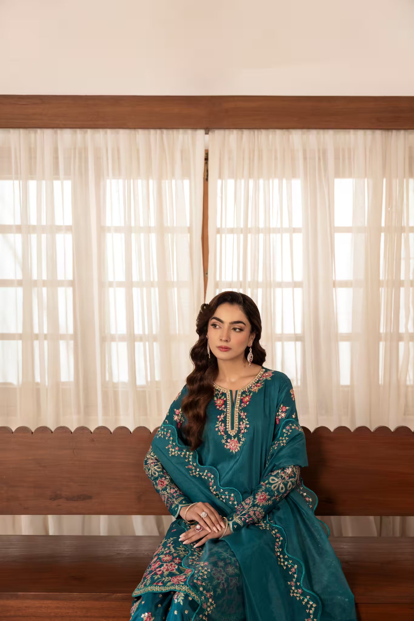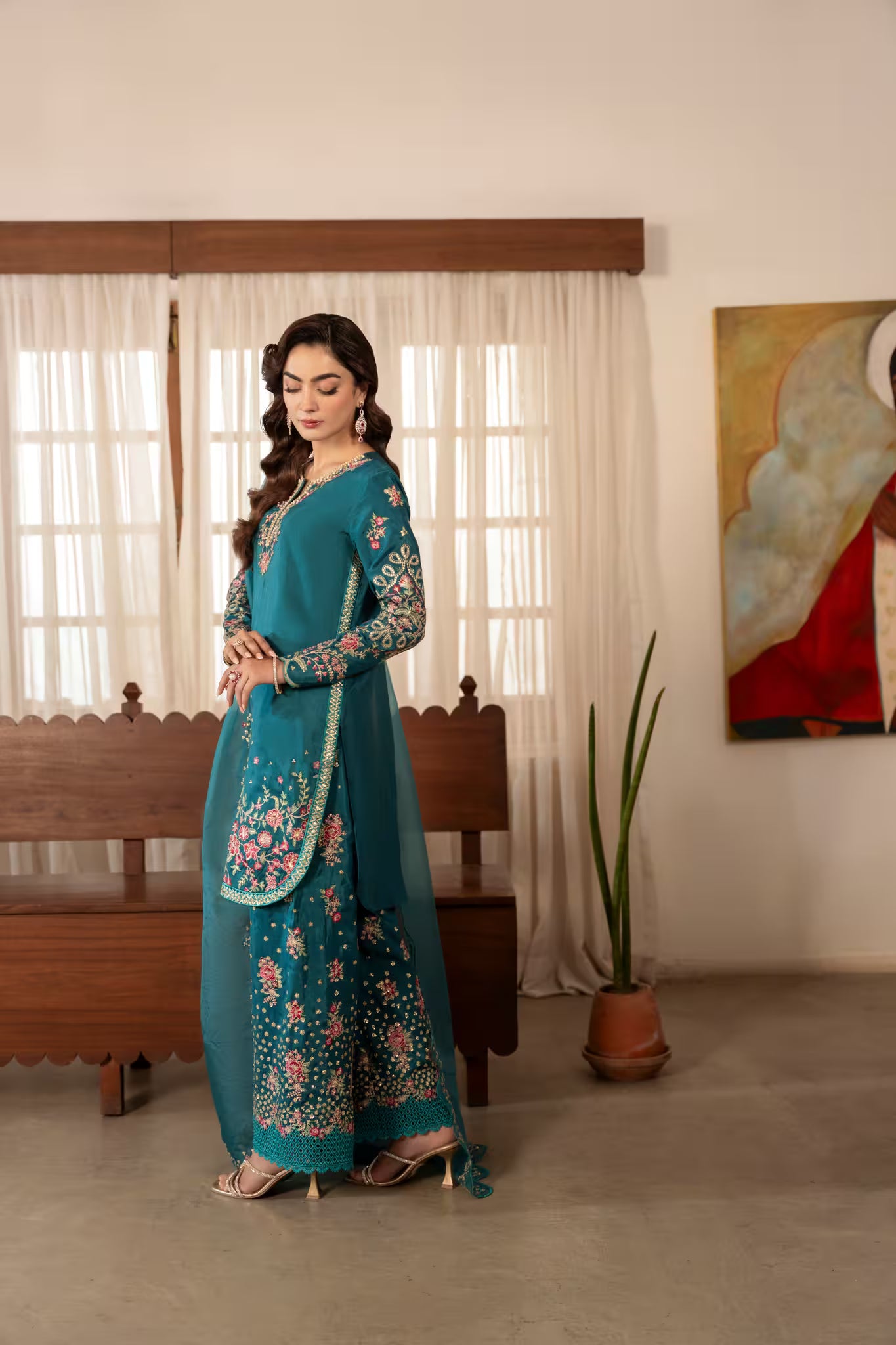 Completed with an organza dupatta featuring scalloped, sequin-embroidered borders — ZOE is a graceful ensemble that brings timeless charm and vibrant sophistication.